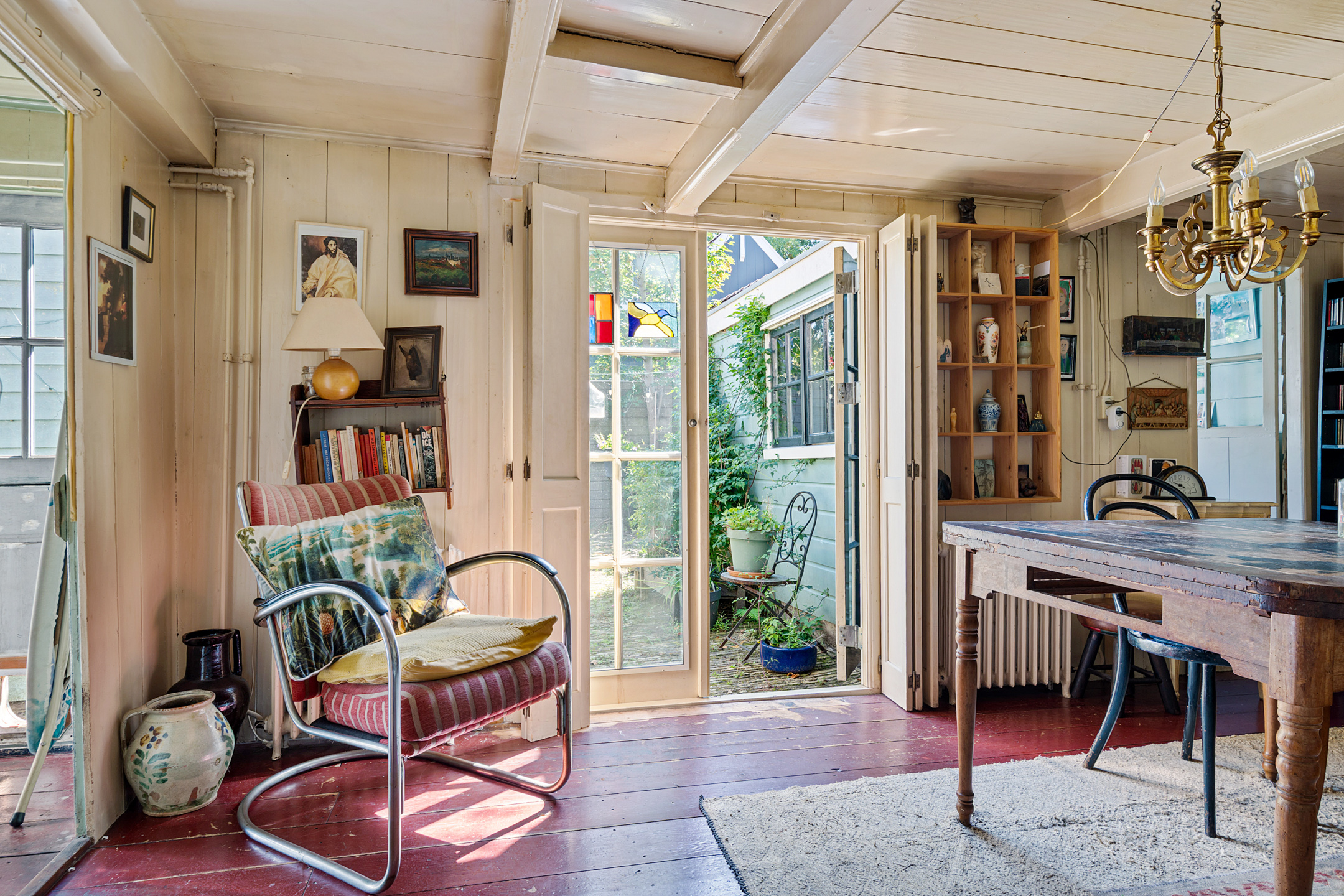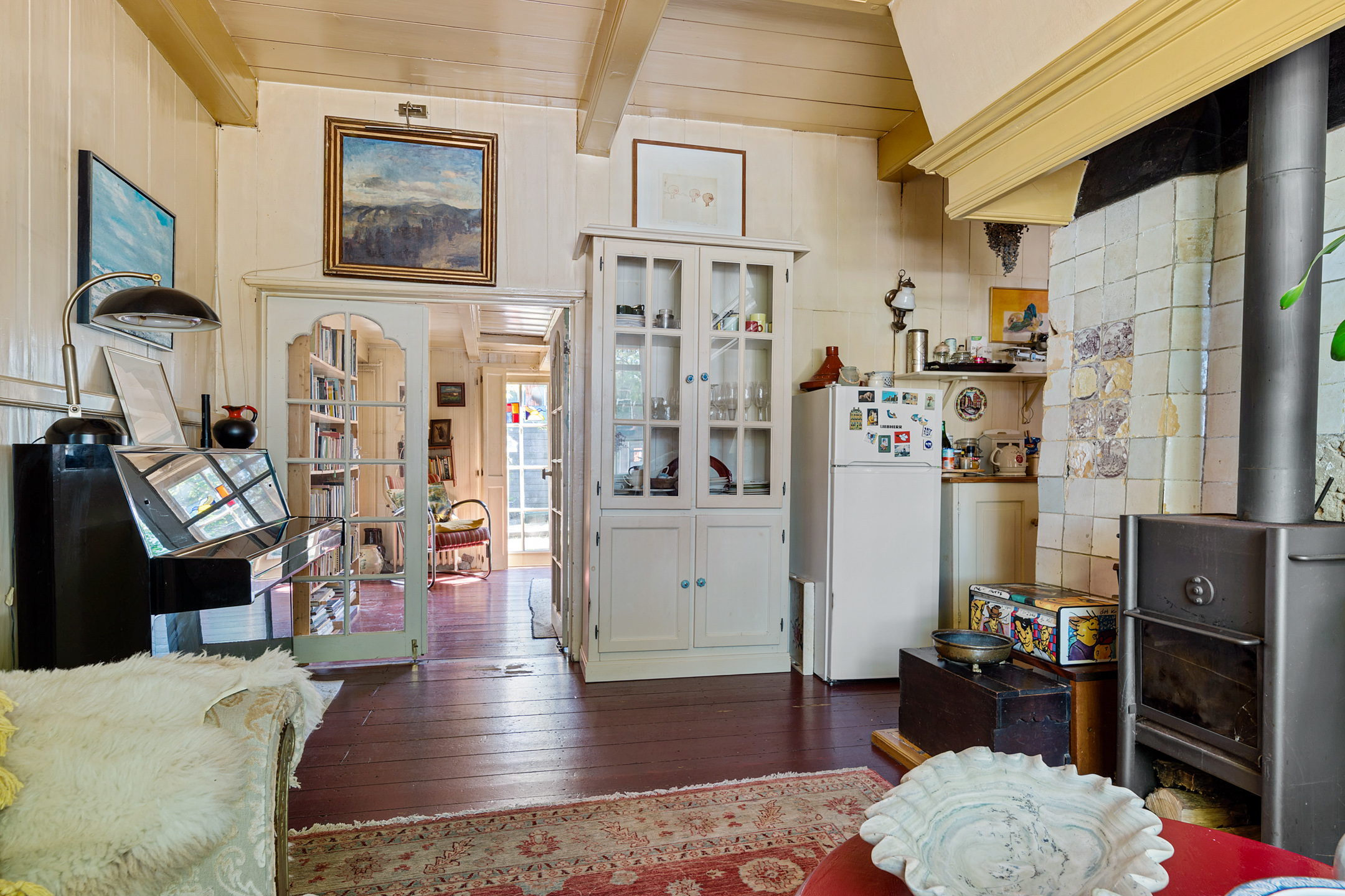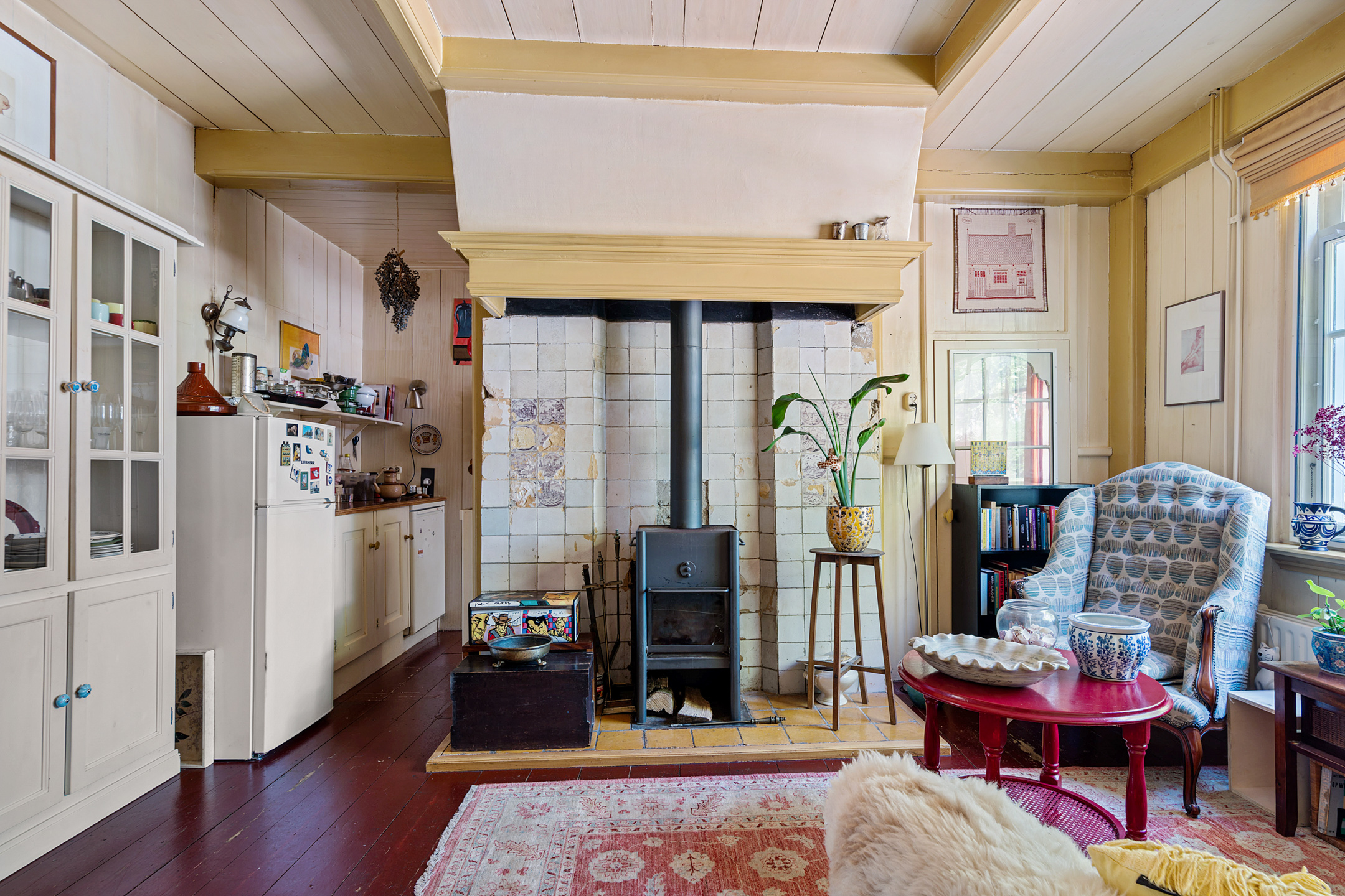 In de woonkamer trekt de grote schouw met houtkachel direct de aandacht. Verder zie je een opvallend hoog balkenplafond, houten wanden en ook hier is de houten vloer donkerrood geschilderd. Achter de dubbele deuren is de eetkamer, met openslaande deuren naar de tuin. Met een oppervlakte van circa 32 m2 bieden de woon- en eetkamer verrassend veel ruimte.