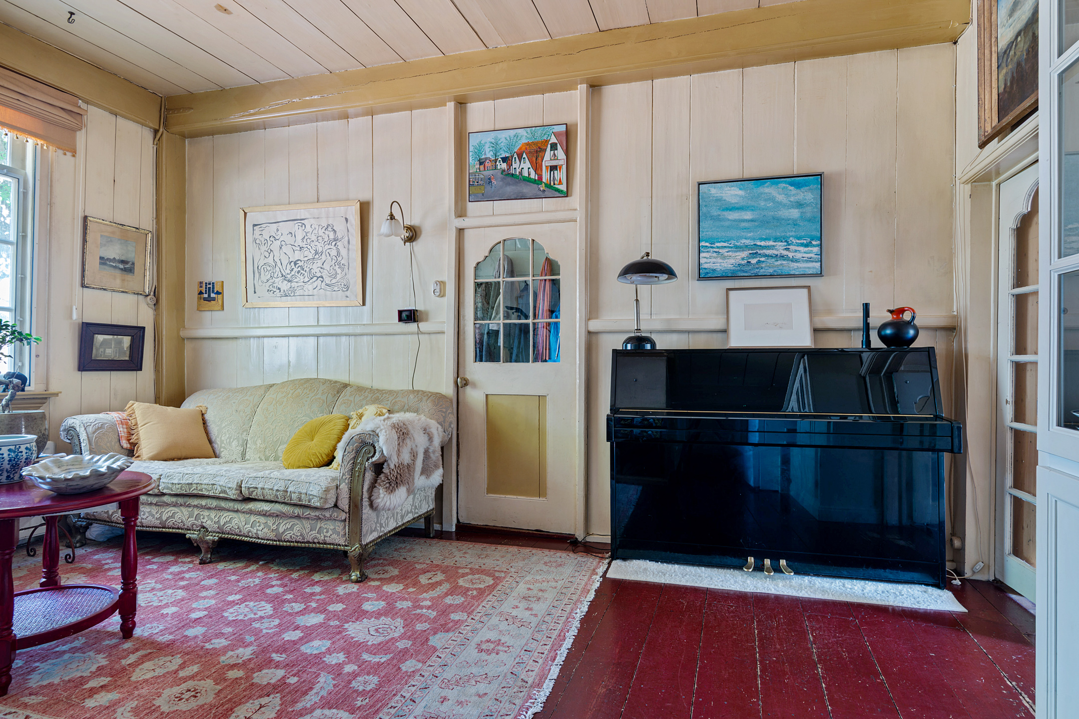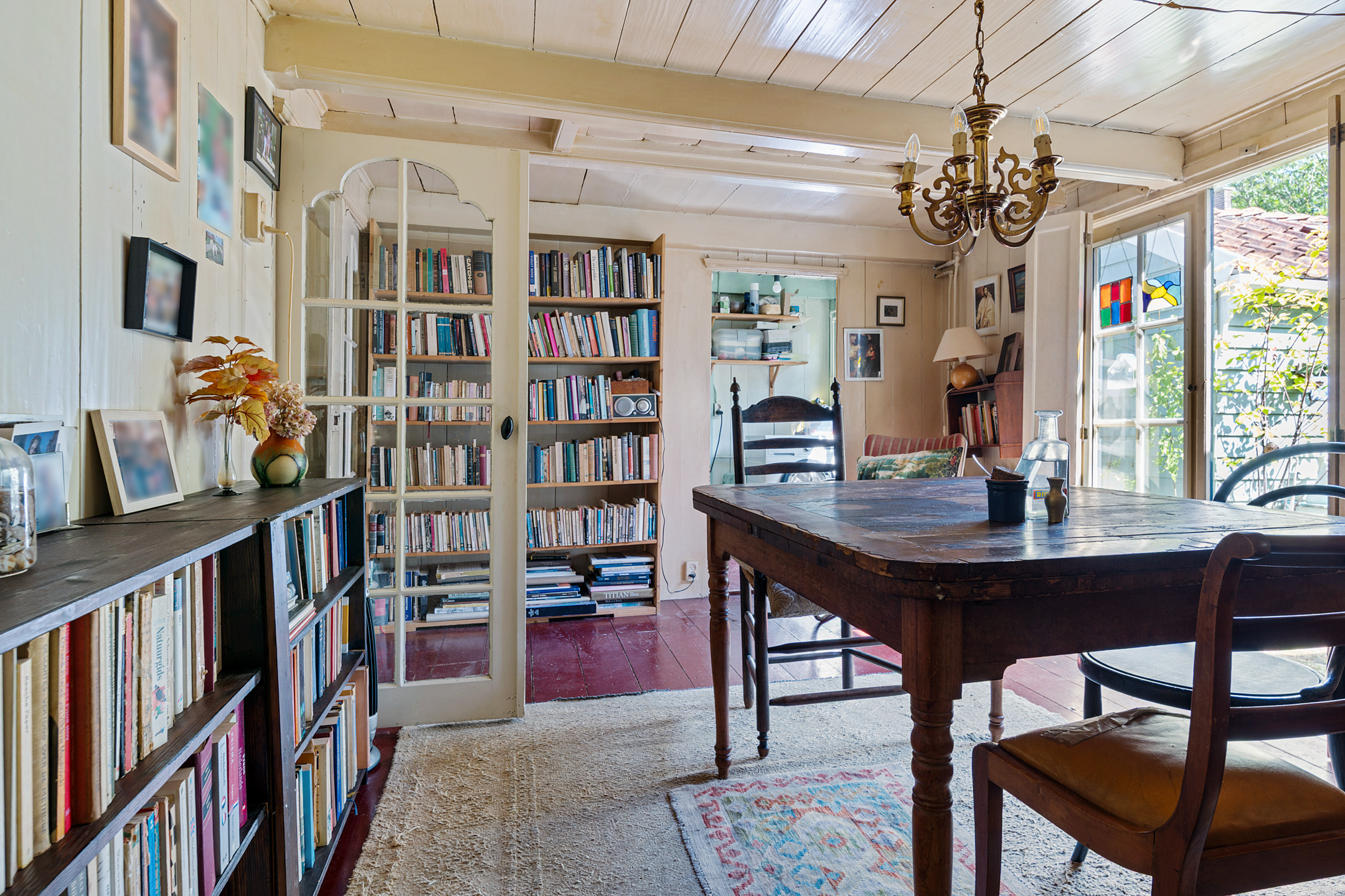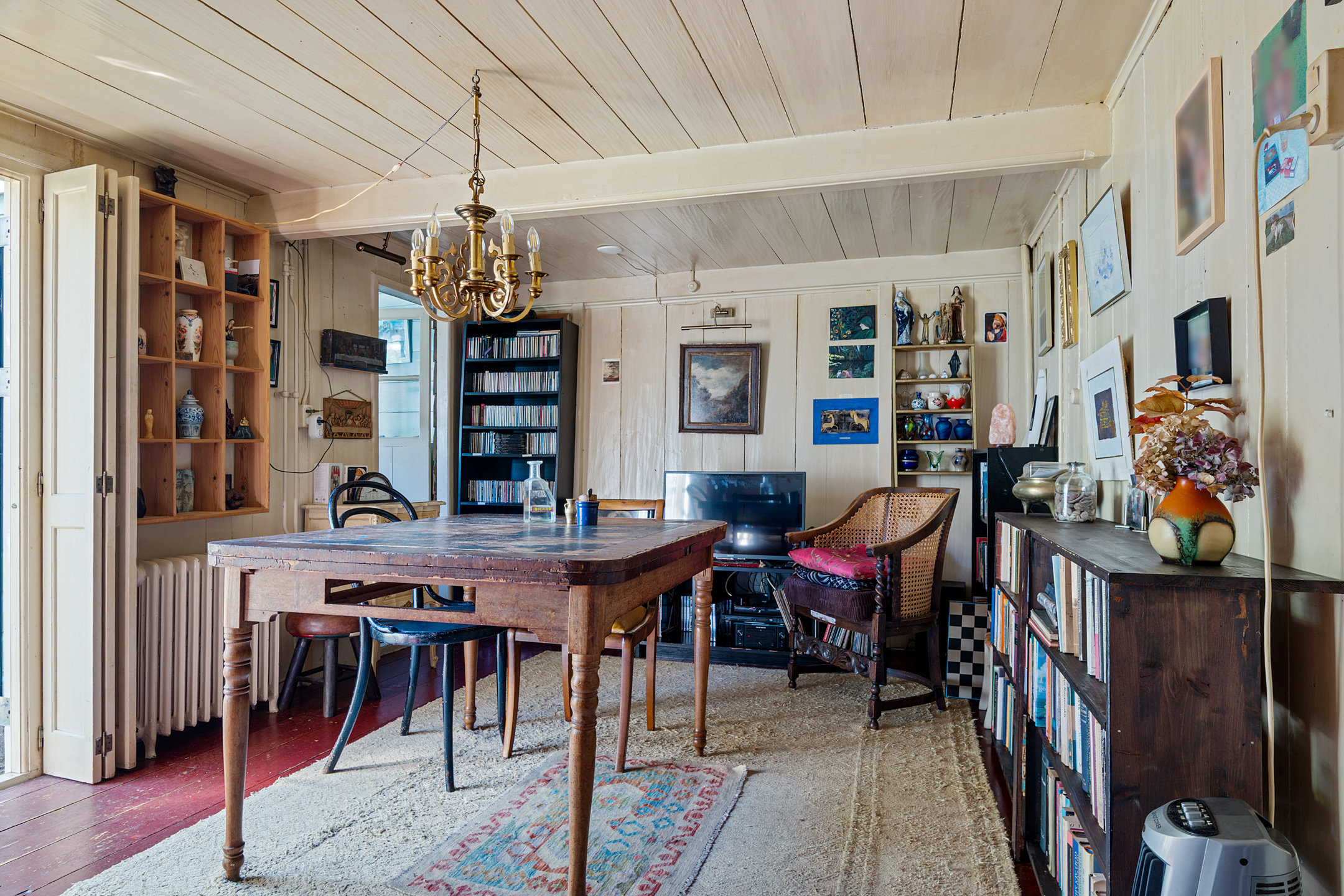 In de woonkamer trekt de grote schouw met houtkachel direct de aandacht. Verder zie je een opvallend hoog balkenplafond, houten wanden en ook hier is de houten vloer donkerrood geschilderd. Achter de dubbele deuren is de eetkamer, met openslaande deuren naar de tuin. Met een oppervlakte van circa 32 m2 bieden de woon- en eetkamer verrassend veel ruimte.