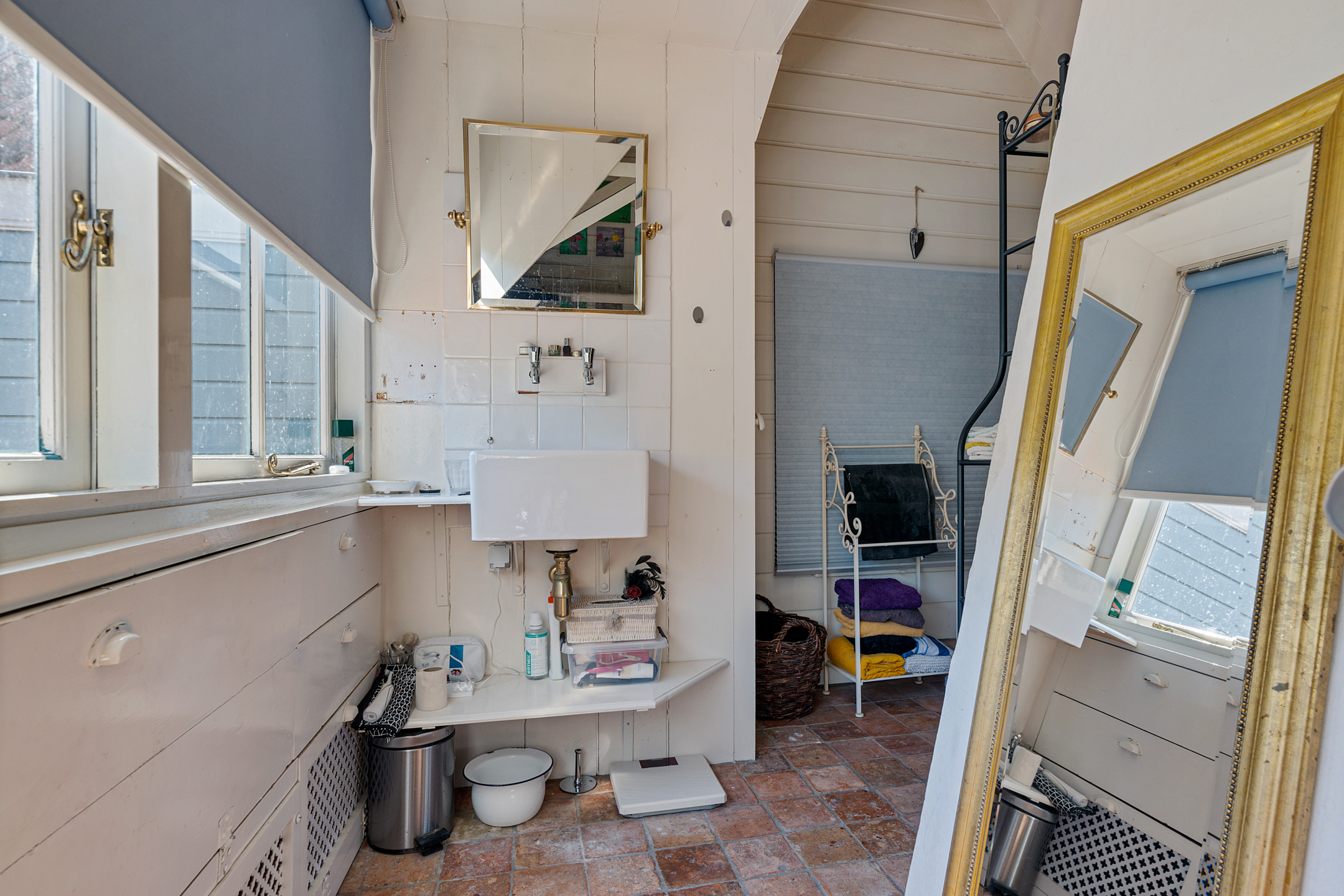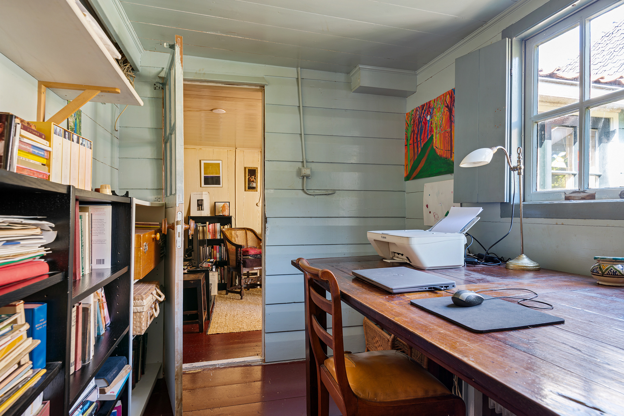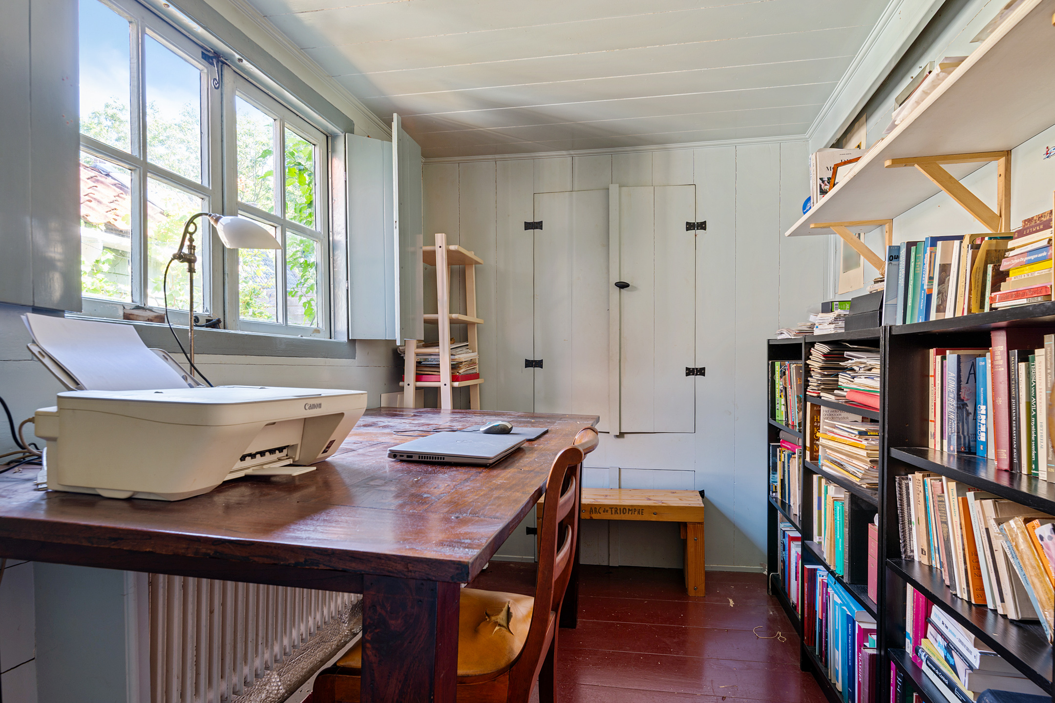 Ook is er op de begane grond een bijkeuken/wasruimte, waardoor de wasmachine en eventuele droger niet in de keuken of badkamer hoeven te staan. Verrassend is dat er ook een slaap-/werkkamer op de begane grond is, met charmante raamluiken. Stel je voor dat dit je thuiswerkplek is…