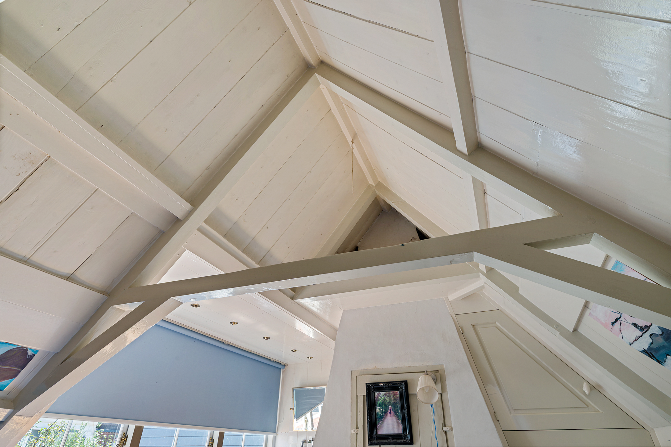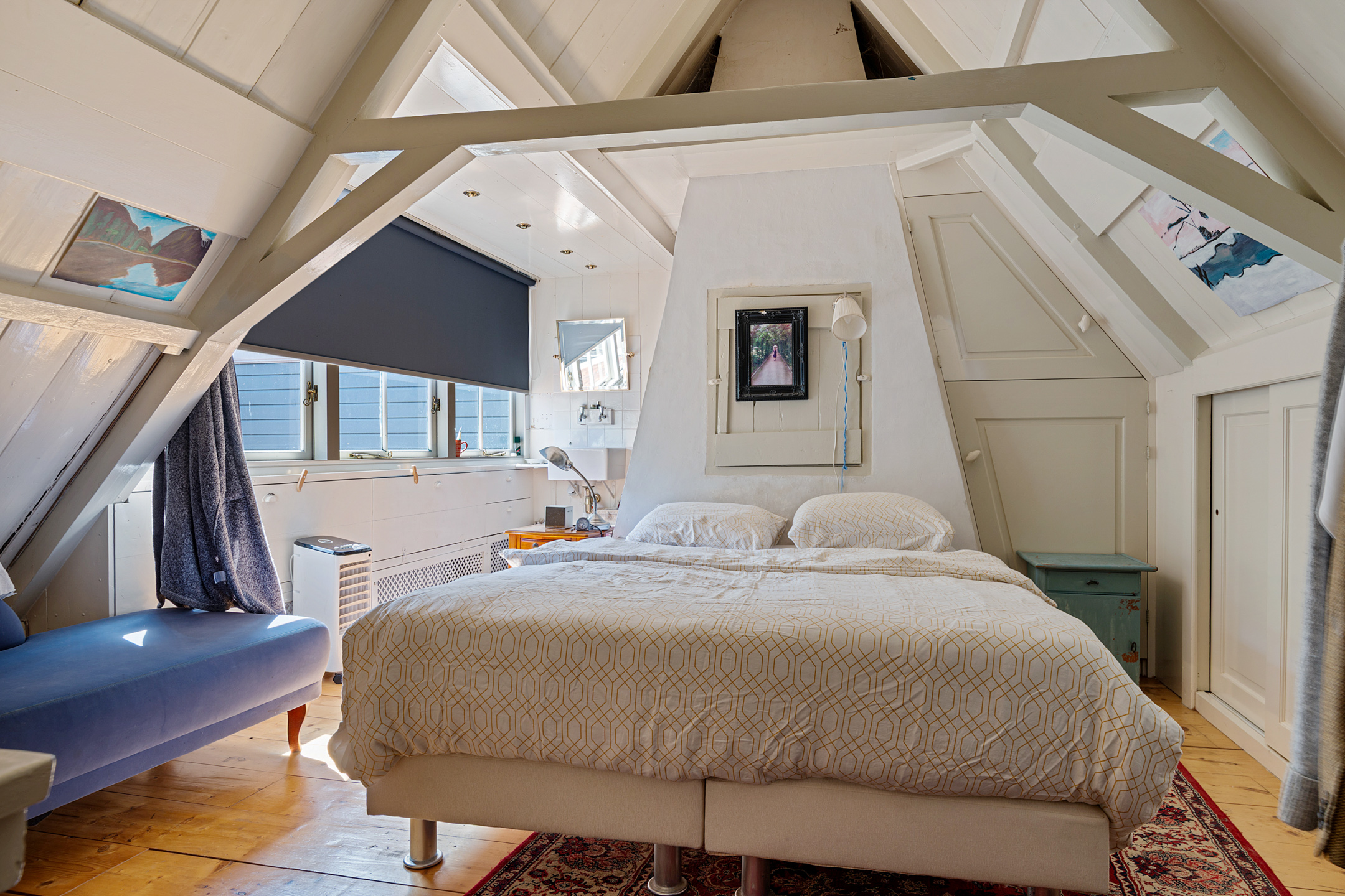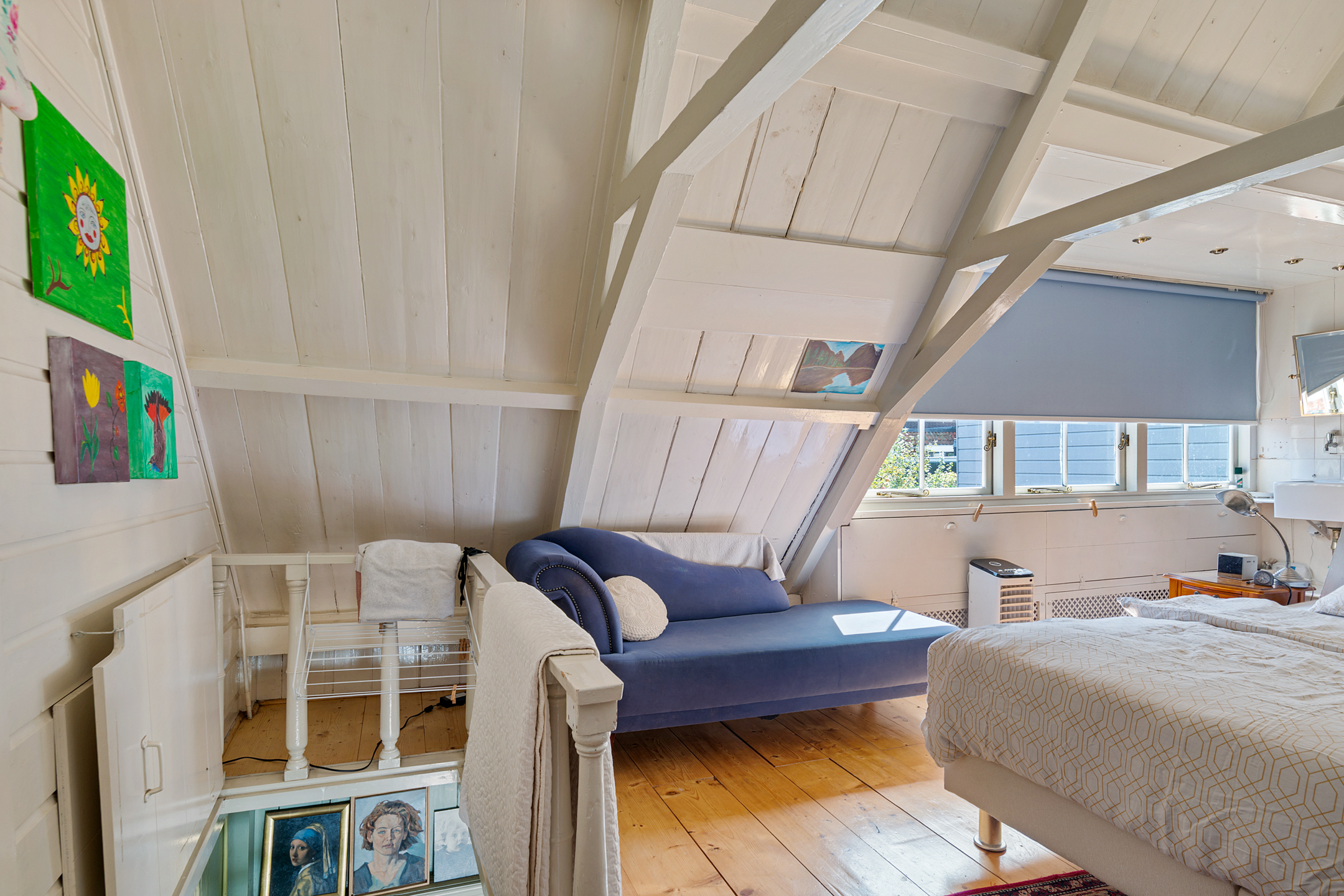 Ook is er op de begane grond een bijkeuken/wasruimte, waardoor de wasmachine en eventuele droger niet in de keuken of badkamer hoeven te staan. Verrassend is dat er ook een slaap-/werkkamer op de begane grond is, met charmante raamluiken. Stel je voor dat dit je thuiswerkplek is…