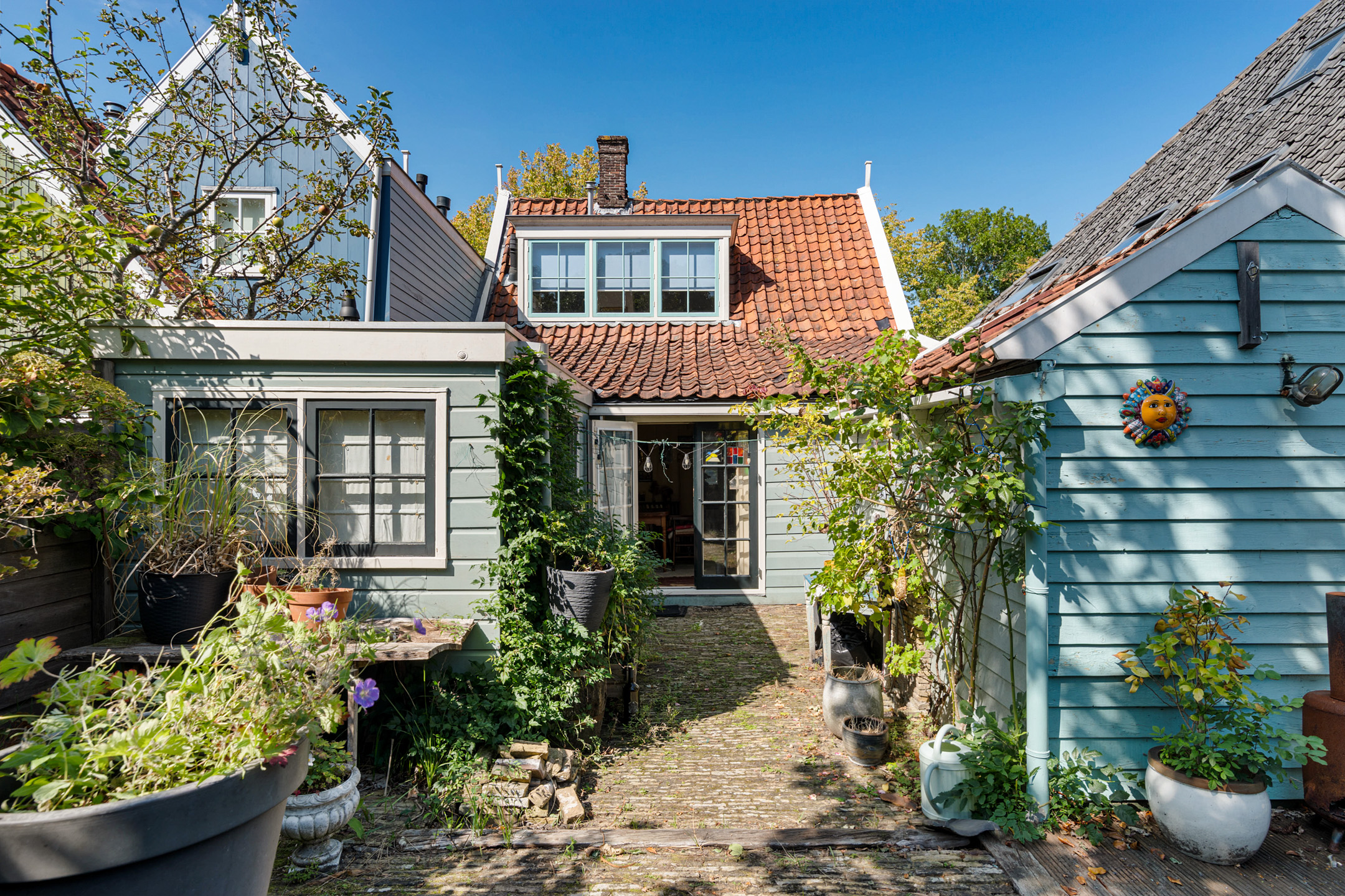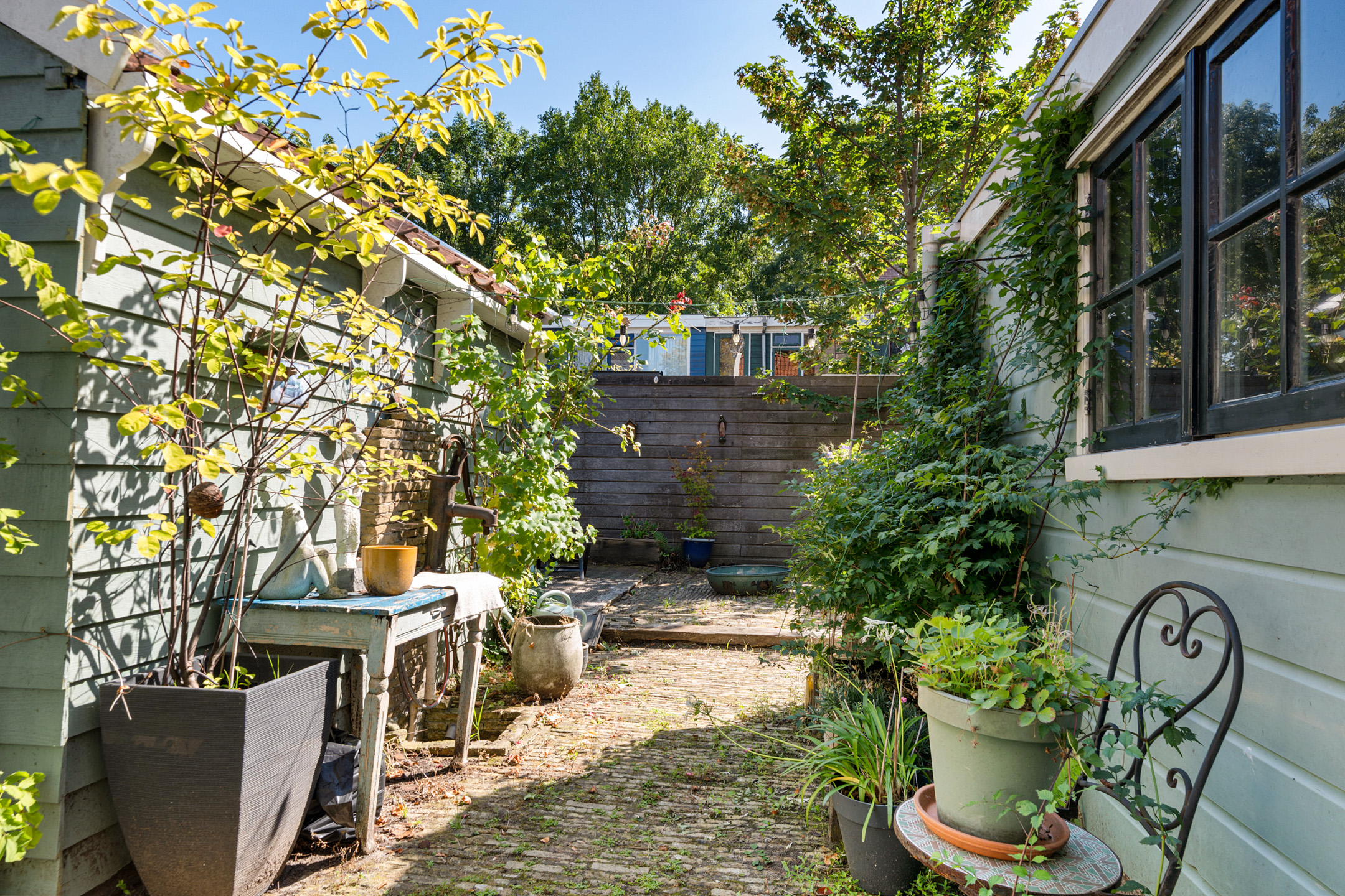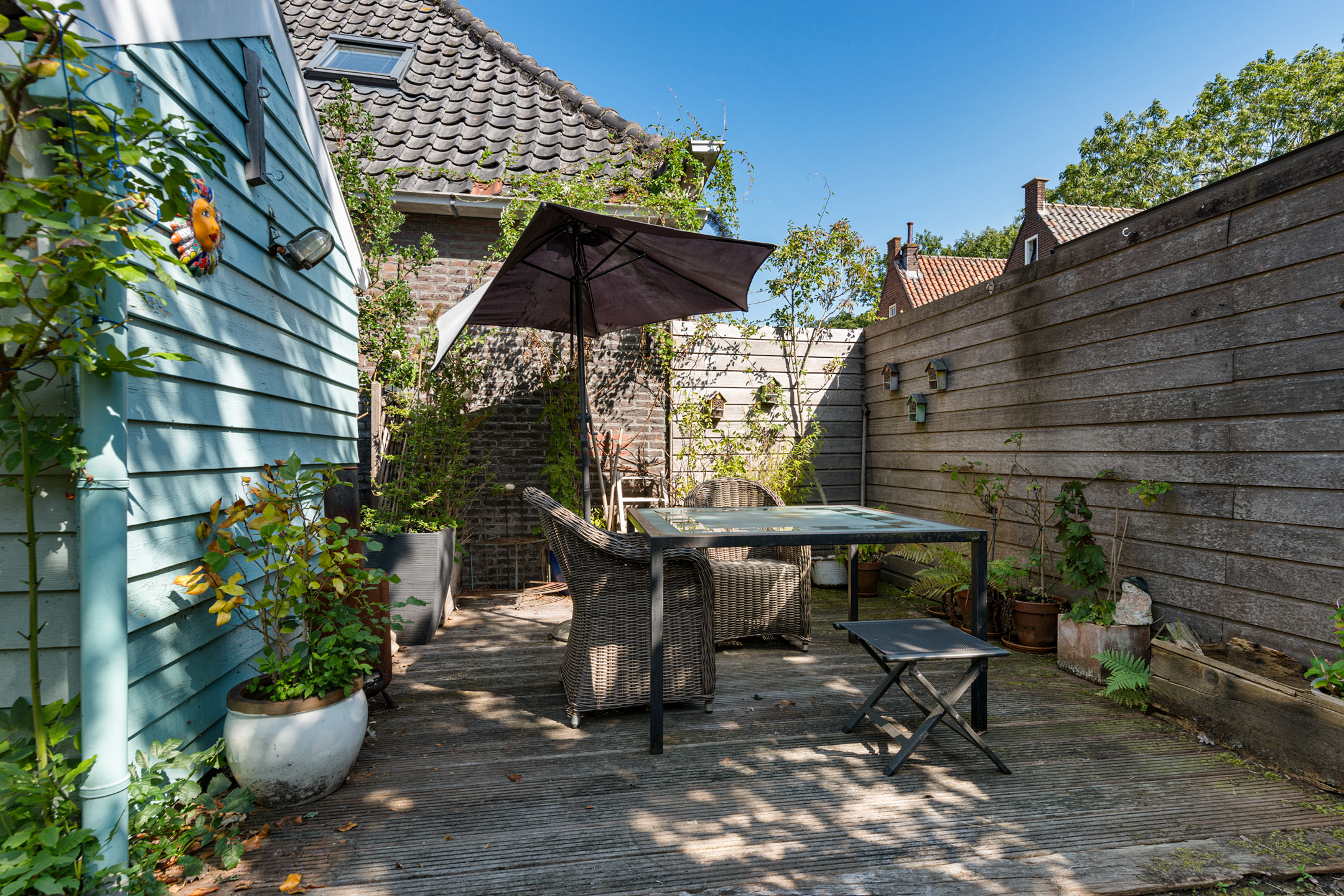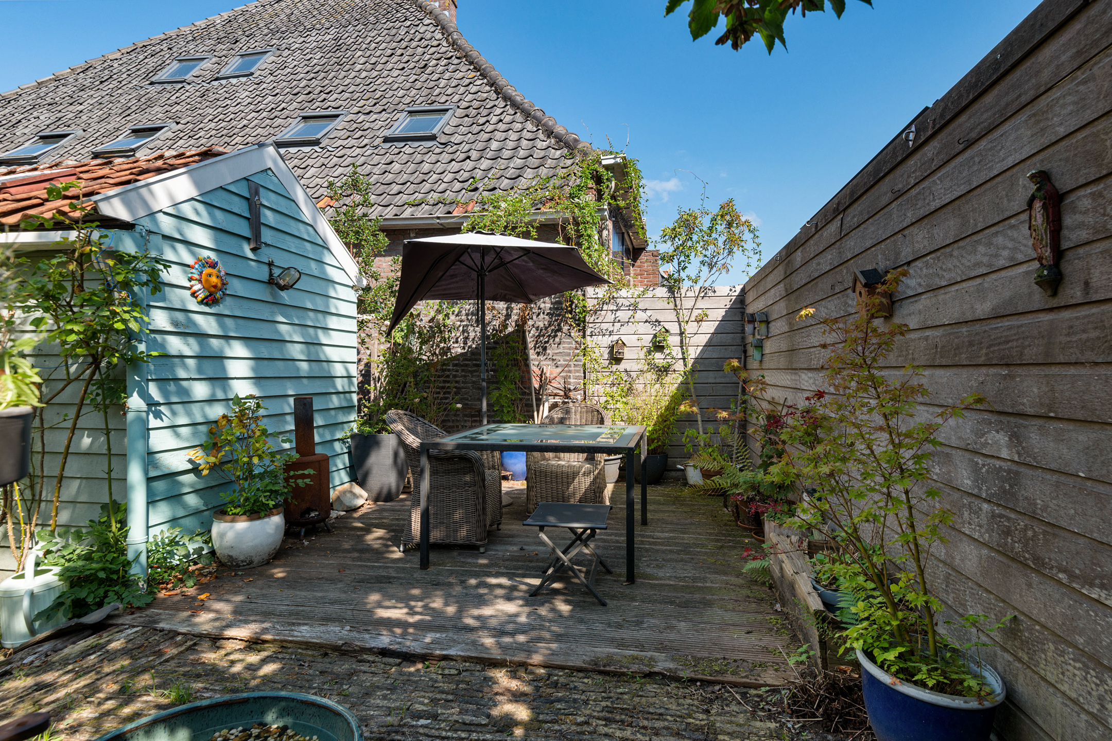 Een oase van groen en rust, zo kan de sfeervolle tuin op het zuiden gerust genoemd worden. Ten opzichte van omliggende woningen is er verrassend veel privacy, en het tuinhuis biedt handige bergruimte. De tuin biedt zowel zon als schaduw, en heeft meerdere plekken om lekker buiten te zitten. En er is een eigen, overdekte achterom waardoor de fiets niet op straat hoeft te staan.