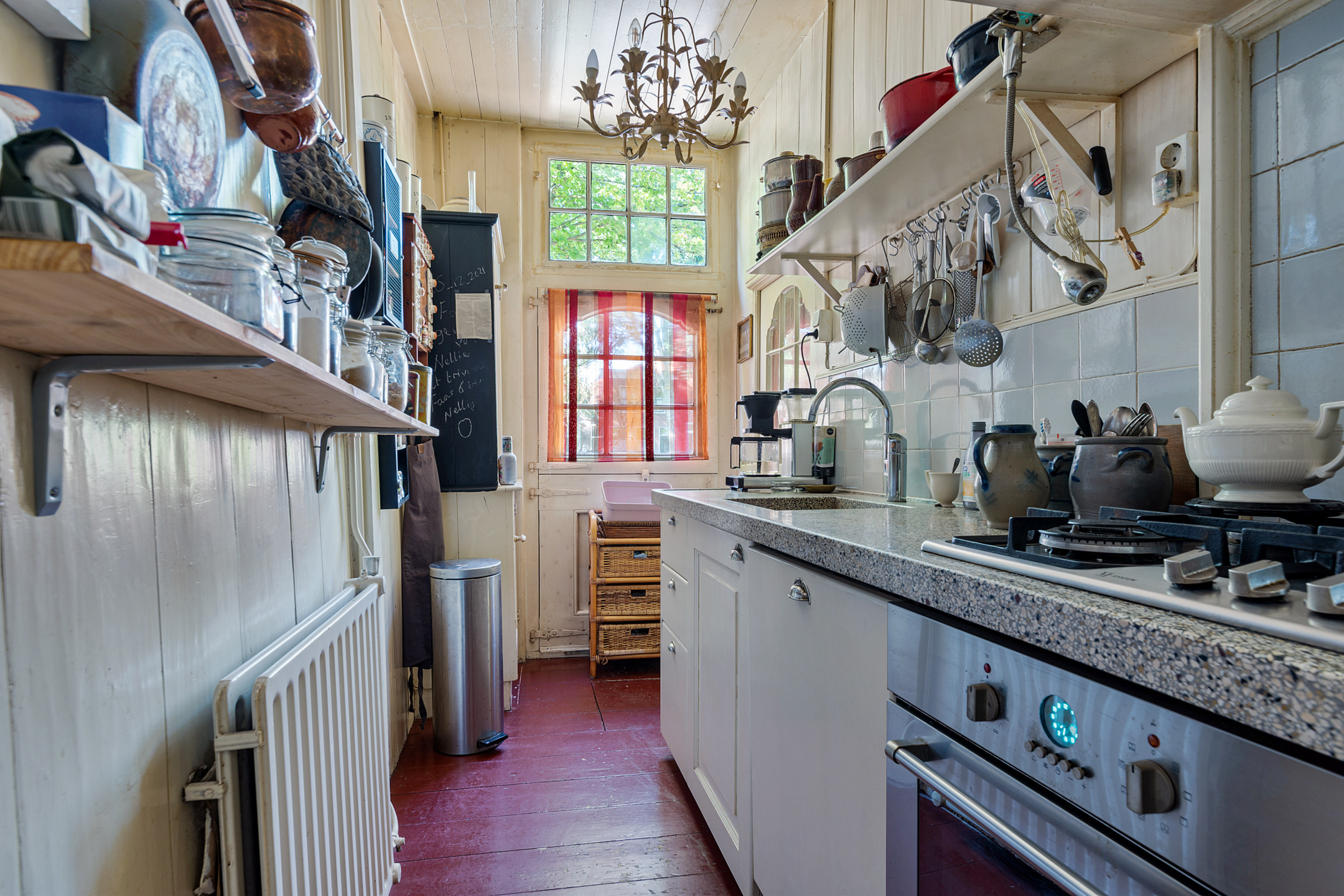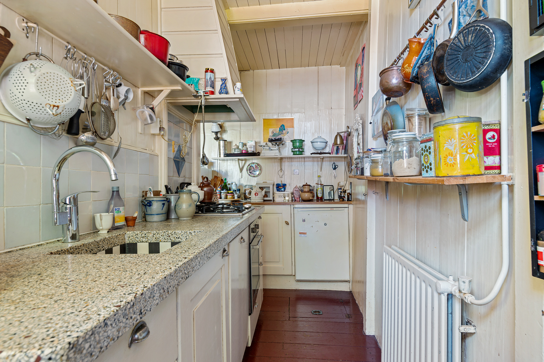 Aan de voorzijde is de keuken, waar aan twee kanten een opstelling staat die qua stijl perfect in deze woning past. Het aanrechtblad en de spoelbak zijn van terrazzo, en de lichtblauwe wandtegels zijn gelukkig behouden.