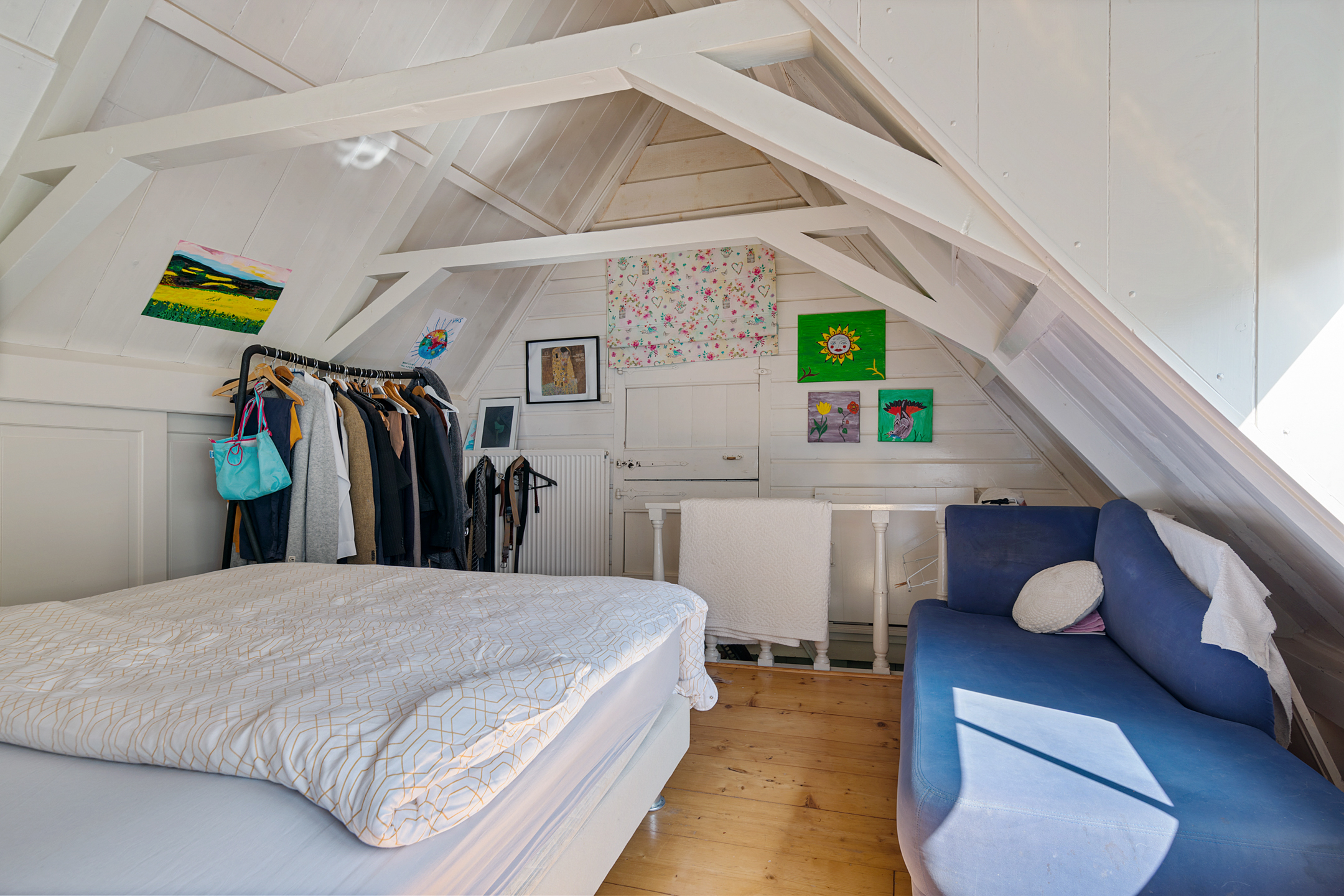 Volg de trap vanuit de hal naar de eerste verdieping, waar een ruime slaapkamer en de badkamer zijn. De slaapkamer heeft, net als de badkamer, dankzij de dakkapel veel lichtinval vanaf de zuidkant. Sfeermakers zijn de houten vloer, de paneeldeuren van de vaste kasten en de houten dakconstructie, met zicht tot in de nok. In de badkamer is de ruimte ingedeeld met een bad, wastafel en een kast met de ketel.