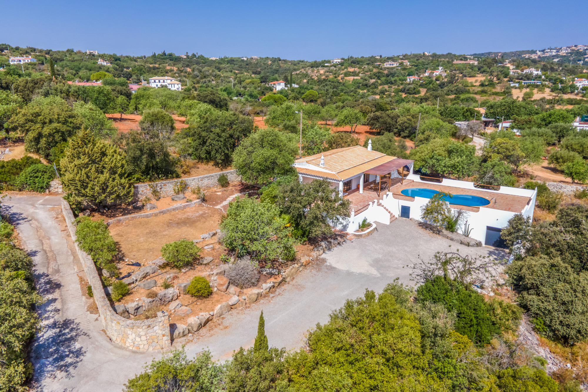The villa is situated on a generous 4,890 m² plot, surrounded by authentic stone walls that provide a sense of timelessness, privacy, and security.