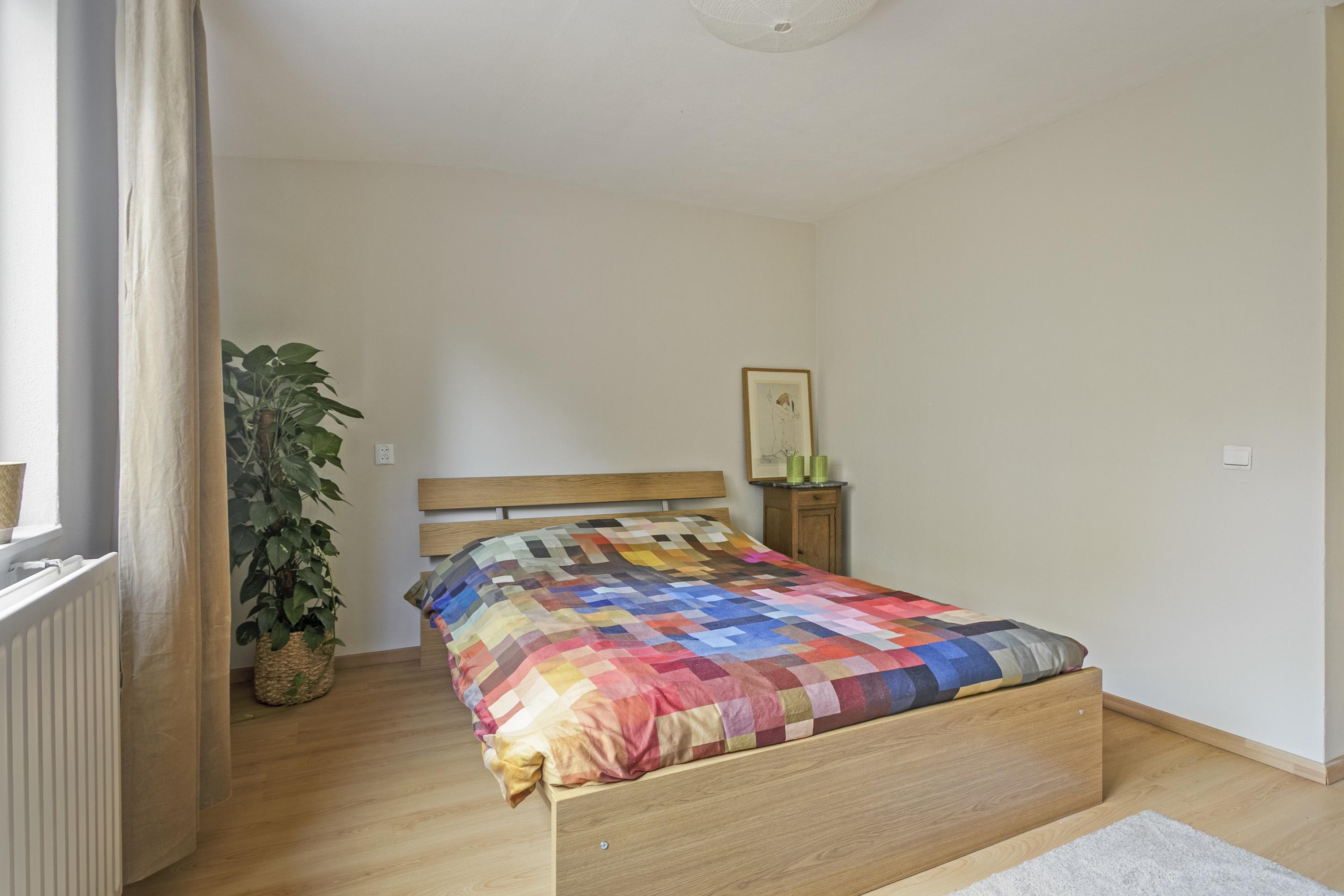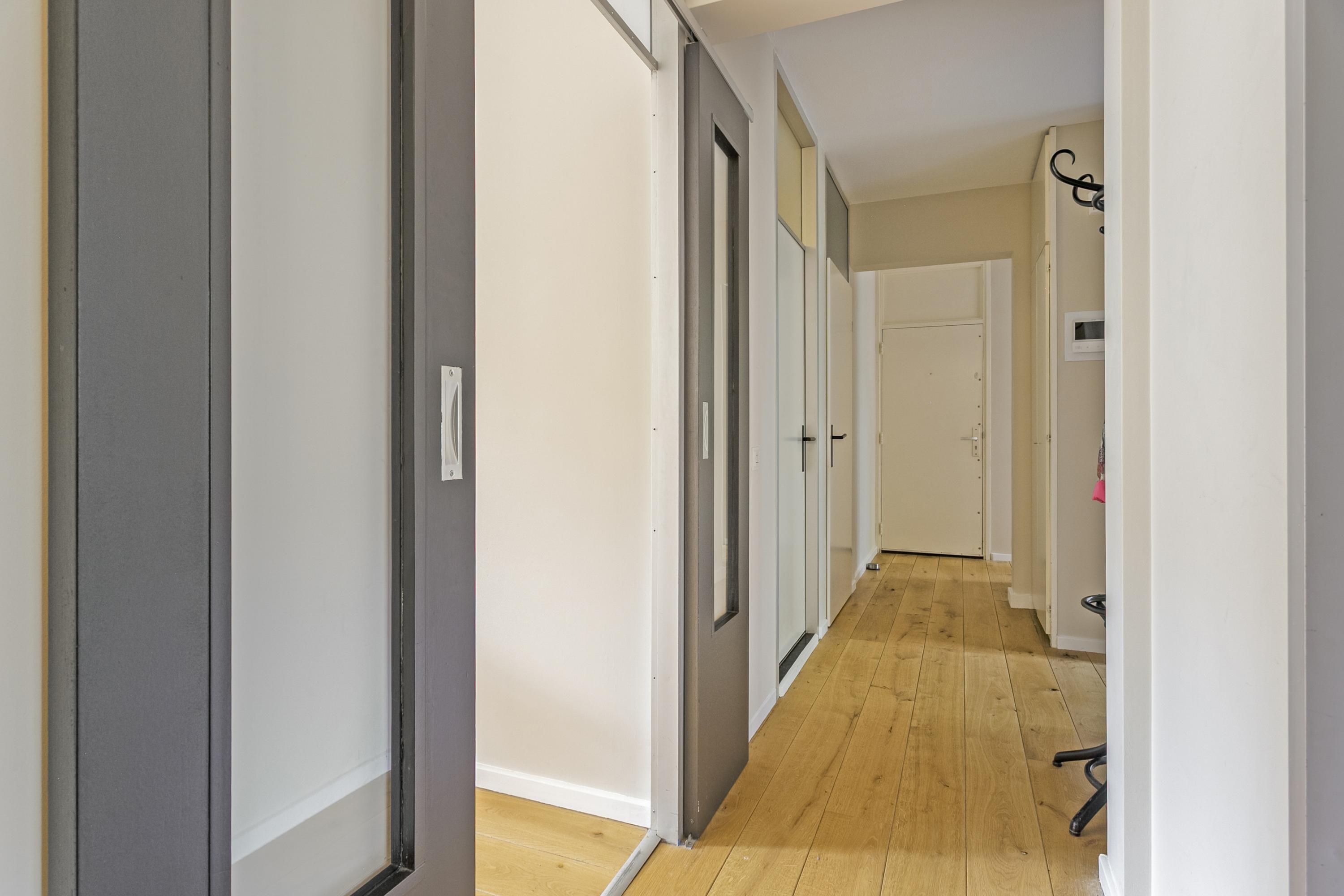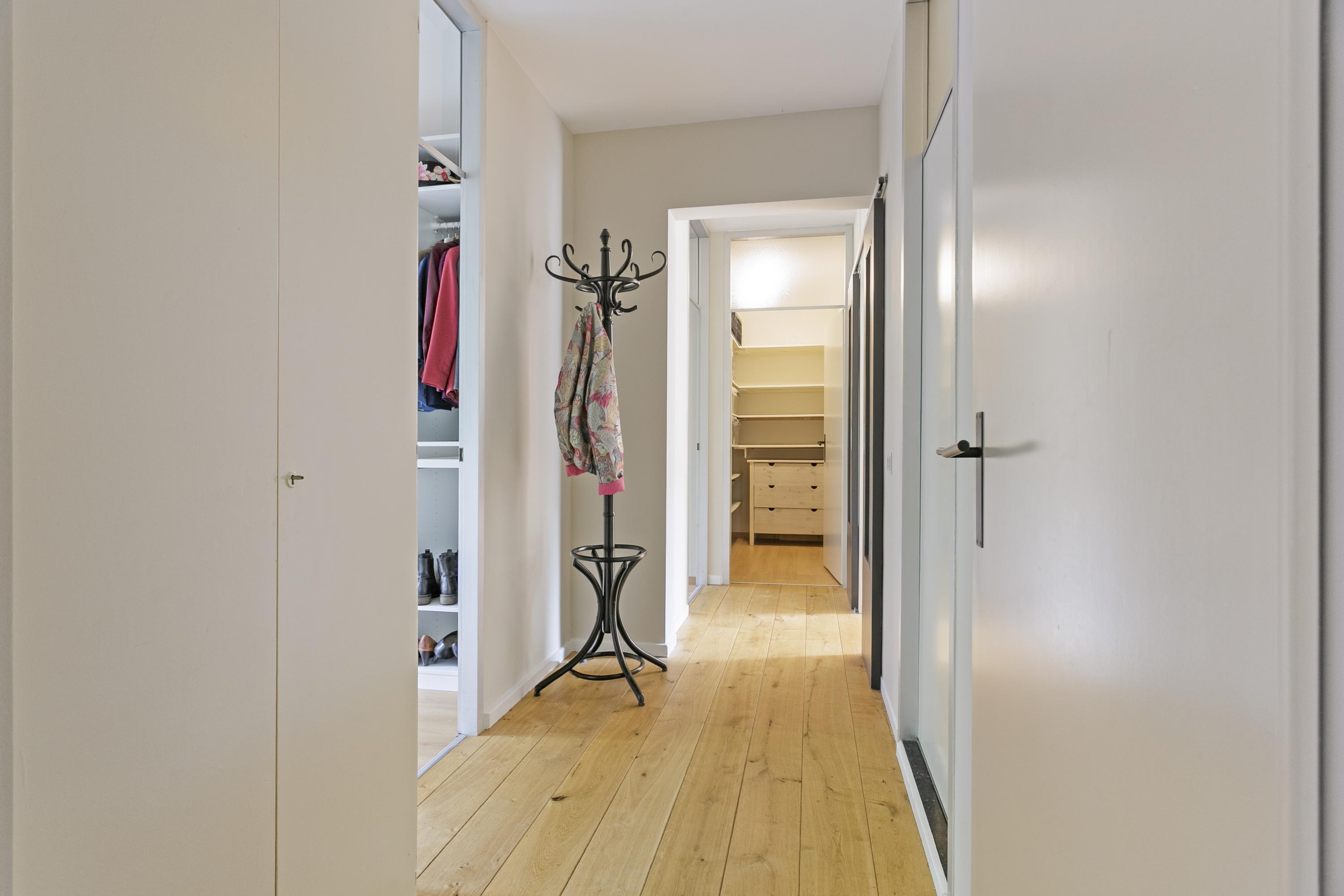 Via de hal bereik je aan de linkerkant de drie slaapkamers van een goed formaat. Aan de rechterkant bevindt zich het seperate toilet, de nette badkamer en de ingang naar de woonkamer. Verder is er nog een grote bergruimte in de gang.