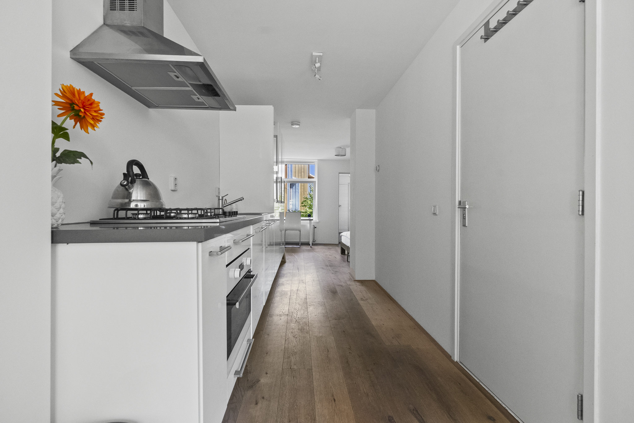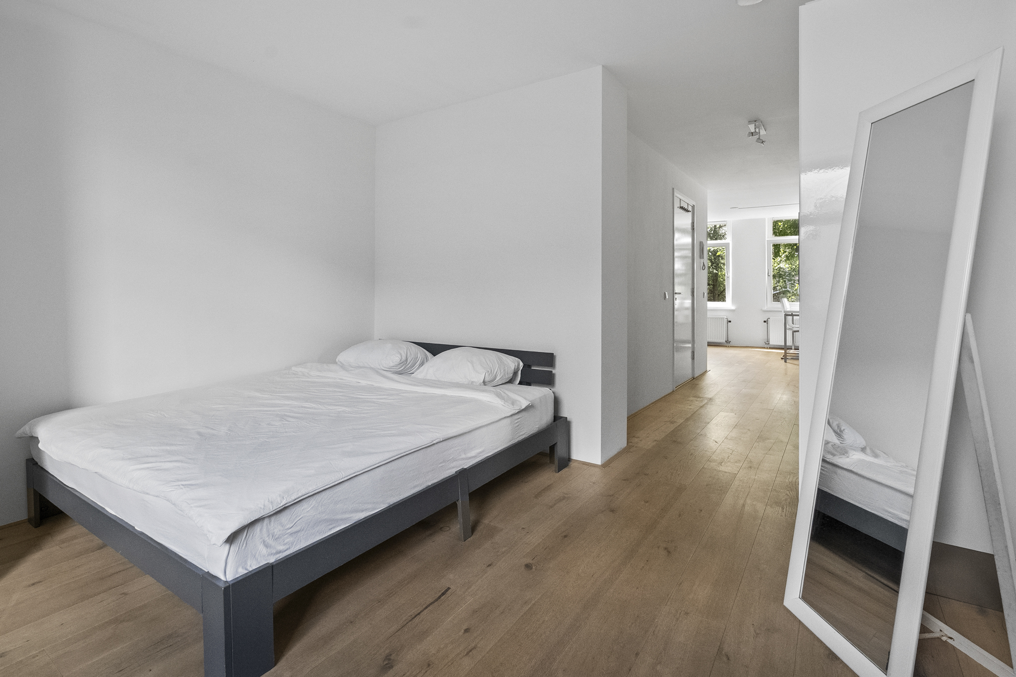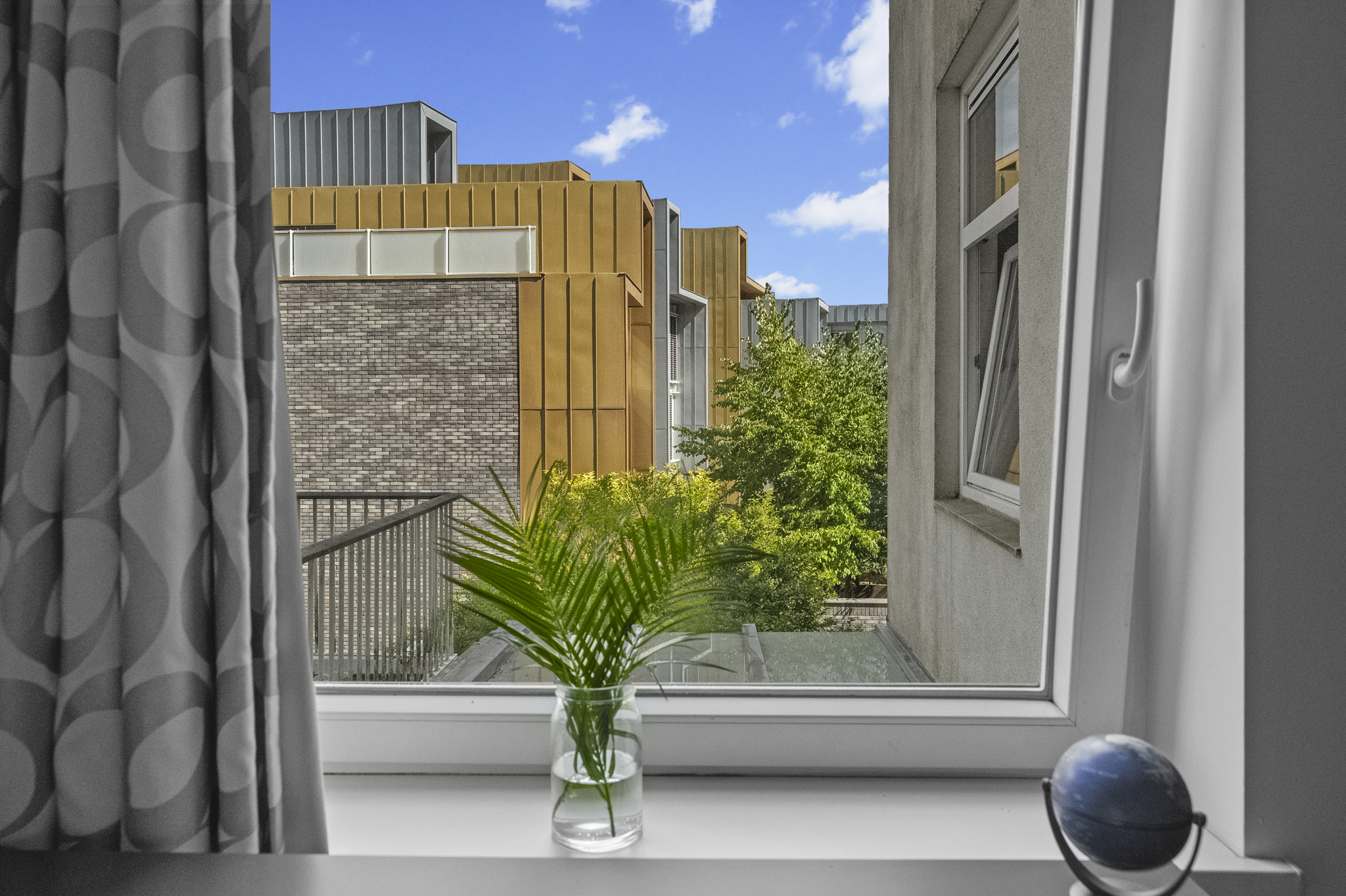 De zeer ruime slaap-/werkkamer bevindt zich aan de rustige achterzijde van het appartement, wat tevens de koele noordoostkant is. Er is meer dan genoeg plek om een tweepersoonsbed, een garderobekast en een bureau neer te zetten. Als je door het raam naar buiten kijkt, dan zie je de opvallende woningen en appartementen op het voormalige terrein van de scheepswerf Wiener & Co. In 2017 kregen de architecten Arons en Gelauff de Zuiderkerkprijs, de prijs voor het beste woningbouwproject in Amsterdam. En als bewoner kun je iedere dag genieten van de prachtige architectuur!