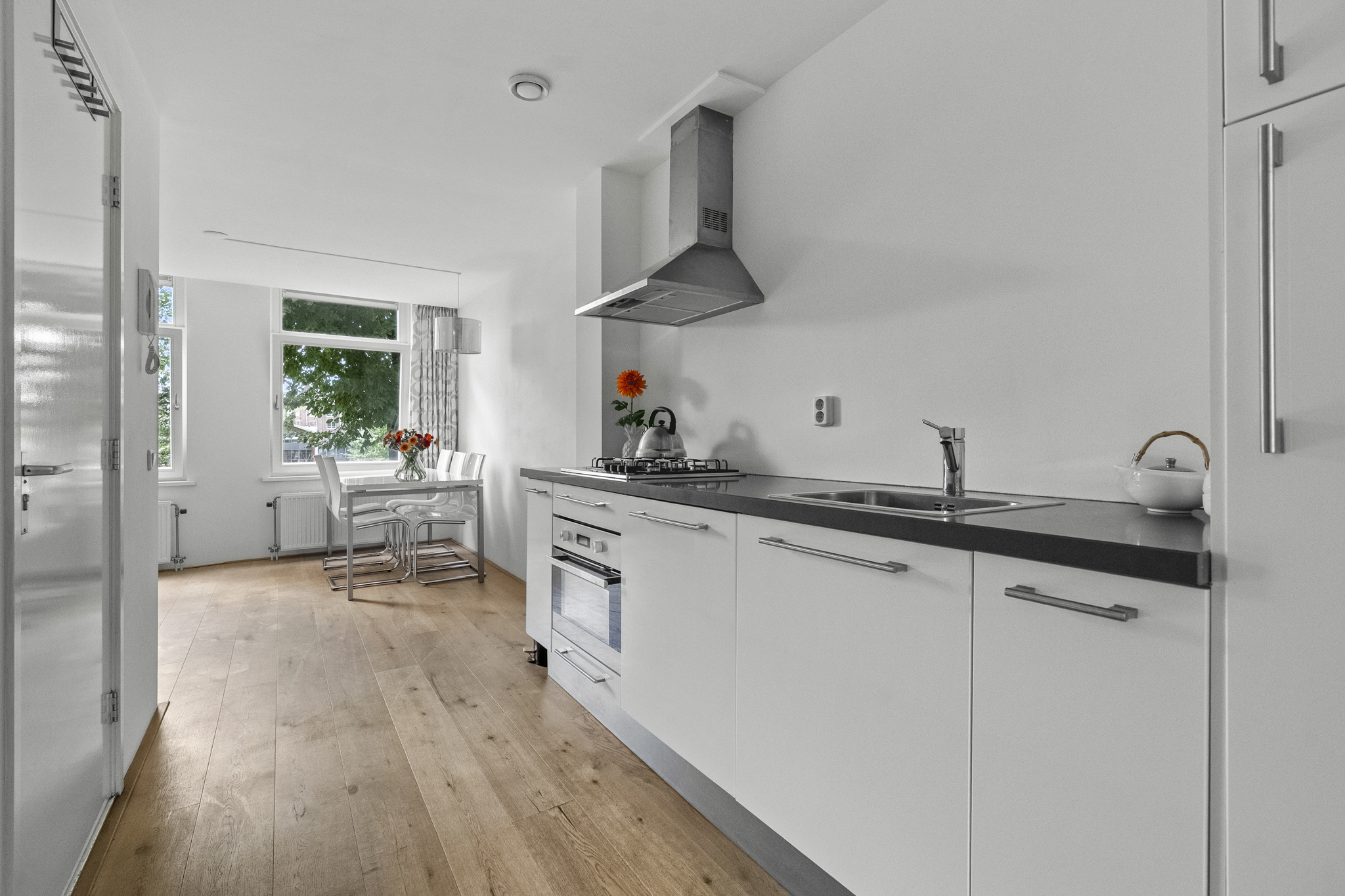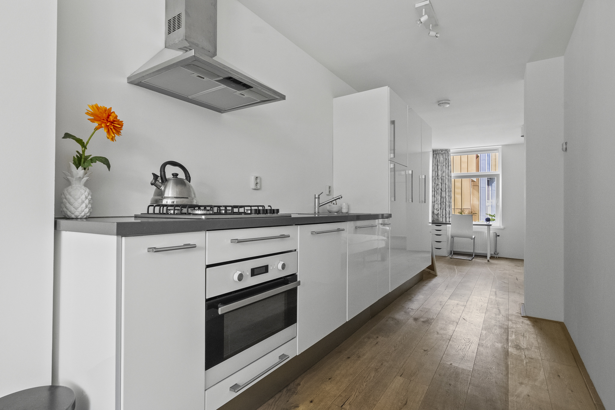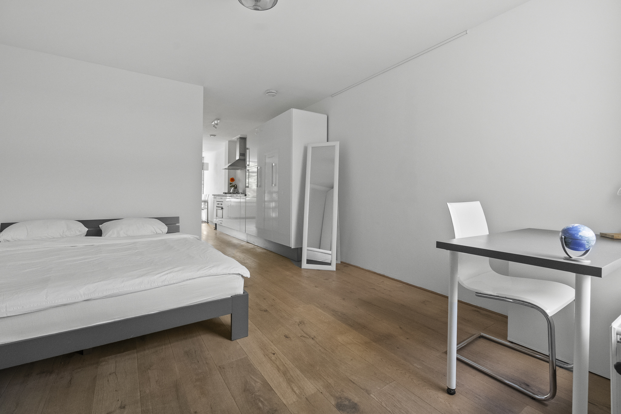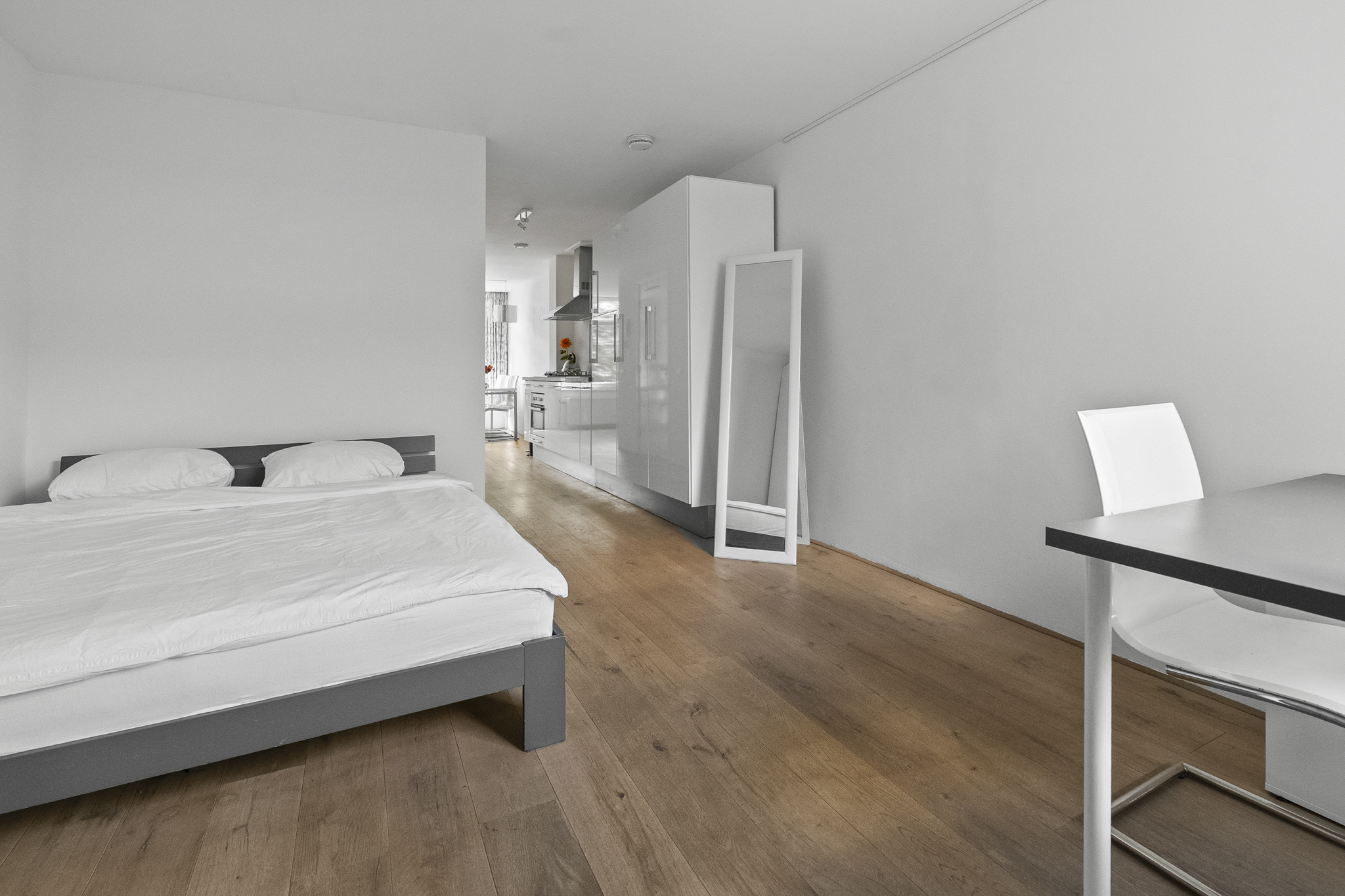 In het hart van het appartement is de keuken, die de woon- en slaapkamer met elkaar verbindt. Naast de voordeur hangt de intercom, en de wandopstelling heeft een ingebouwde gaskookplaat, afzuigkap, combi-oven, vaatwasser en een koelkast met vriesvak. Deze keuken biedt alle tools om een zondags ontbijt, een uitgebreide lunch en een heerlijk diner te maken. En ben je geen keukenprins(es)? Dan zijn de magnetronfunctie en koelkast meer dan genoeg.