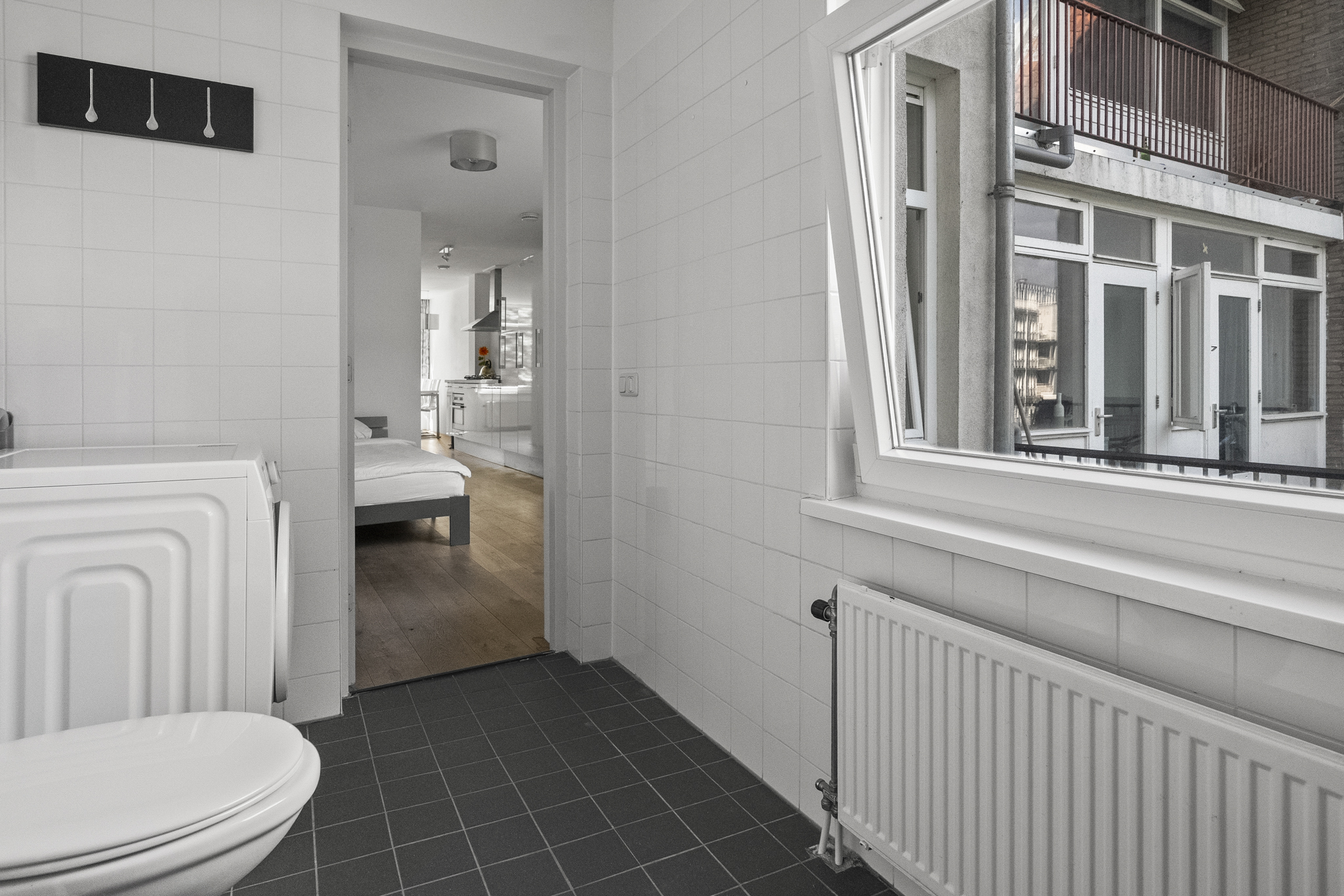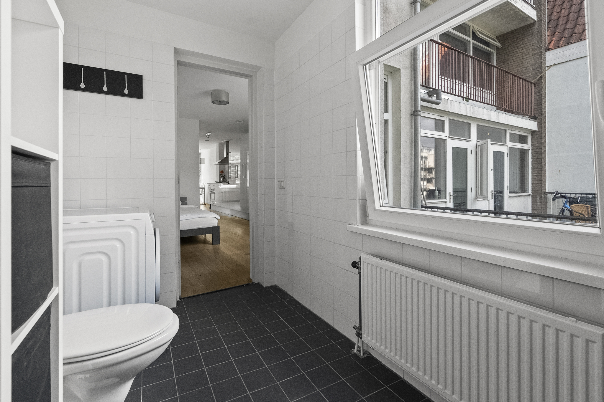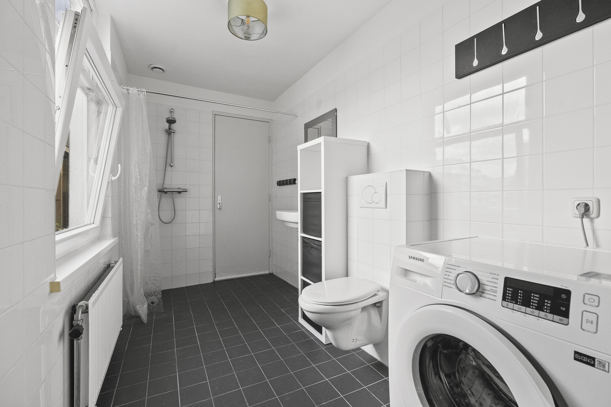Vanuit de slaapkamer loop je de ruime badkamer in, met geheel betegelde wanden en veel lichtinval via het grote raam. De ruimte is ingedeeld met een douche, wastafel, toilet en de wasmachineaansluiting. In een kast hangt de HR-ketel, mooi uit het zicht.