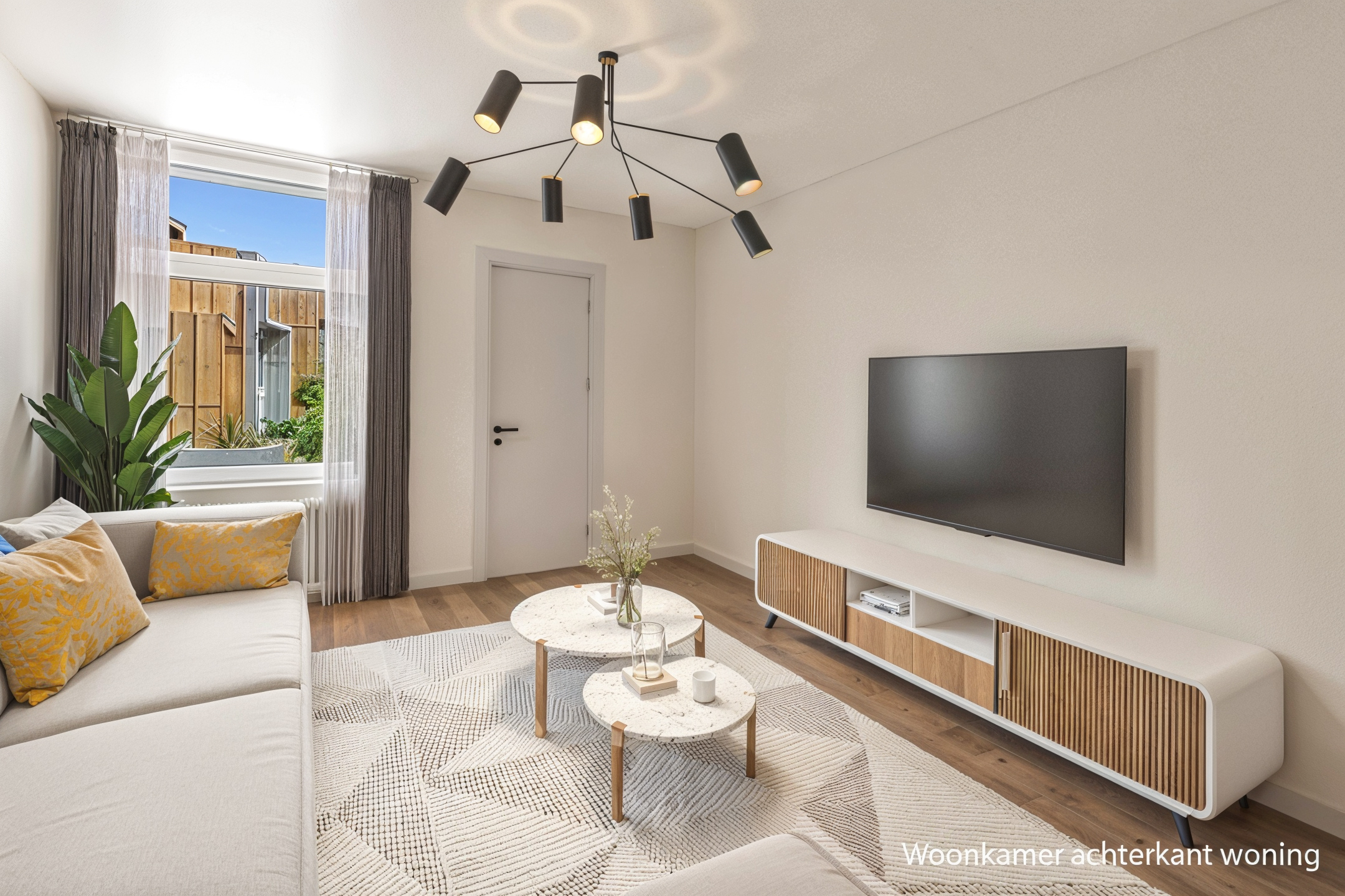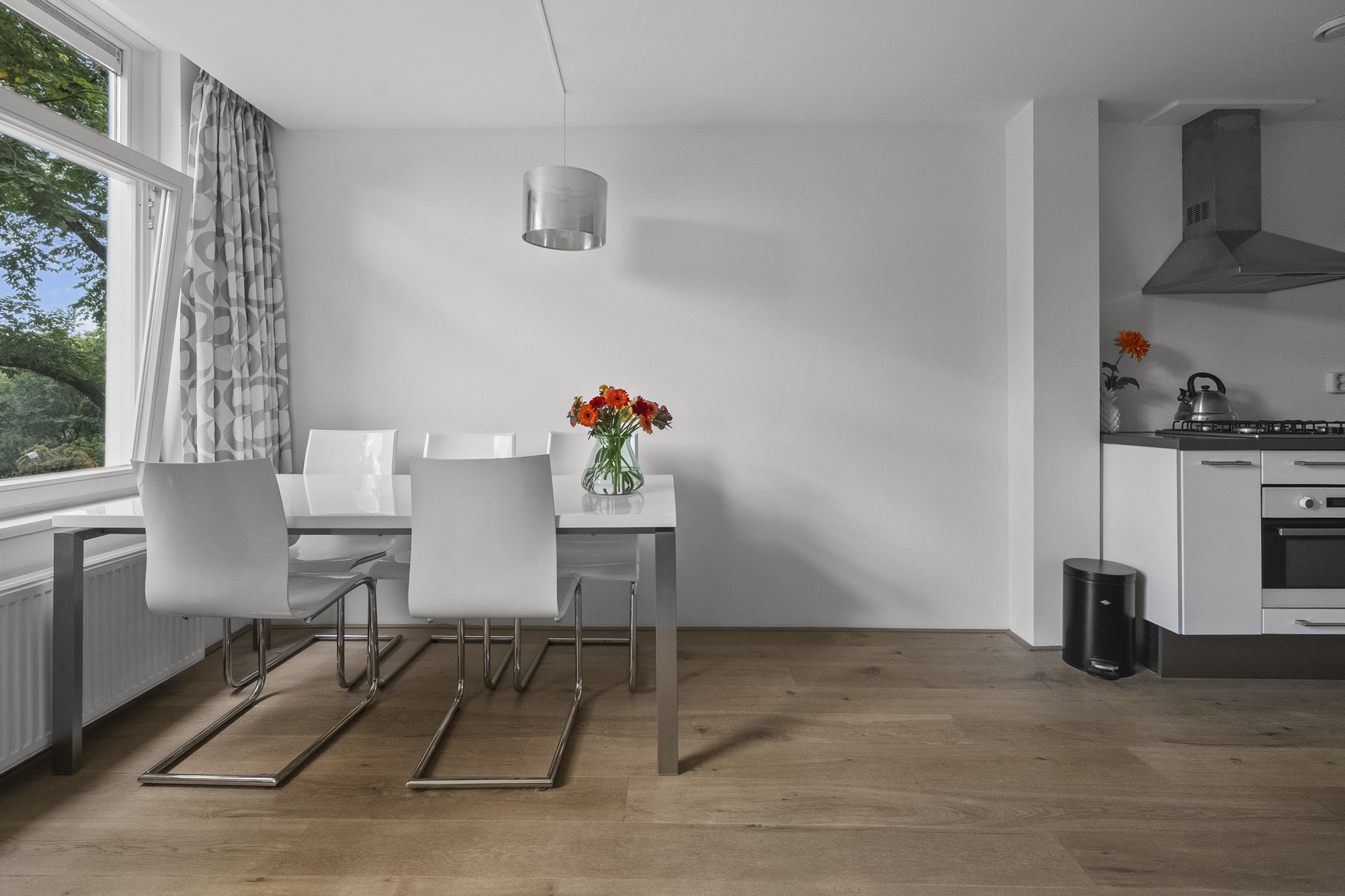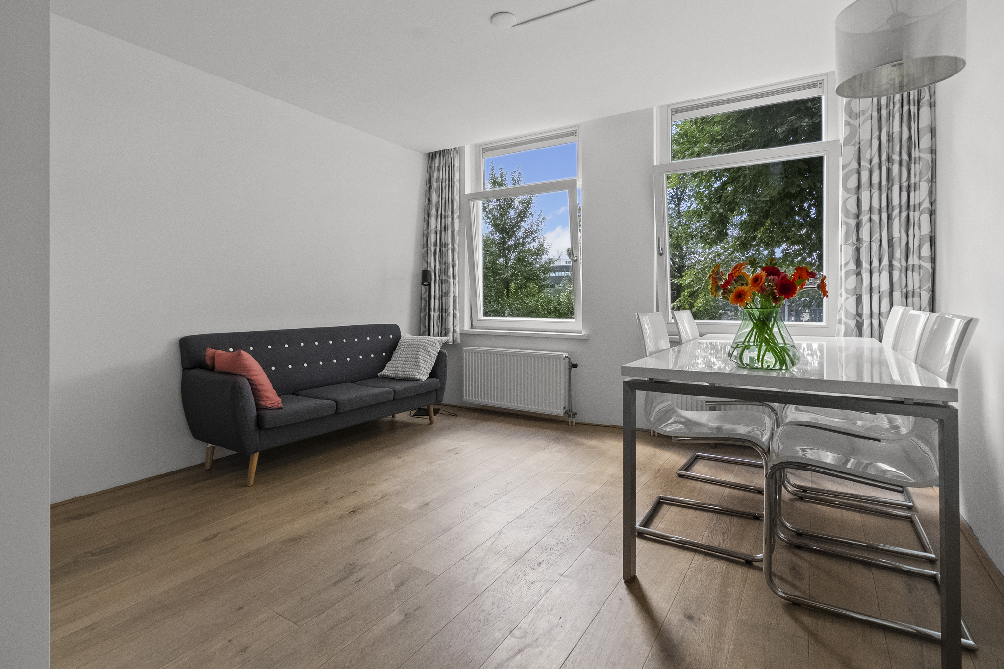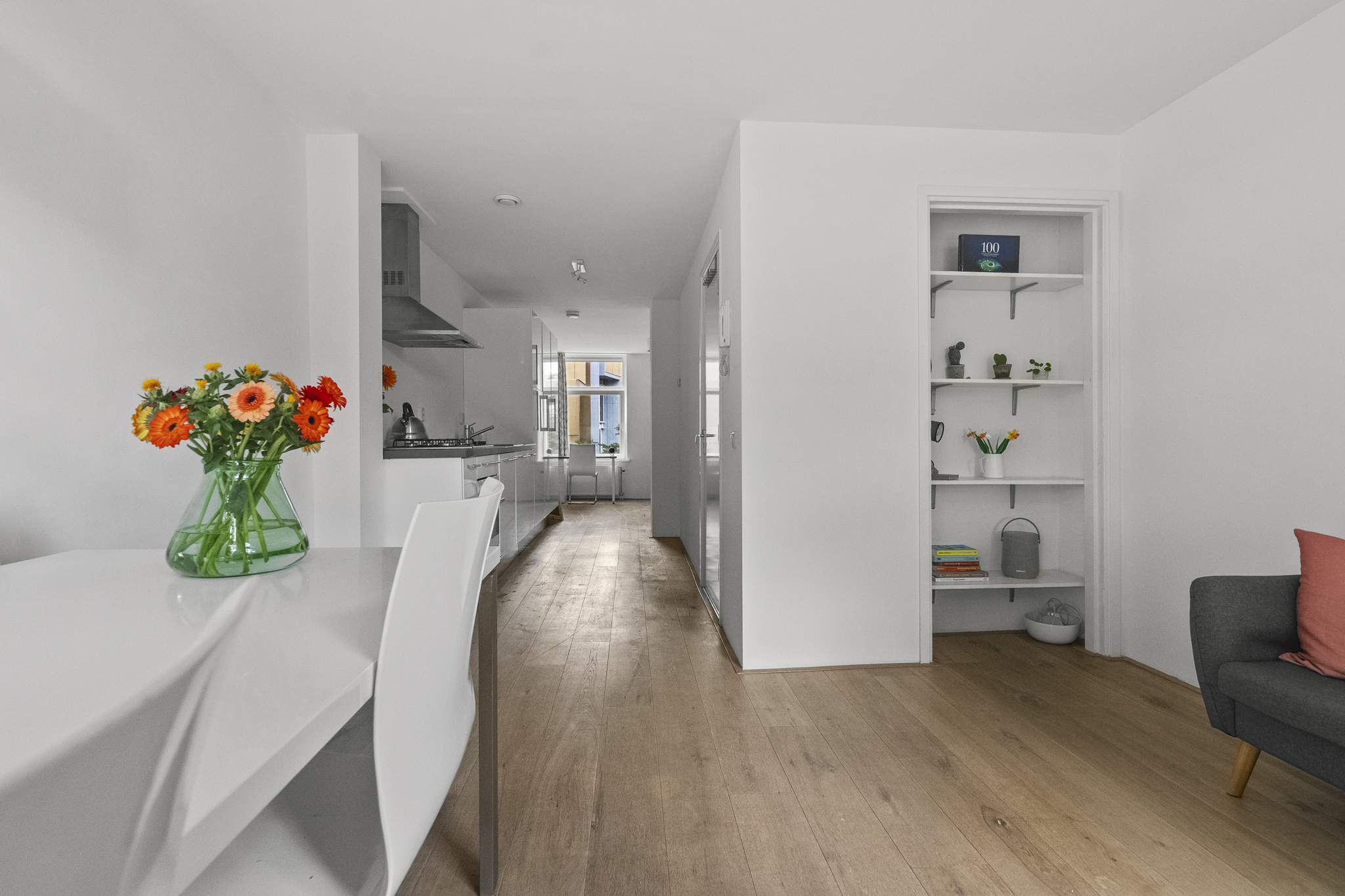 Als we op de eerste verdieping zijn, dan lopen we via de voordeur het appartement naar binnen. Eerst naar de woonkamer, aan de levendige Oostenburgergracht. Je ziet niet alleen de brede straat, maar ook mooie bomen en de boten in de Nieuwevaart. Met een slimme indeling is de woonkamer in te richten met een bank, tv-meubel en een grote eettafel.