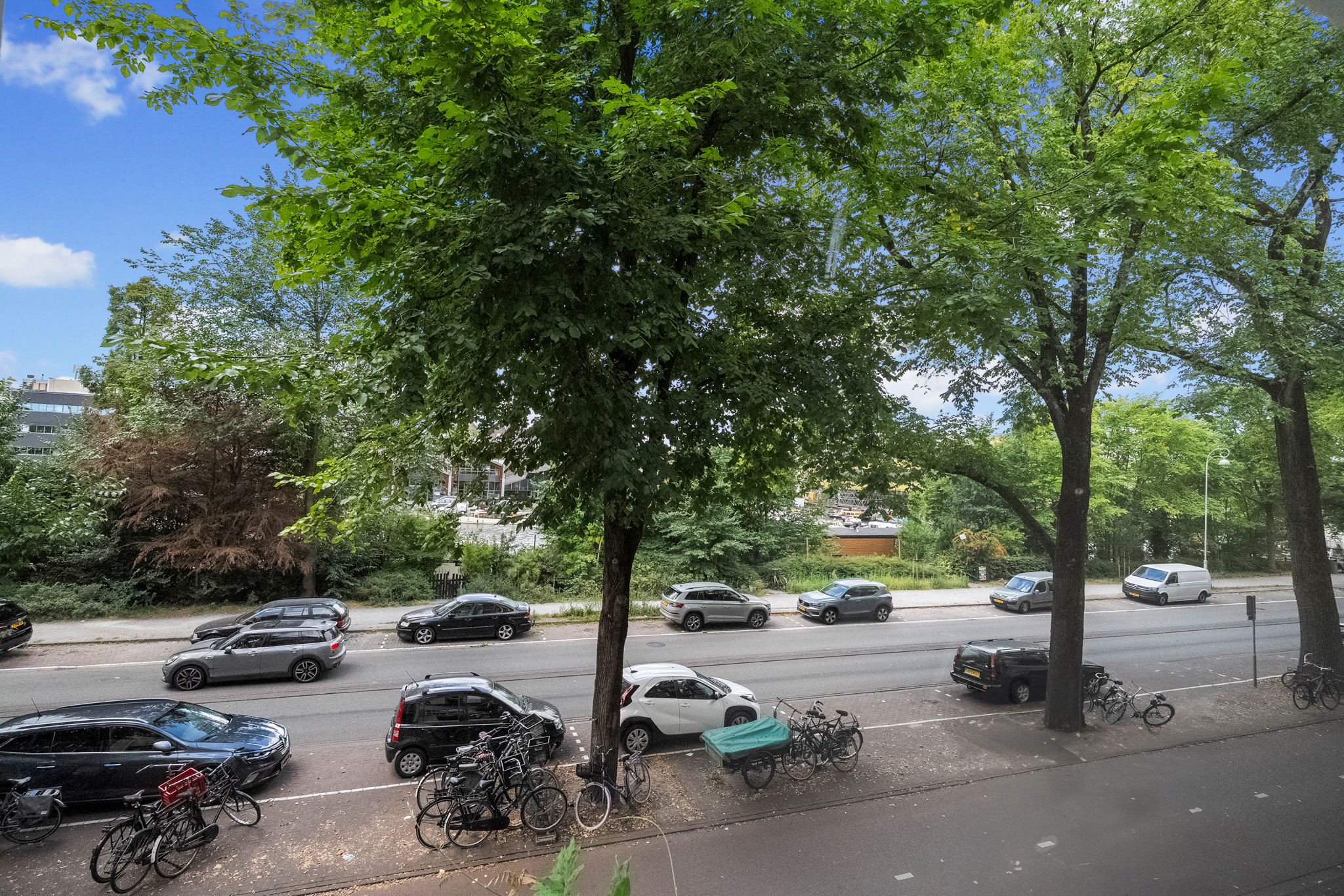 - Uitzicht naar de brede straat met mooie bomen en de Nieuwevaart
