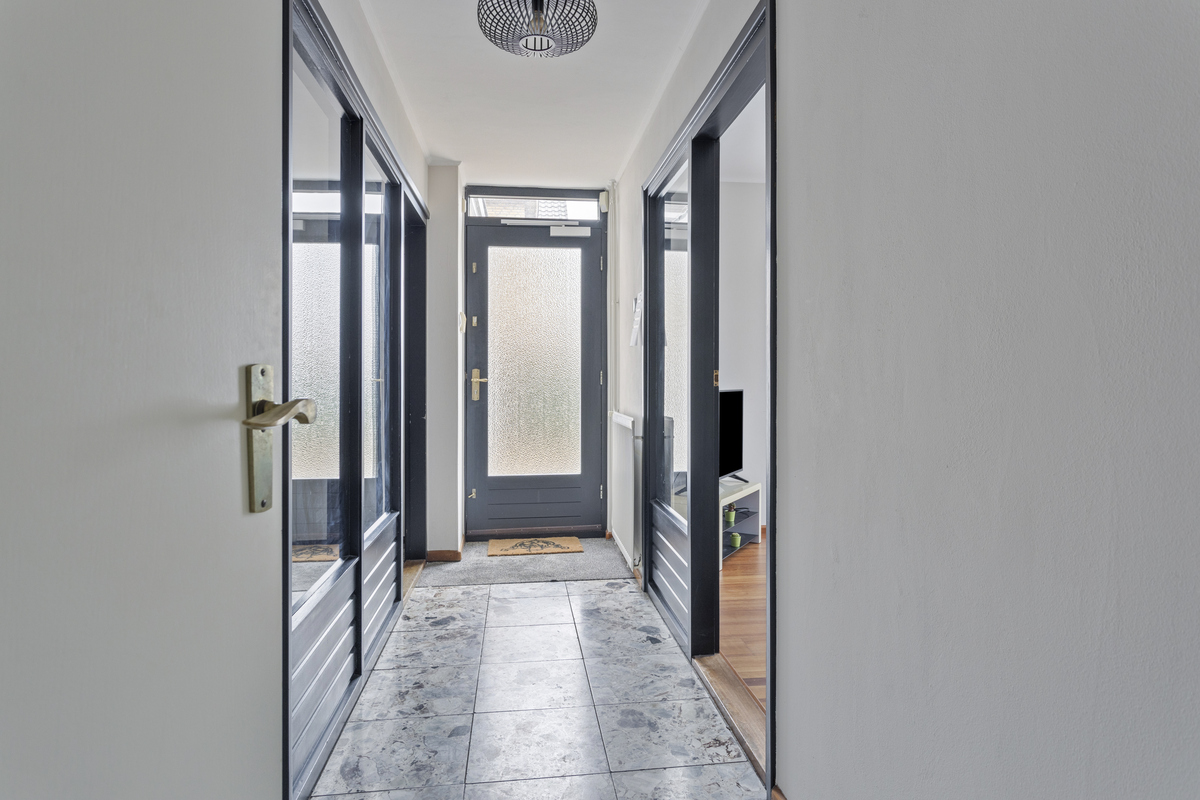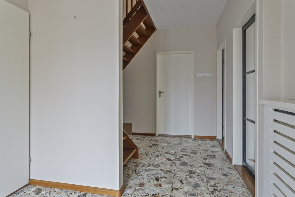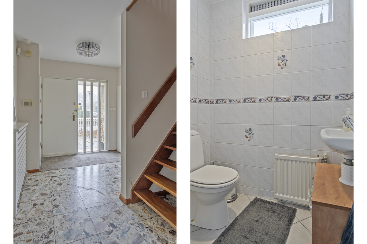Aan de buitenzijde zie je direct dat dit een huis met ruimte is, op een toplocatie in Oostzaan. Vanaf de brede oprit loop je naar de overdekte entree, die toegang geeft tot de hal. Er is ook een tweede toegang tot de hal, aan de rechterzijde van de woning. Eenmaal binnen zie je de open, hardhouten bordestrap en de originele marmeren vloer. Links in de hal zijn de toiletruimte en een inbouwkast, die als garderobe gebruikt kan worden.
