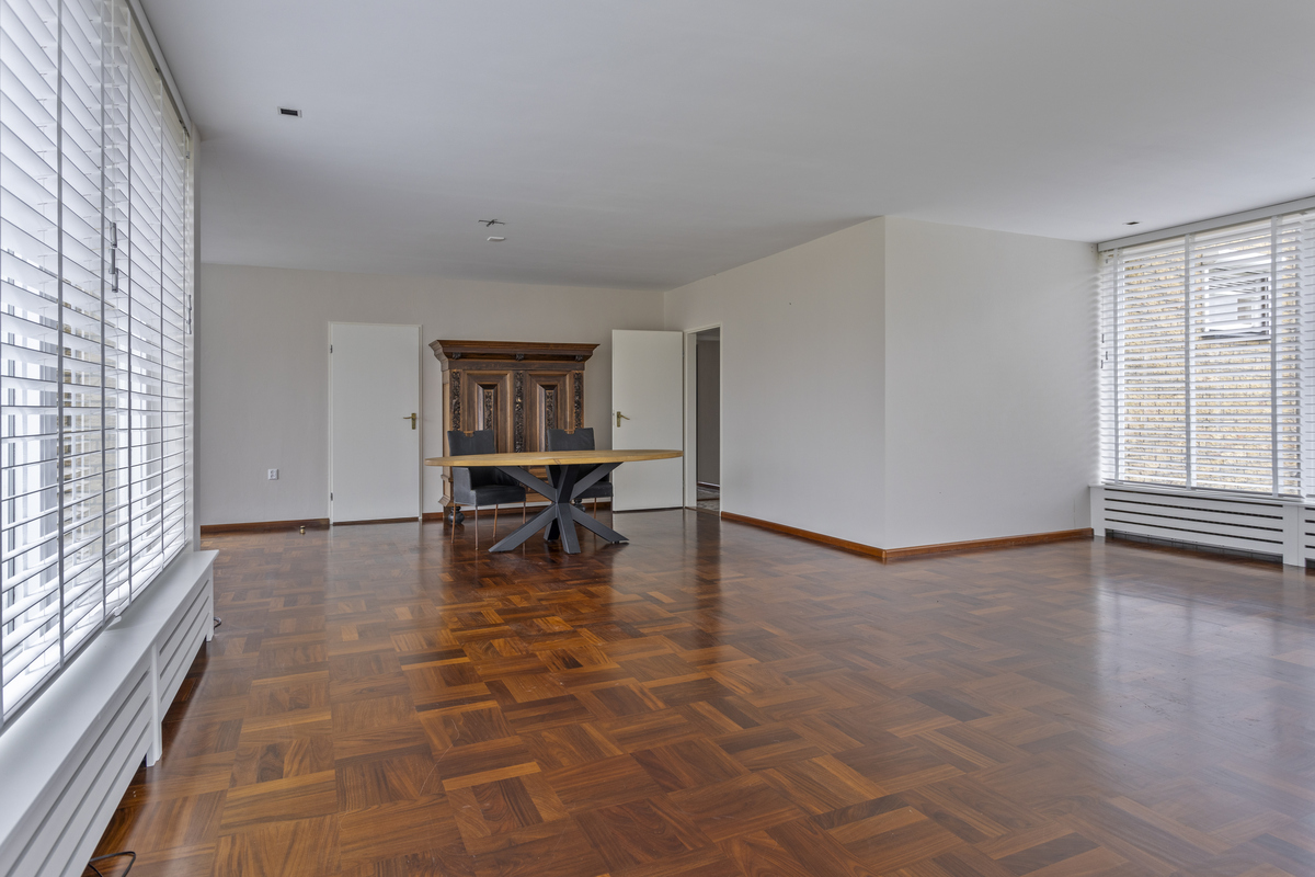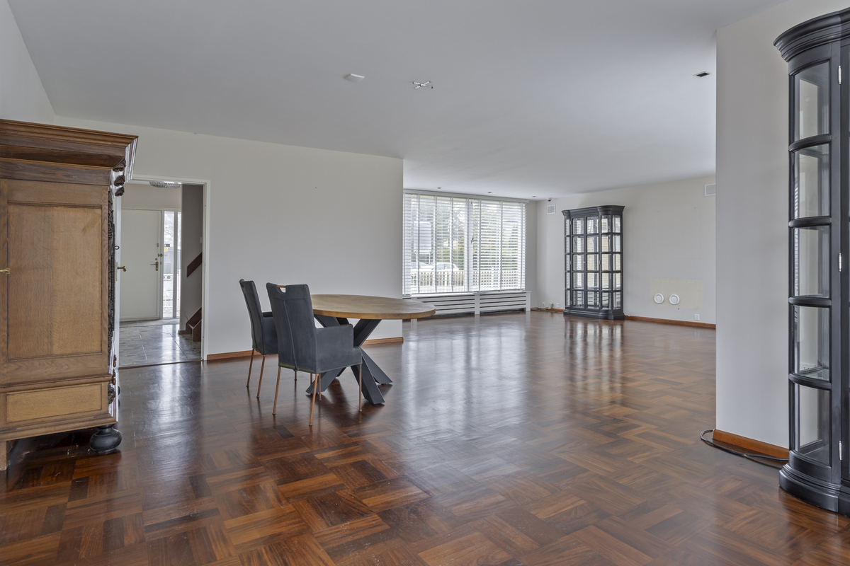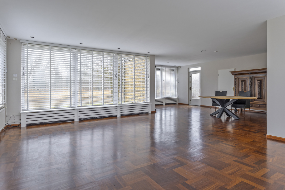 De woon-/eetkamer is een leefruimte van formaat, met prachtig uitzicht naar de Ringvaart en Het Twiske. Er ligt parket op de vloer en een deel van de radiatoren is voorzien van een witte ombouw, wat als voordeel heeft dat er ook brede vensterbanken zijn.
