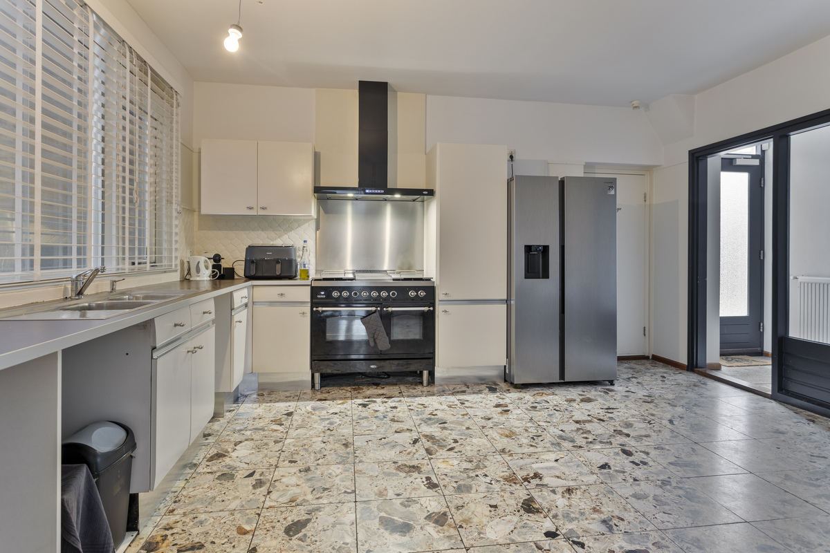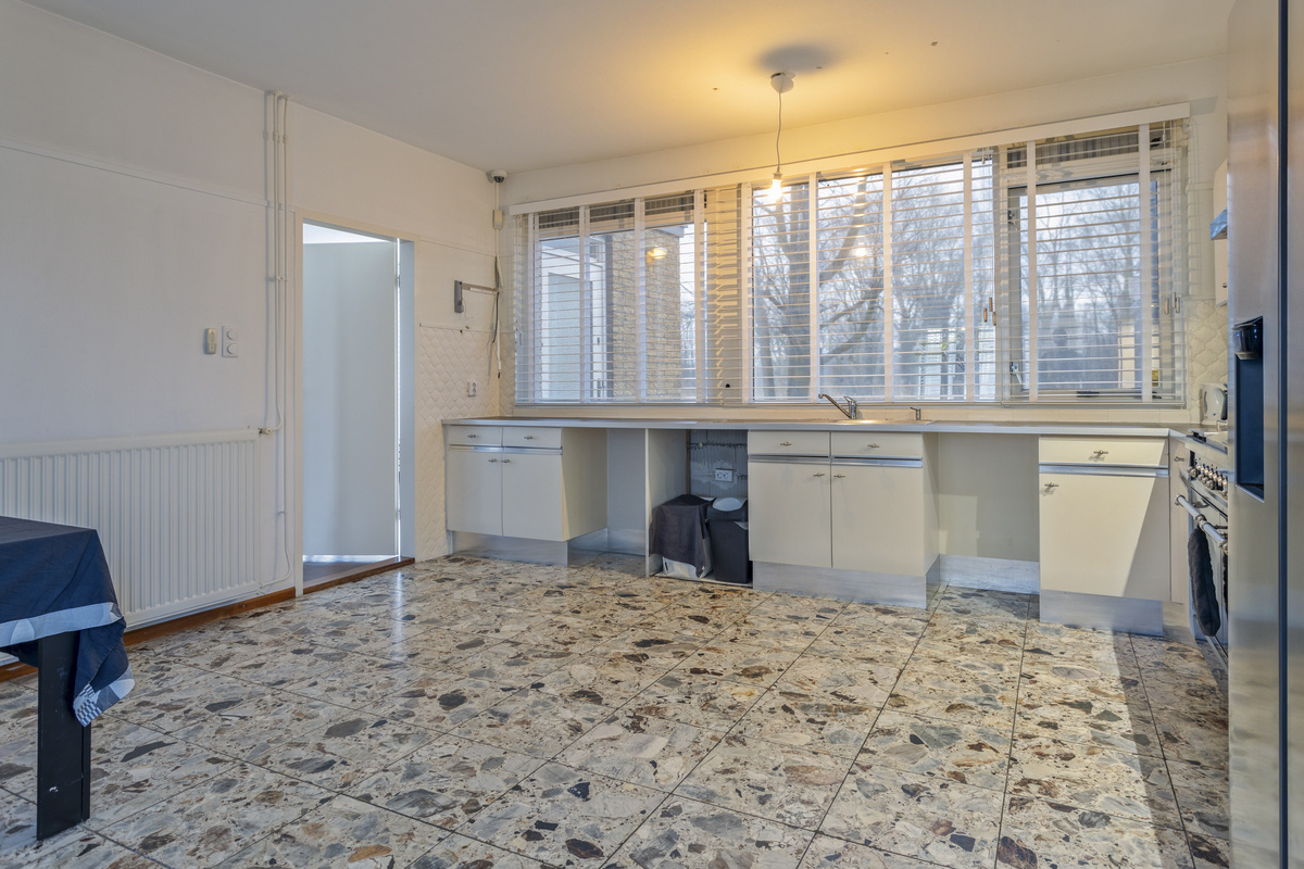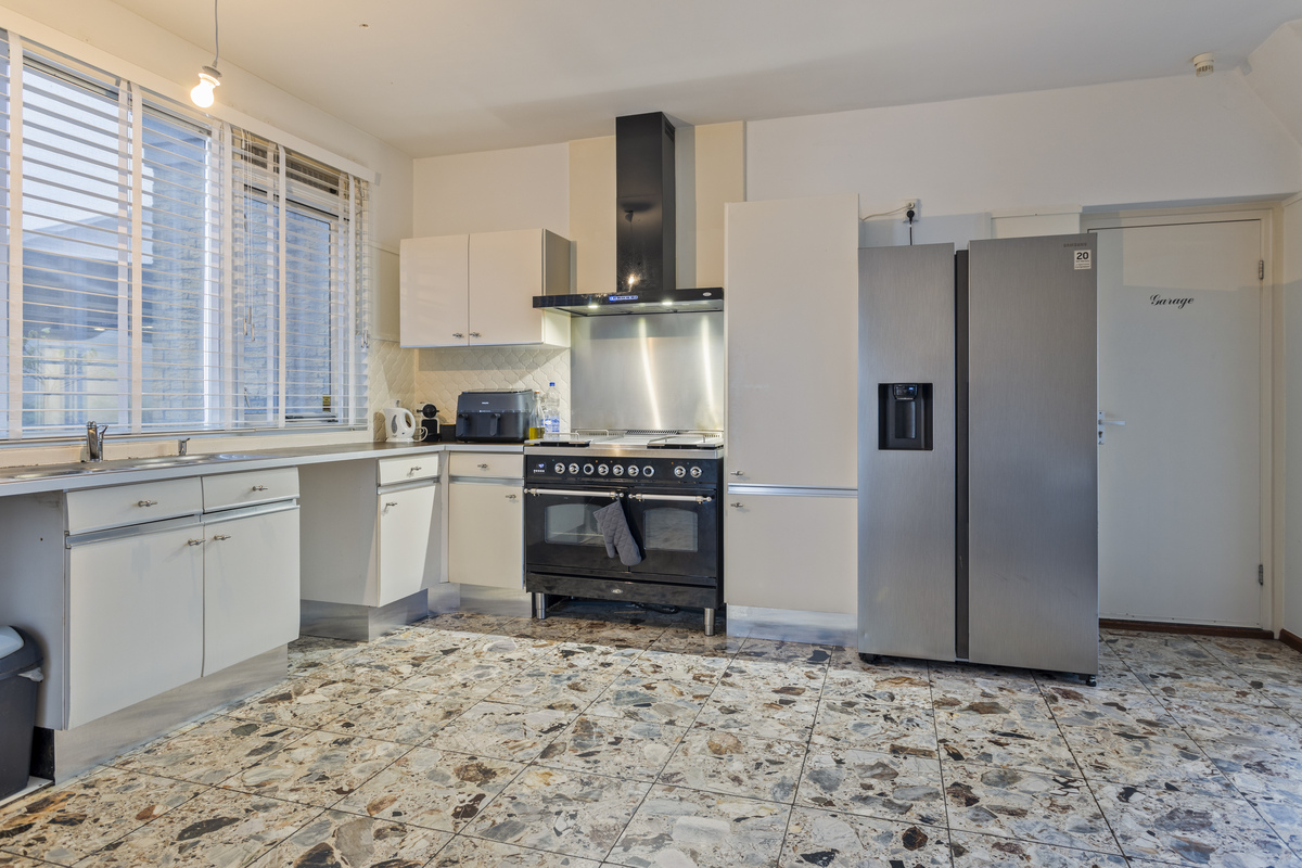Naast de woonkamer is de ruime keuken, met dezelfde vloer als in de hal. De hoekopstelling is toe aan vervanging, waarbij het mogelijk is om het Boretti gasfornuis met oven, de afzuigkap en koel-/vriescombinatie opnieuw te gebruiken. In de keuken is een inpandige toegang tot de garage en aan de voorzijde is een ruime werkkamer, die nu als zitkamer in gebruik is. Deze kamer bevindt zich vlak naast de tweede entree, wat voor een ondernemer een pluspunt is.