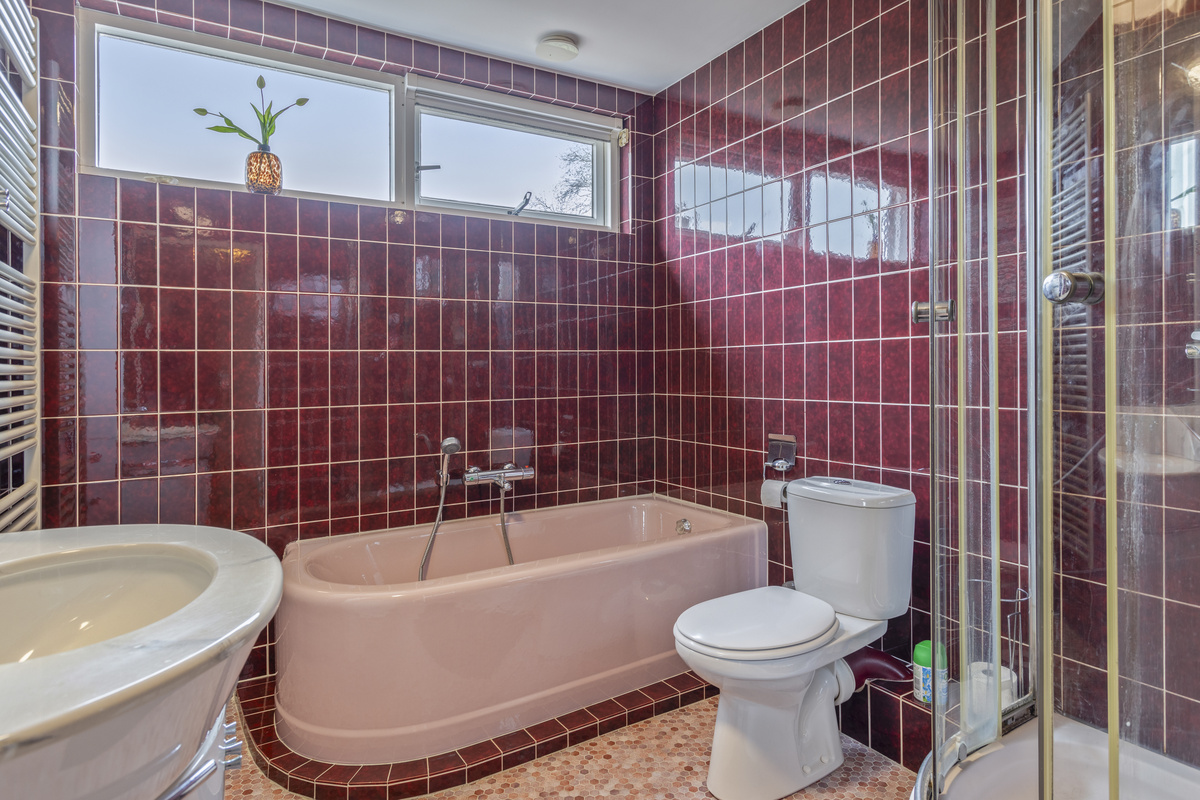 De badkamer is kleurrijk en gedateerd. Als we naar de ruimte kijken dan is er genoeg plek voor een ligbad, aparte douche, een tweede toilet en een wastafelmeubel. Twee ramen zorgen voor lichtinval, maar niet voor inkijk in de badkamer.