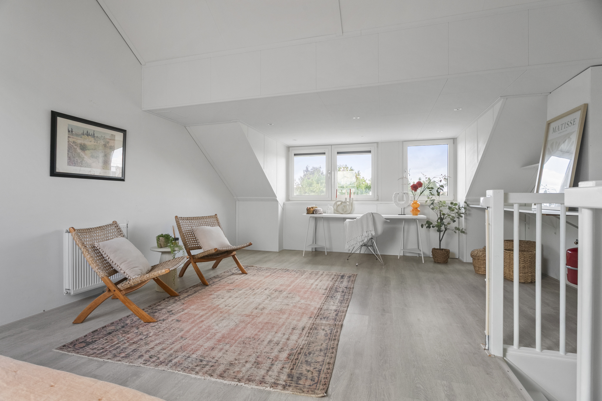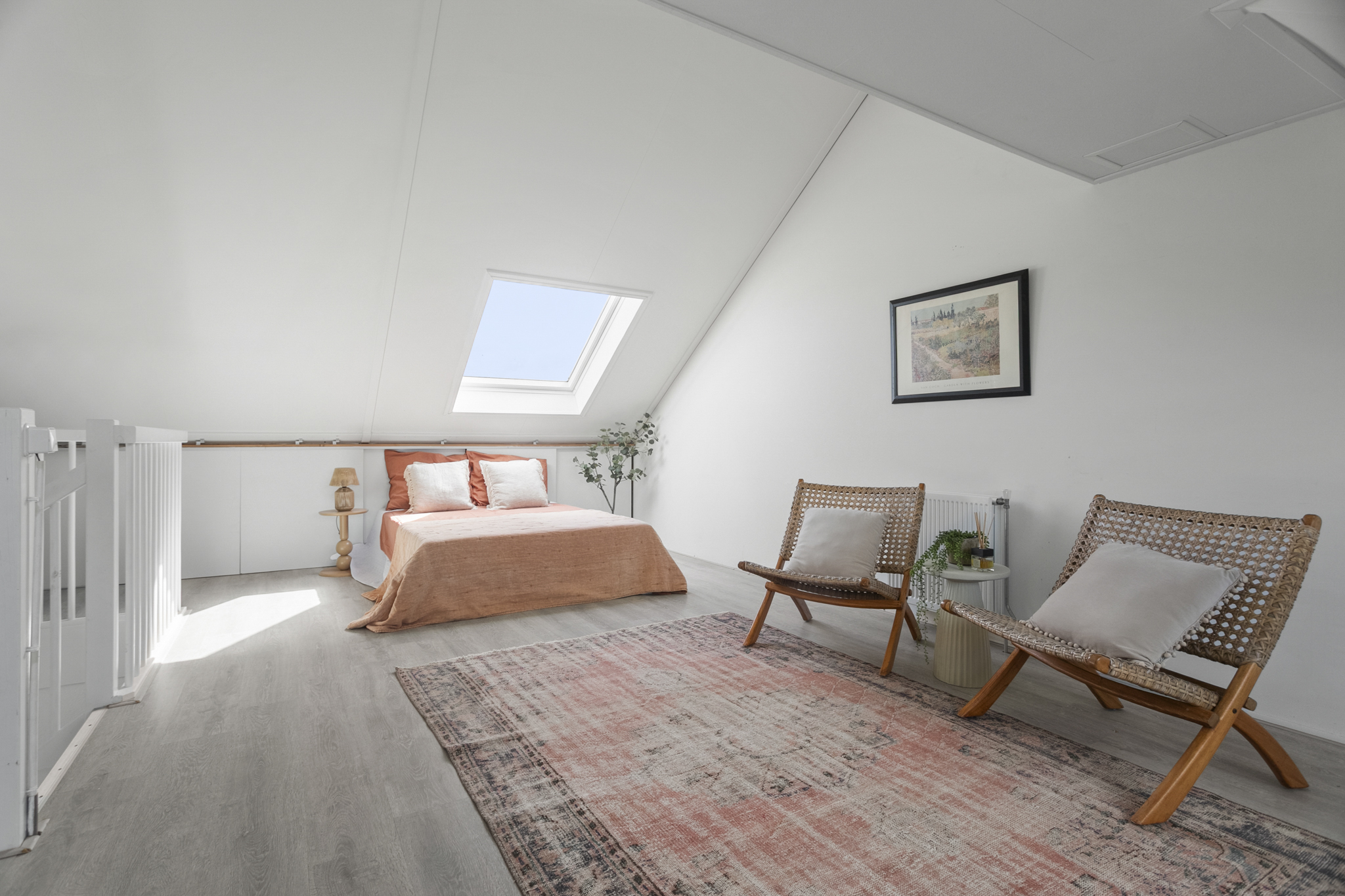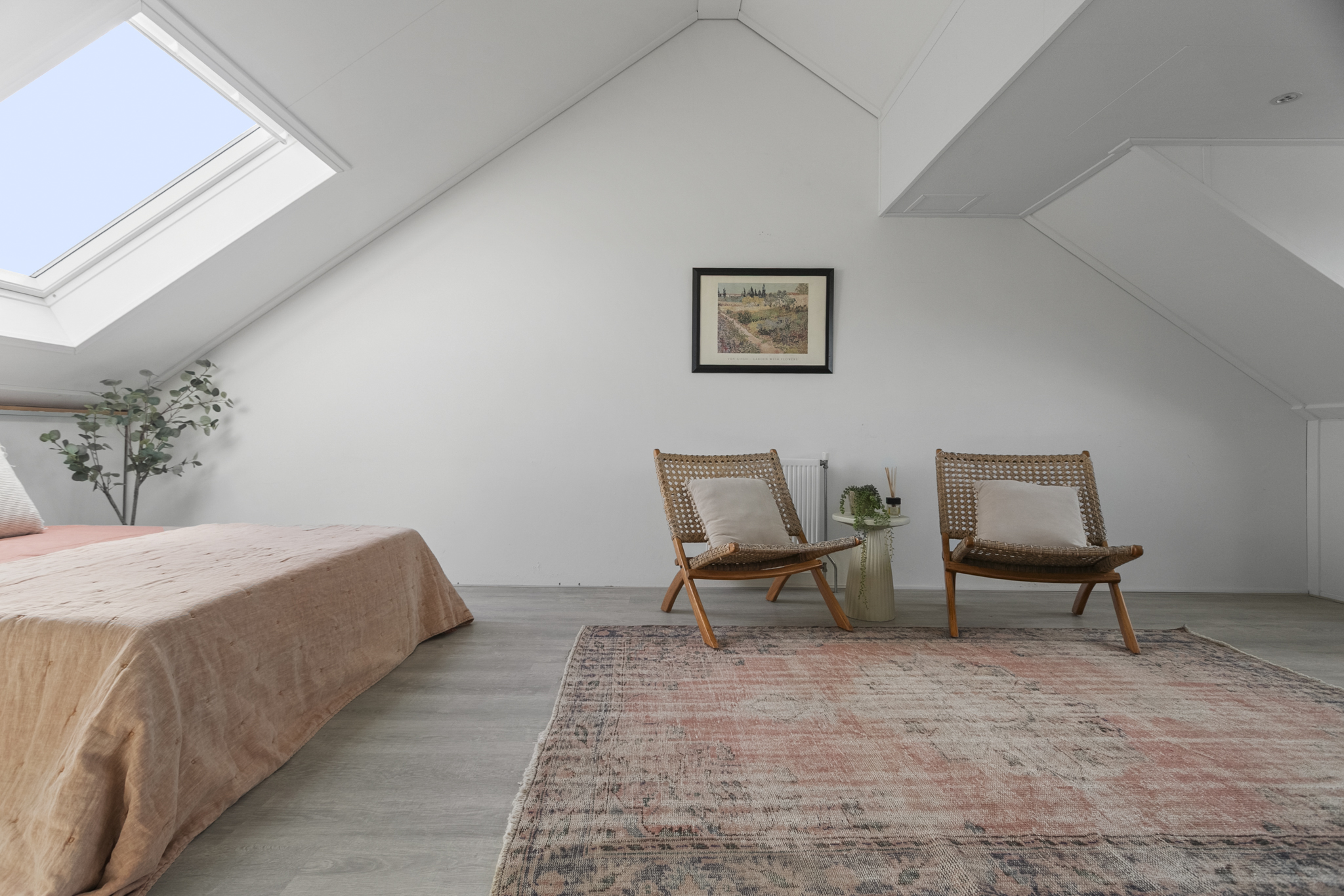 En dakkapel en een groot dakraam zorgen voor veel lichtinval op de tweede verdieping, waar een grote ruimte is ingericht als logeerkamer. Na het maken van een trapportaal is er volwaardige extra slaapkamers, en zelfs twee slaapkamers is mogelijk.