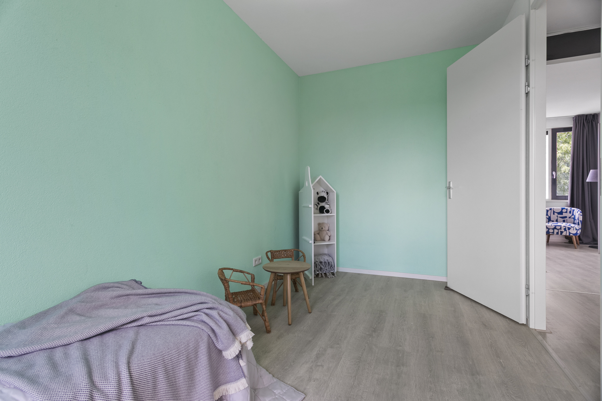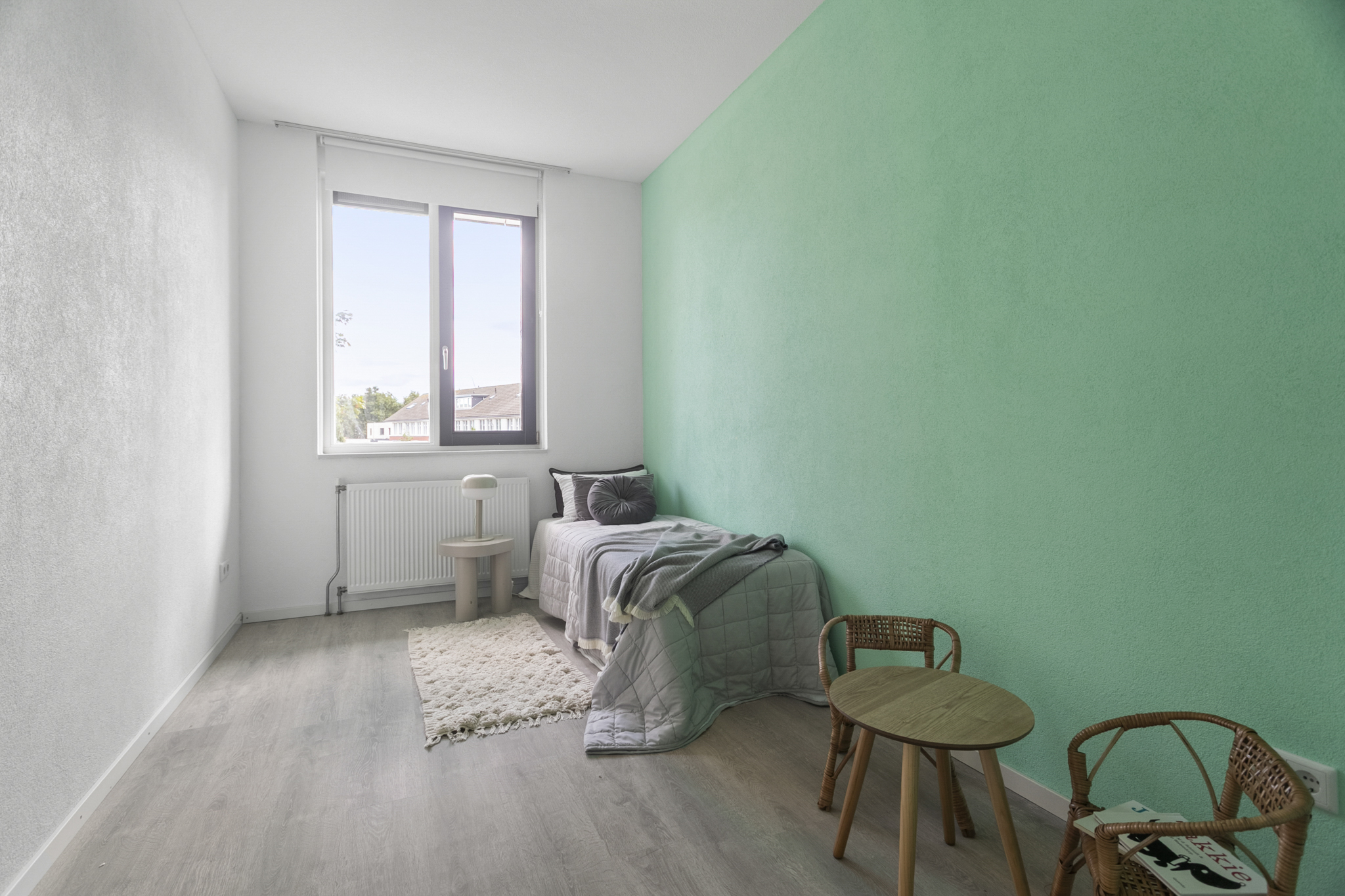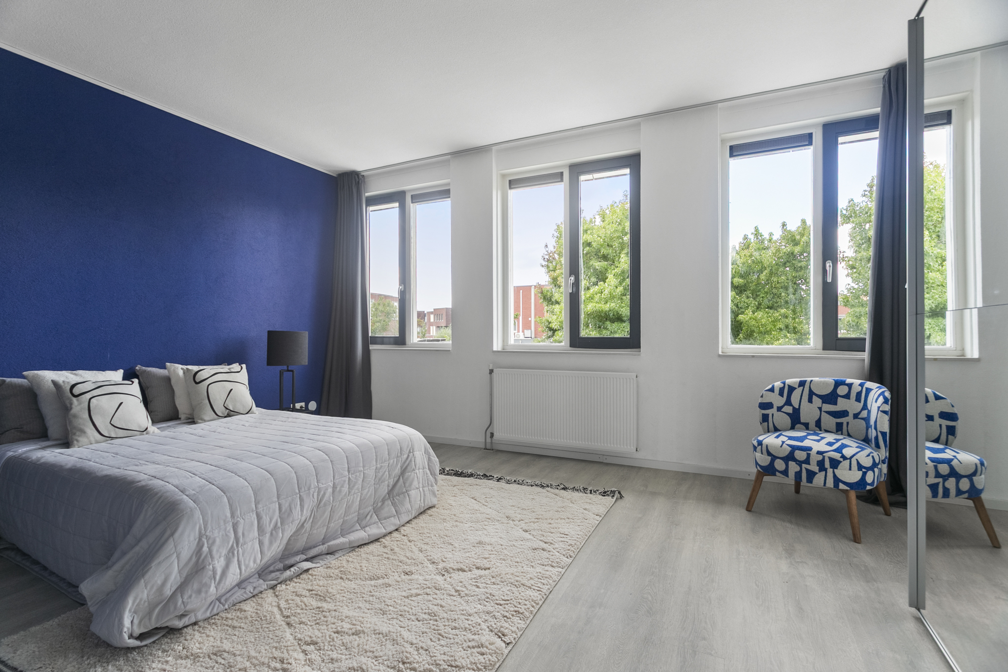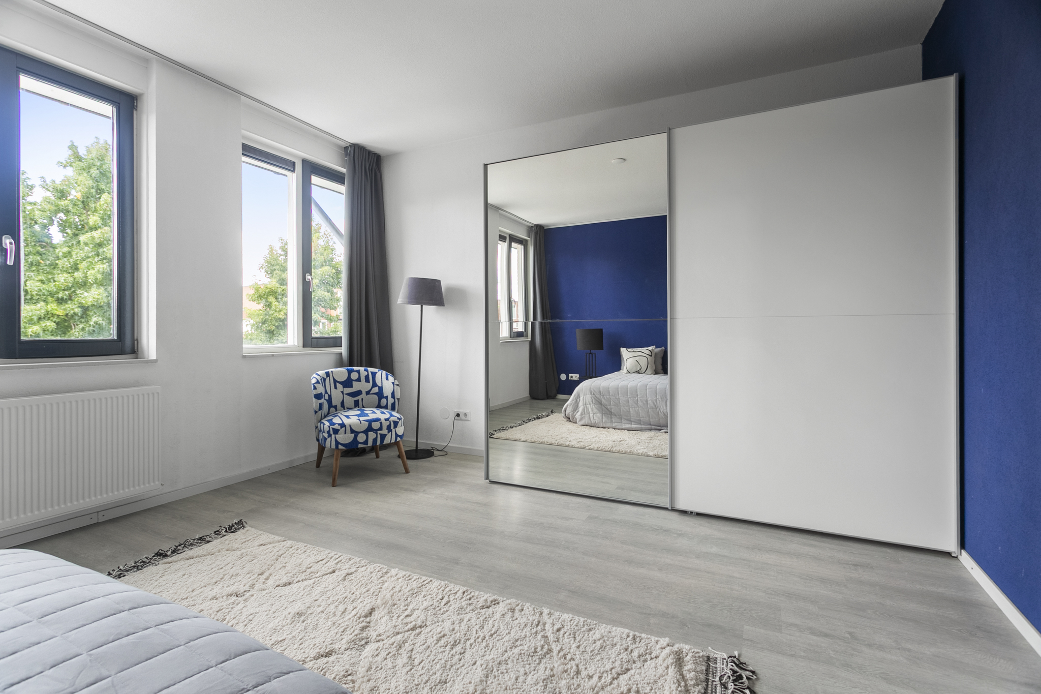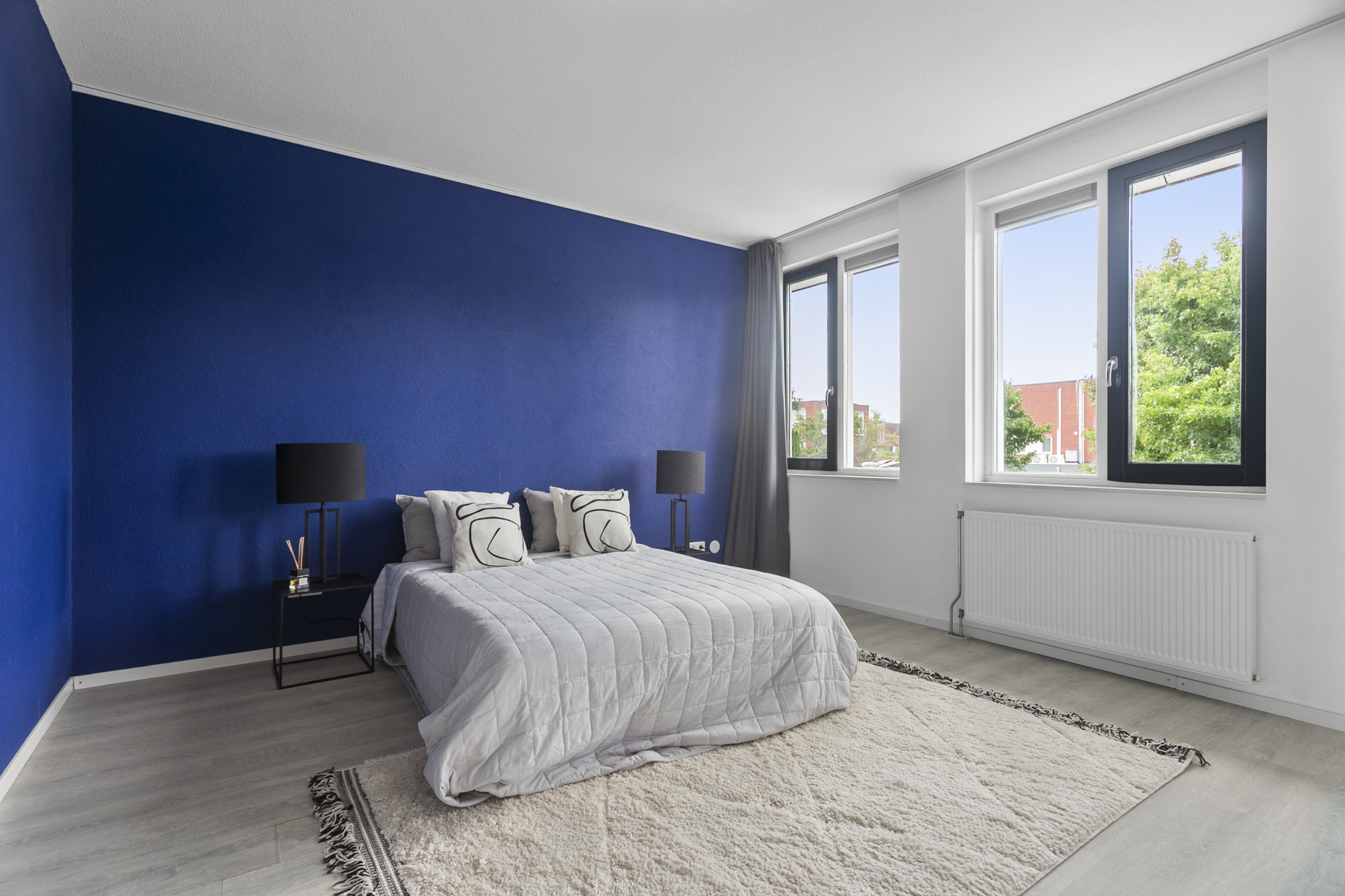 Vanaf de overloop zijn twee opvallend ruime slaapkamers te bereiken, waaronder de master bedroom over de hele breedte van de woning. Deze kamer, met twee donkerblauwe muren en mooi uitzicht naar de tuin, heeft het formaat van een hotelkamer. Ook de slaapkamer aan de voorzijde, ingericht als eenpersoonskamer, is een kamer van goed formaat. Er ligt, net als op de begane grond, een grijze laminaatvloer op bijna de hele verdieping.