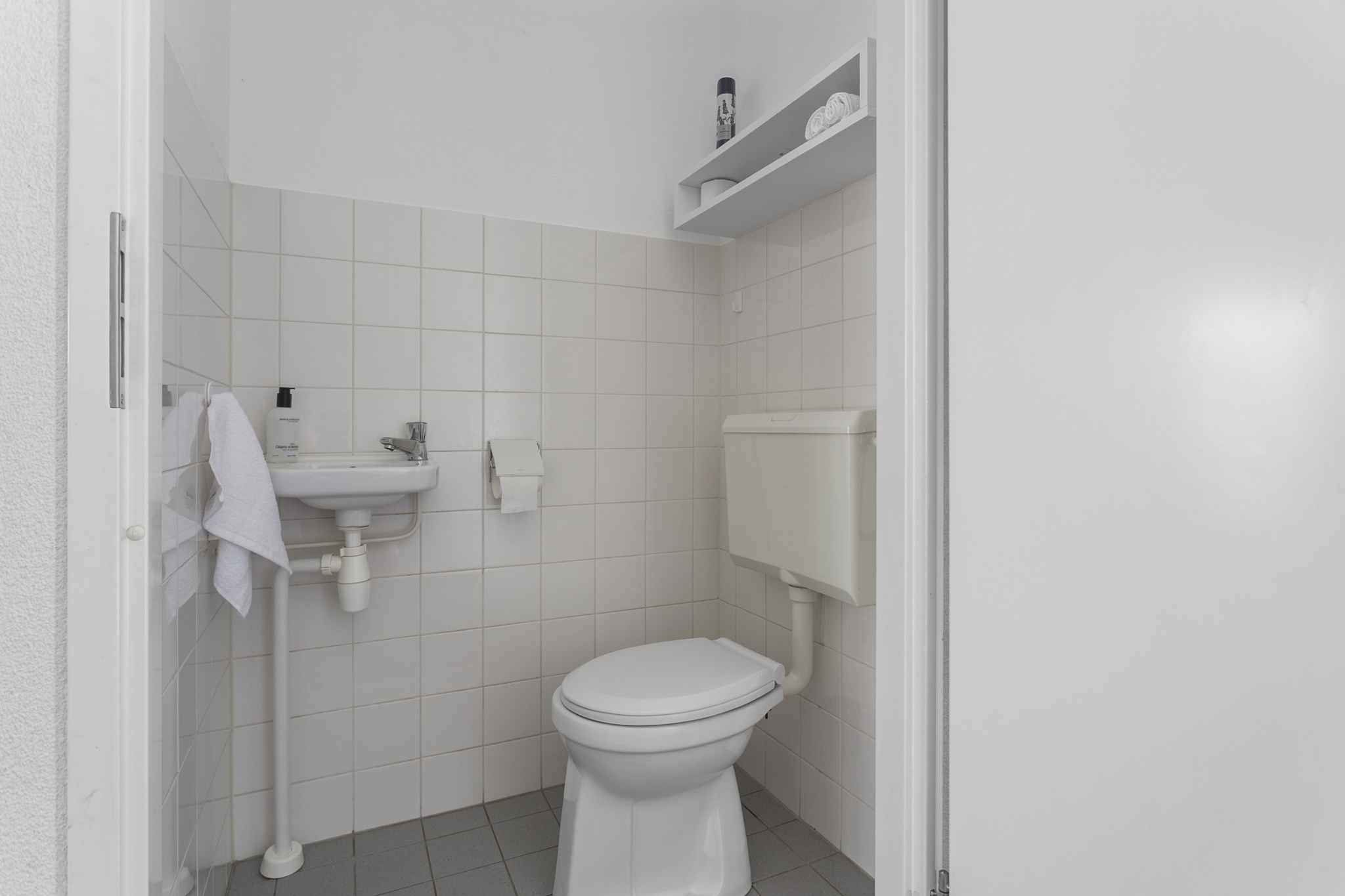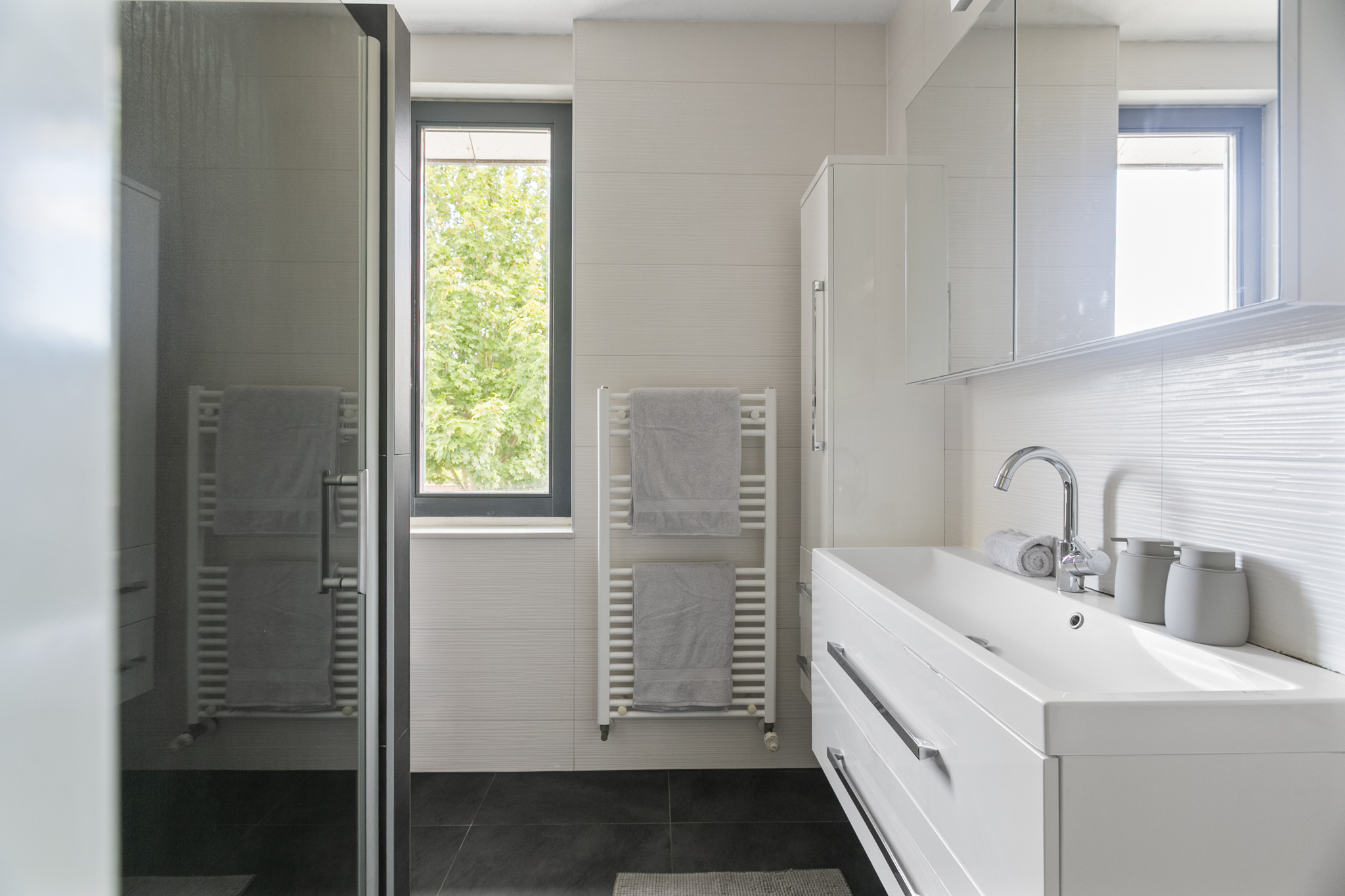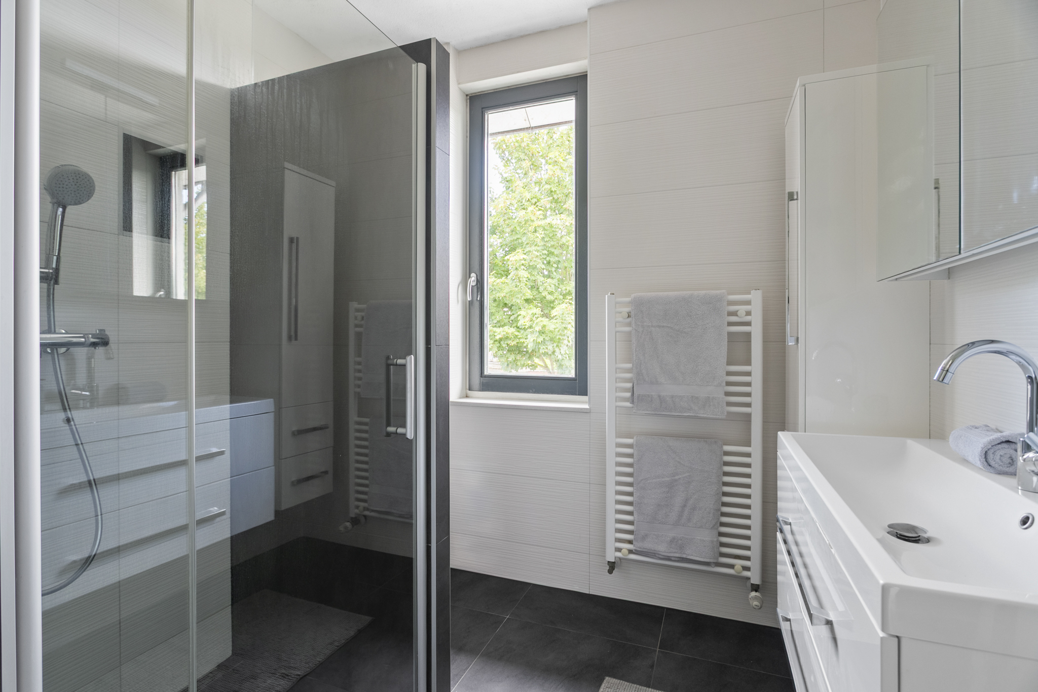 De mooie badkamer, met een groot raam in de voorgevel, heeft een optimale indeling. De lades van het wastafelmeubel, de tweedeurs spiegelkast en de hoge kast bieden meer dan genoeg bergruimte. Verder is de badkamer ingedeeld met een inloopdouche, tweede toilet en een handdoekenradiator.