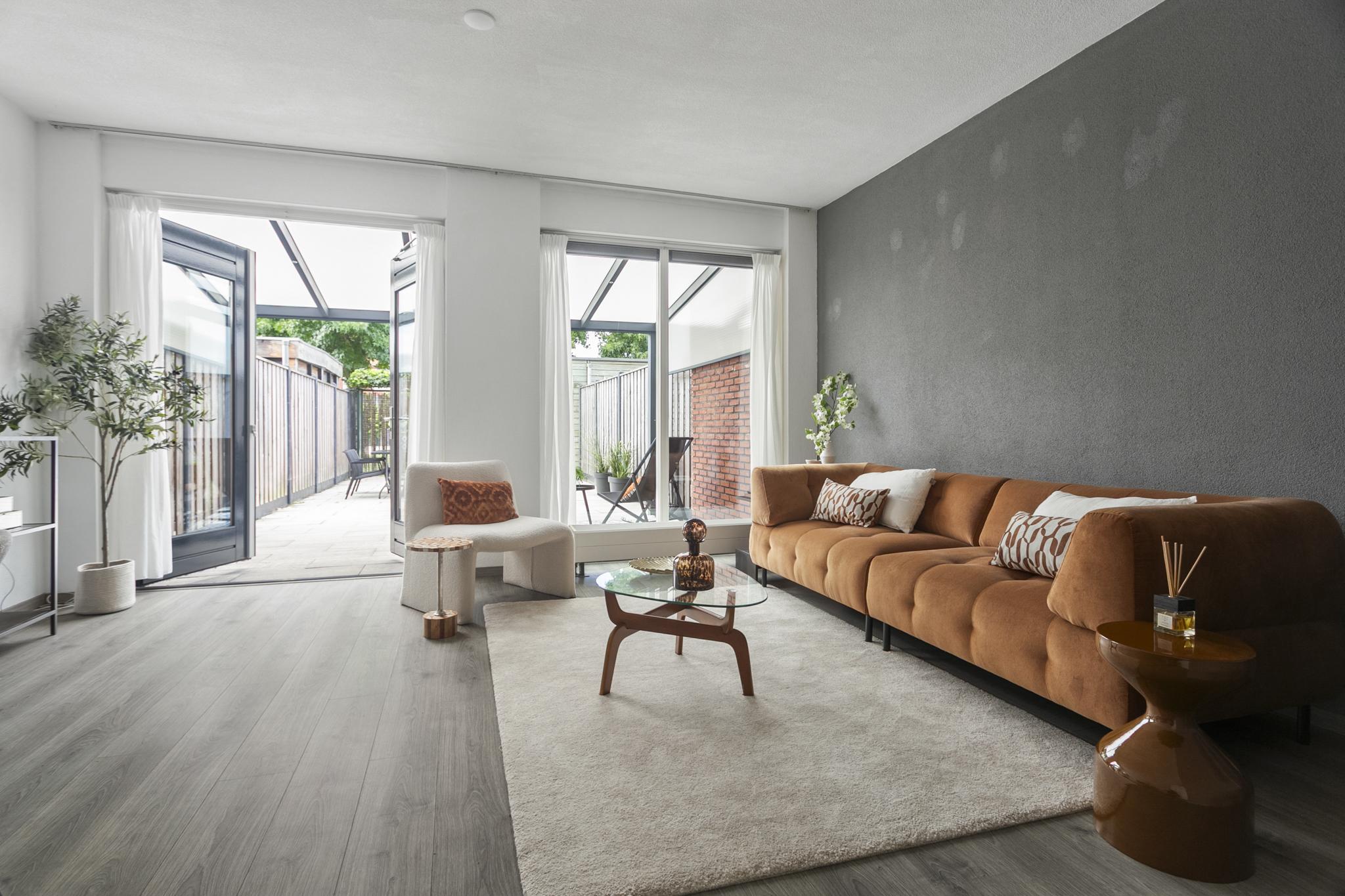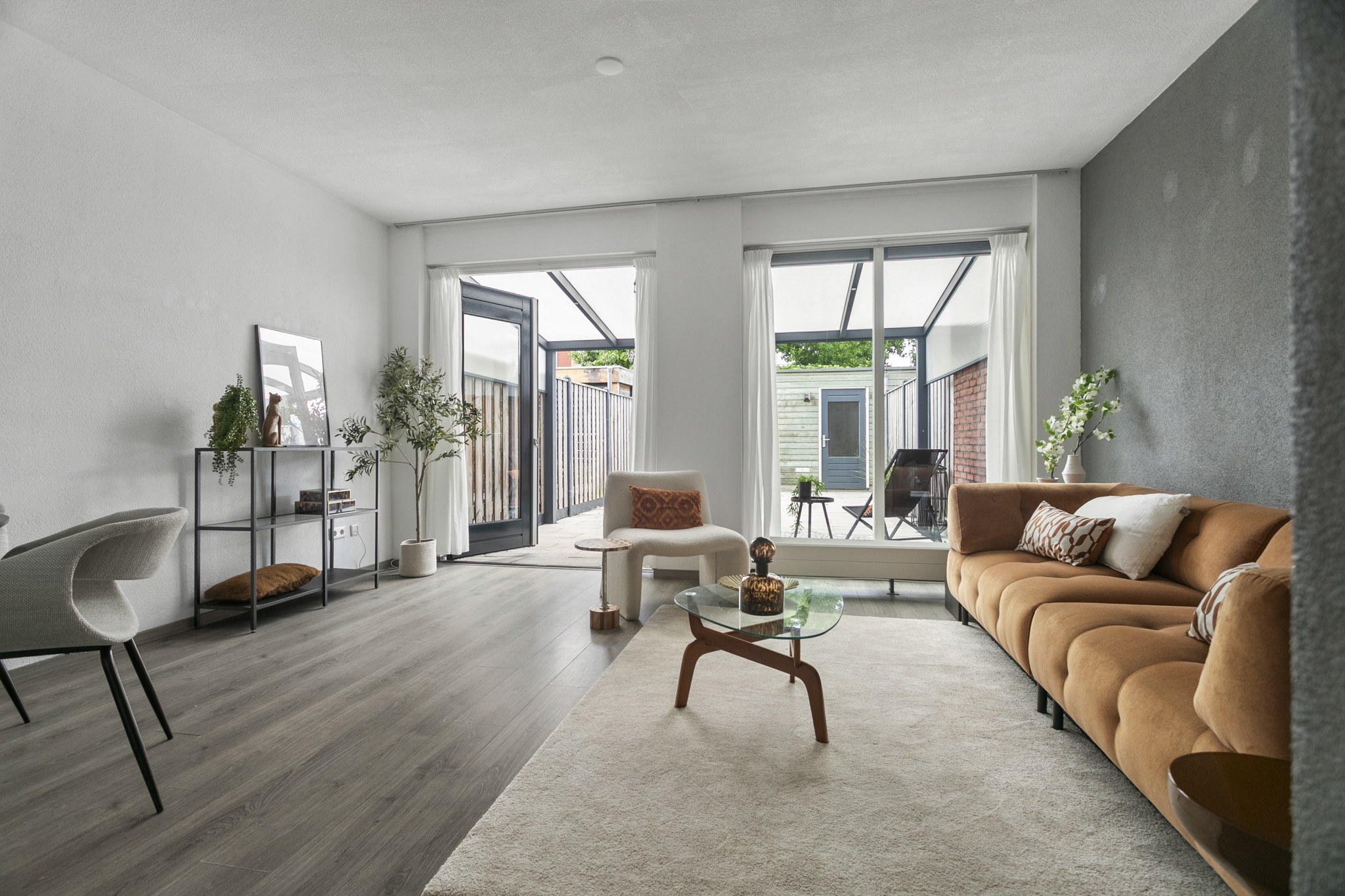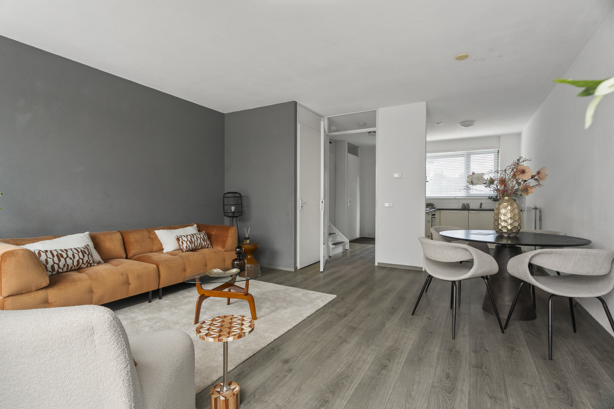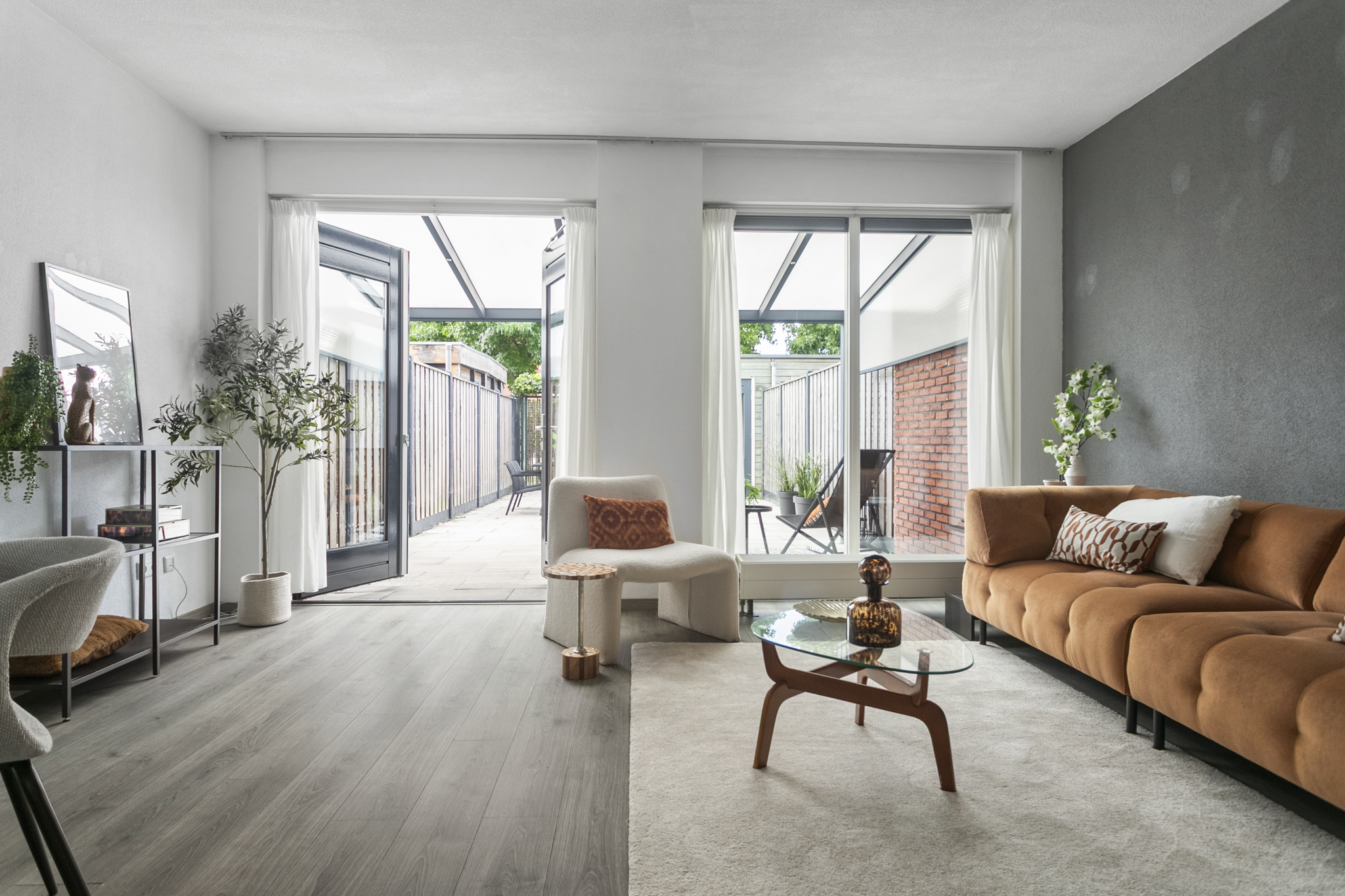 Een groot raam en openslaande tuindeuren, aan de westkant, zorgen voor veel lichtinval in de woonkamer. Met een breedte van 4.85 meter is er genoeg plek voor een fijne zithoek en de eettafel. Bergruimte is er in de bergkast onder de trap, waardoor de woonkamer een hele opgeruimde indruk maakt.