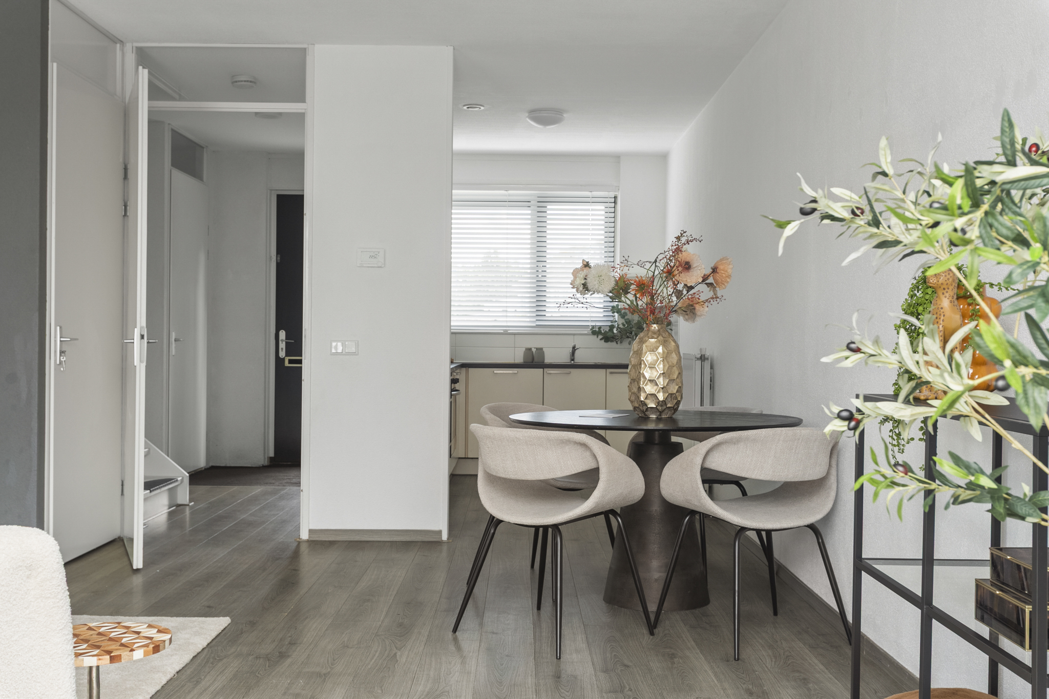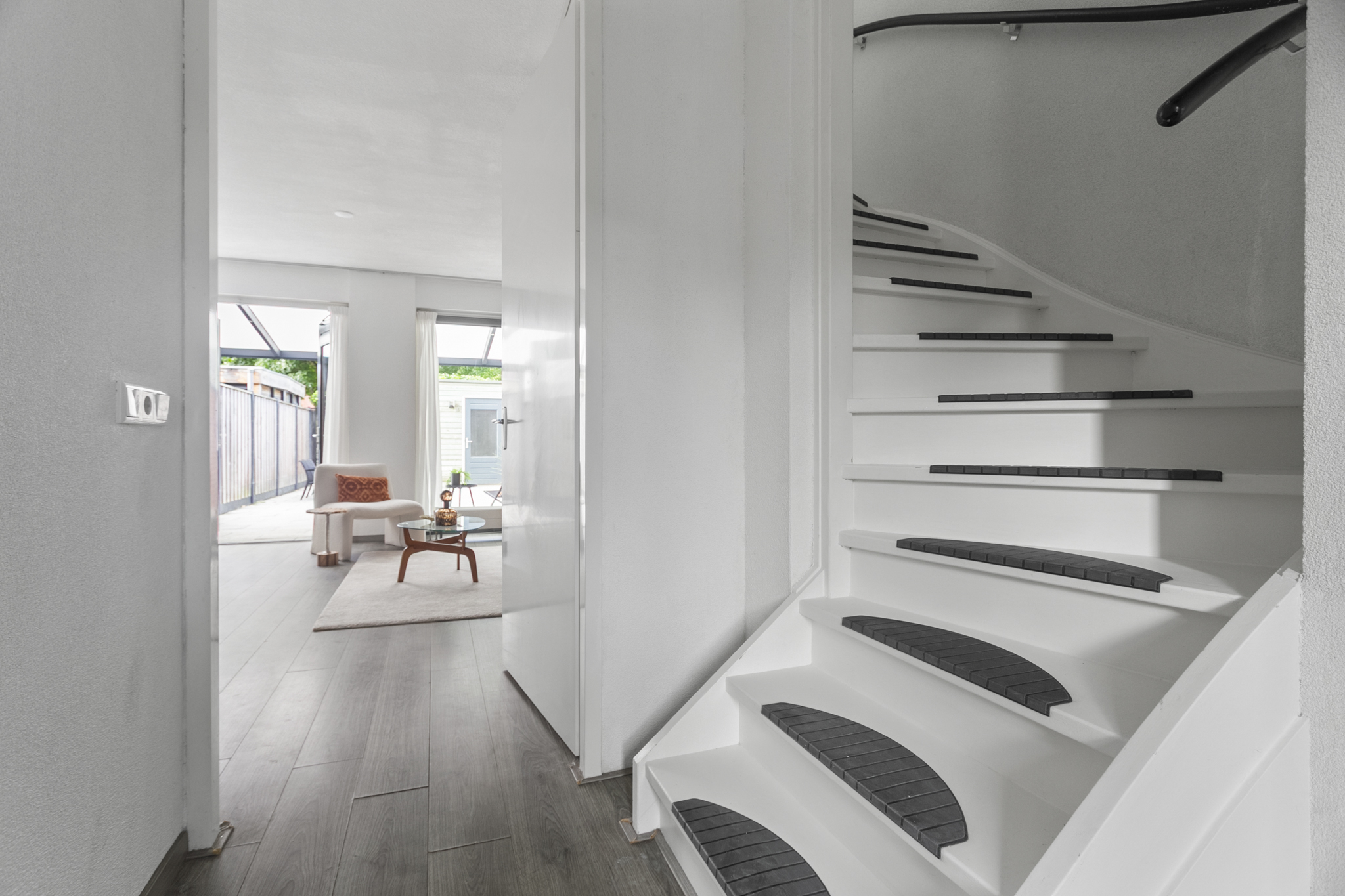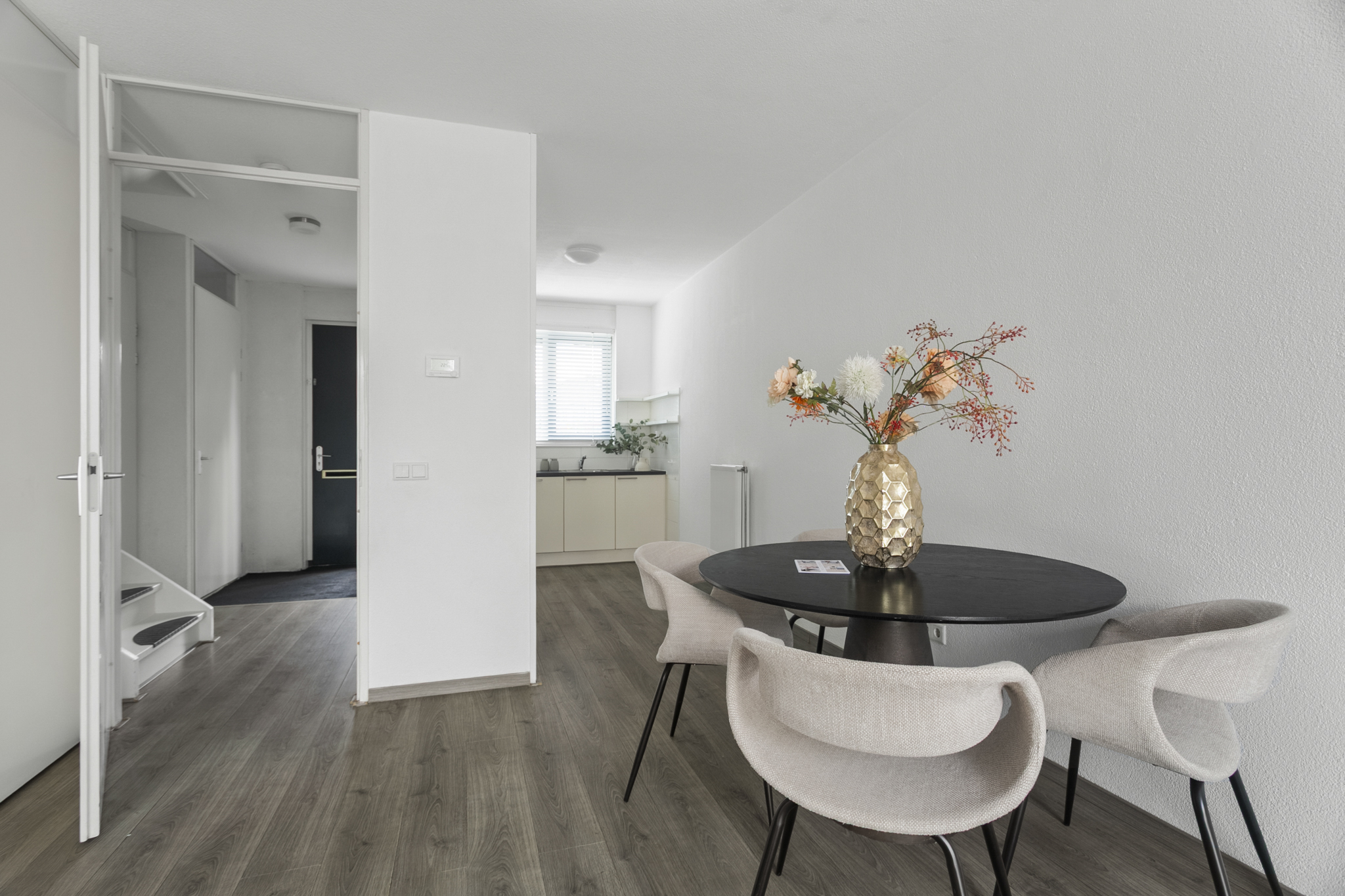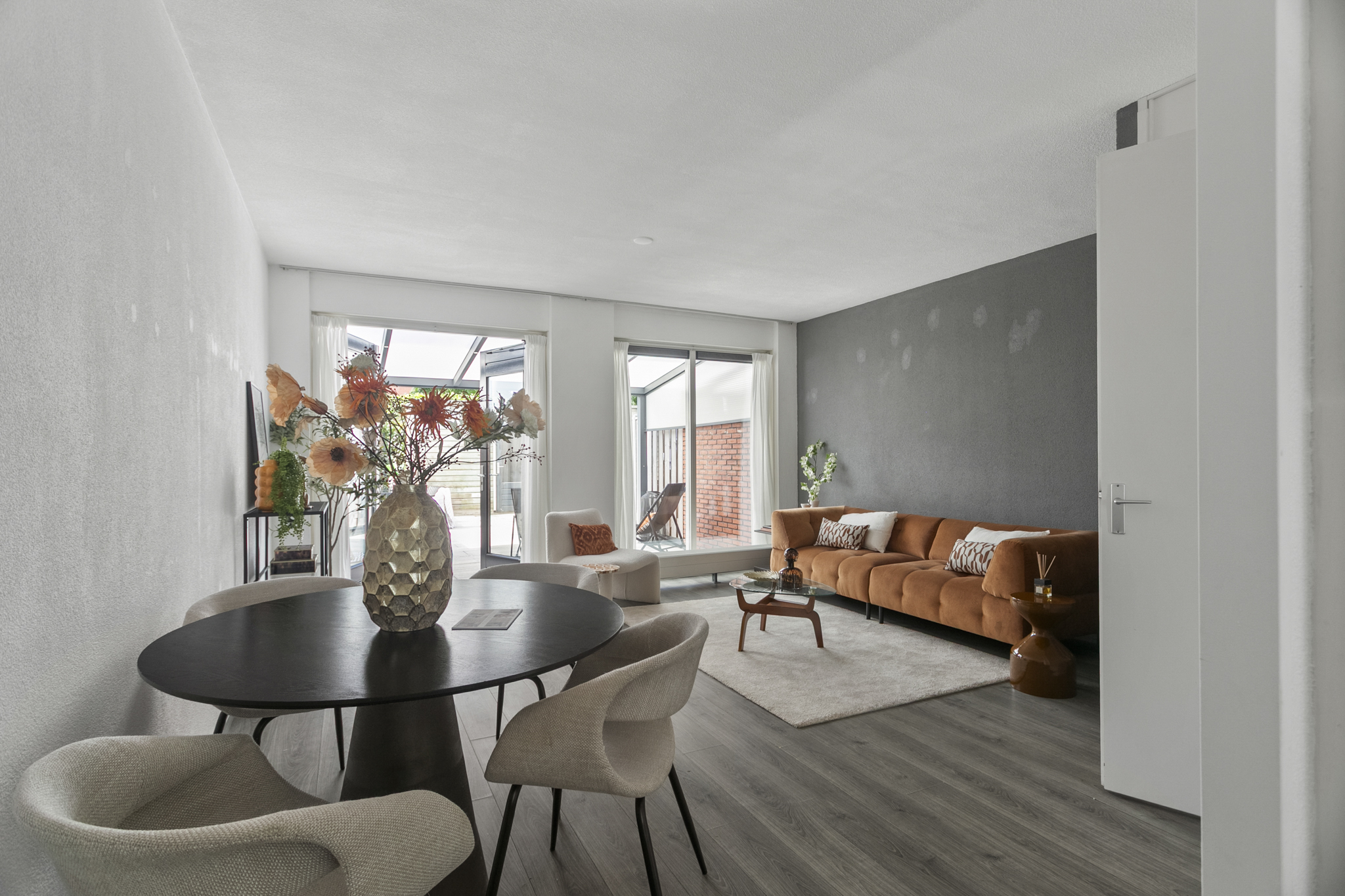 Een groot raam en openslaande tuindeuren, aan de westkant, zorgen voor veel lichtinval in de woonkamer. Met een breedte van 4.85 meter is er genoeg plek voor een fijne zithoek en de eettafel. Bergruimte is er in de bergkast onder de trap, waardoor de woonkamer een hele opgeruimde indruk maakt.