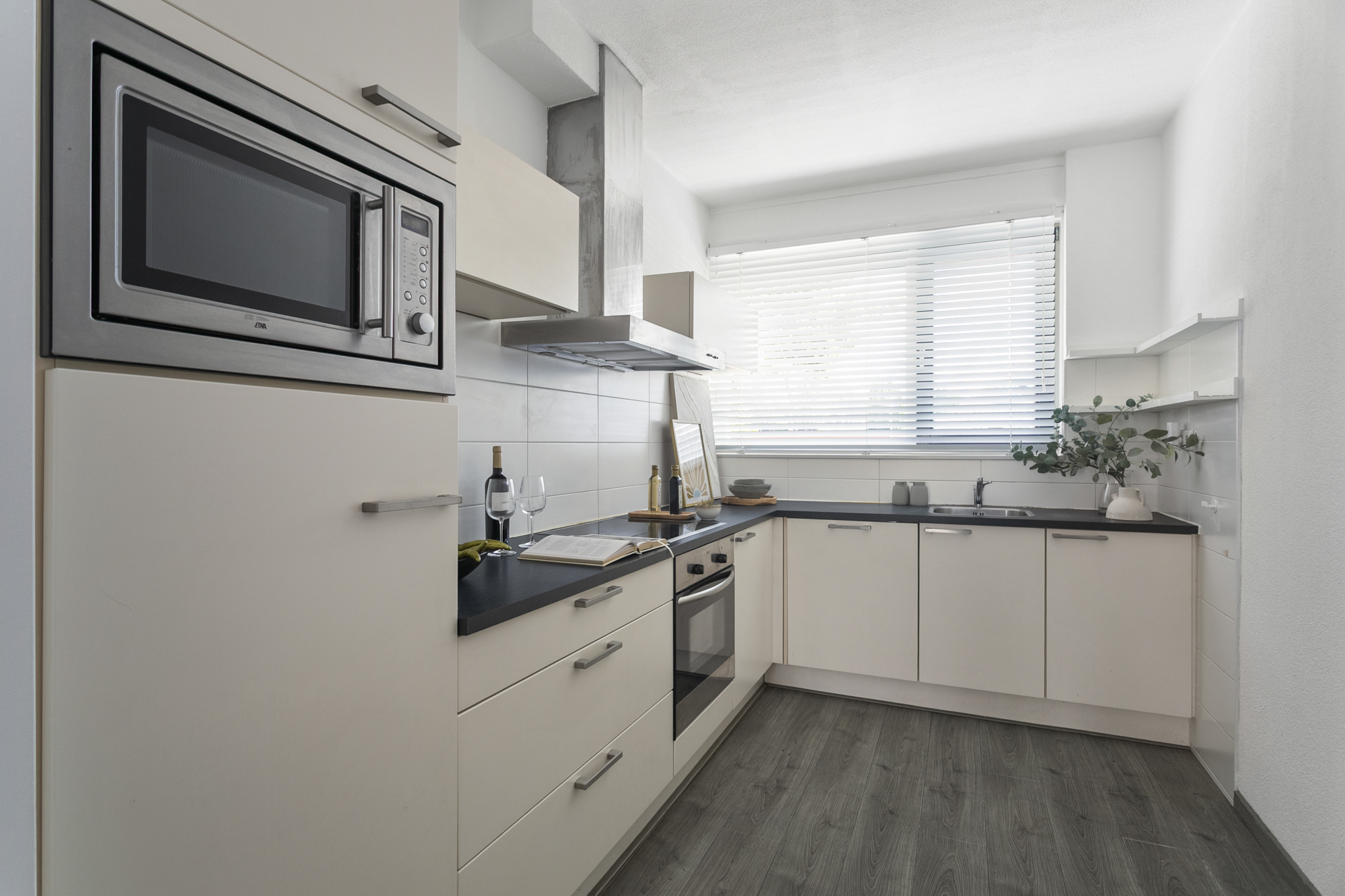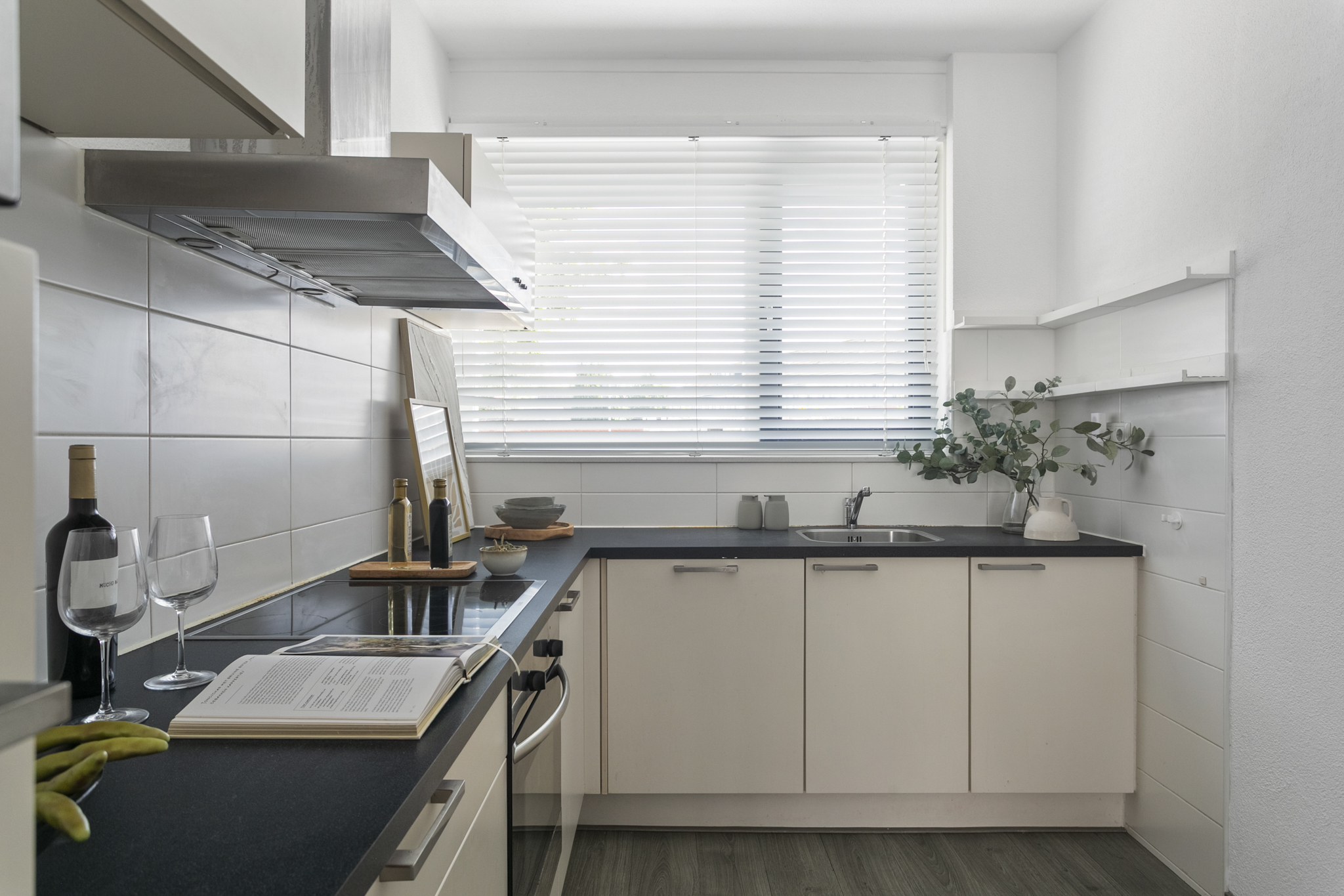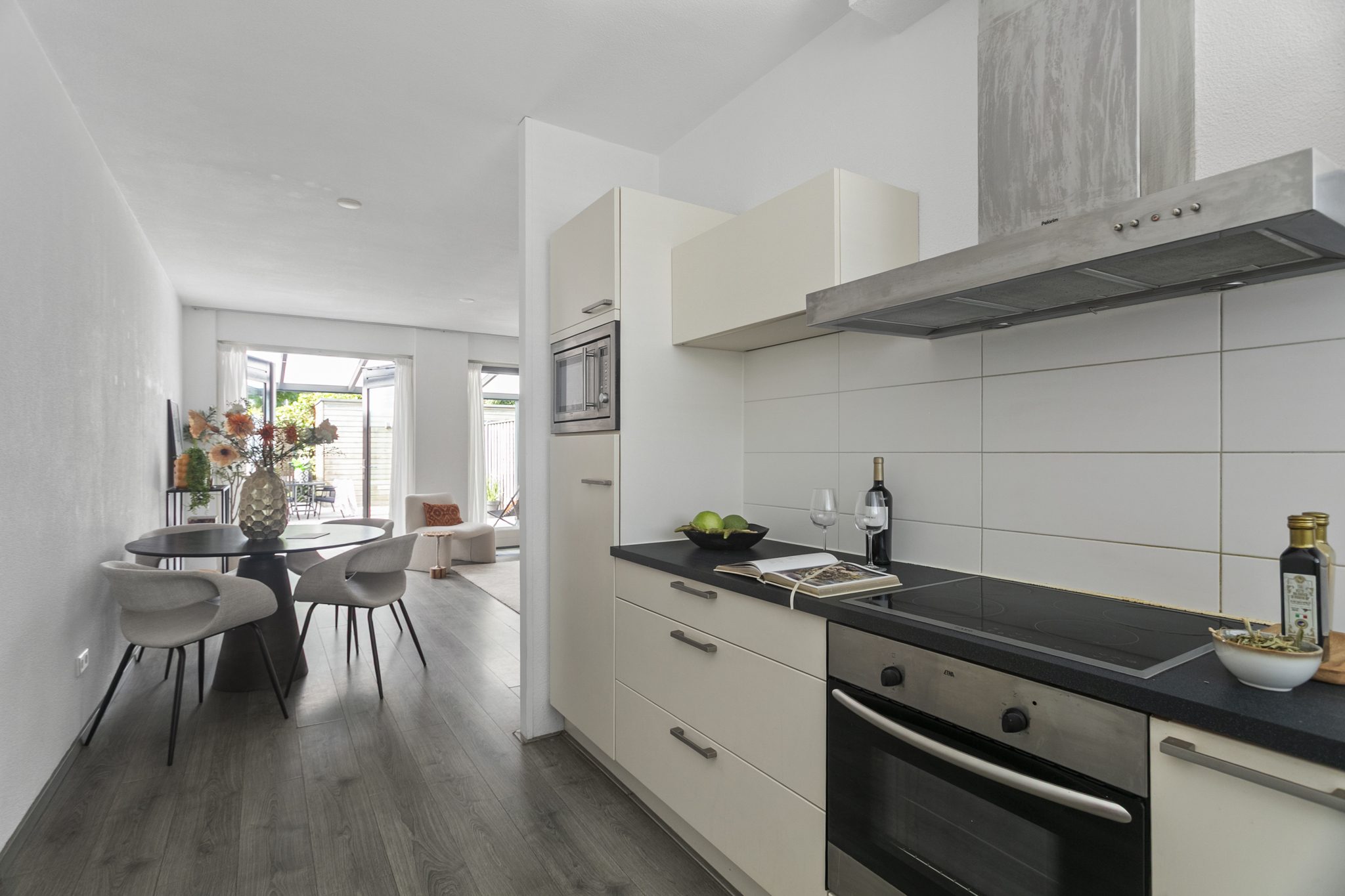 Bij het eetgedeelte is een brede doorgang naar de keuken, waar de fijne ochtendzon naar binnen valt. De lichte hoekopstelling, met een antracietkleurig aanrechtblad, heeft een ingebouwde keramische kookplaat, afzuigkap, oven, magnetron, vaatwasser en een koelkast.