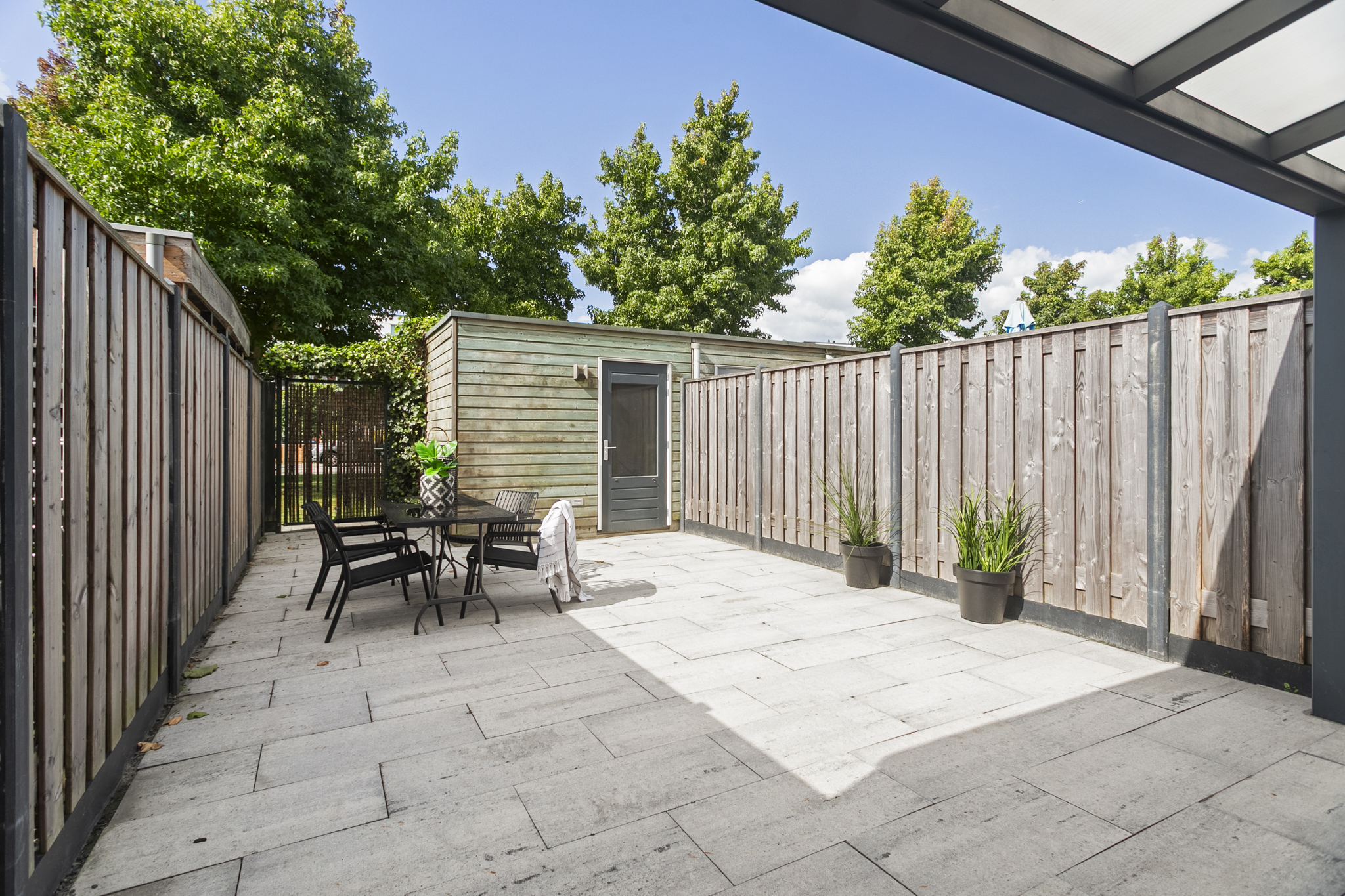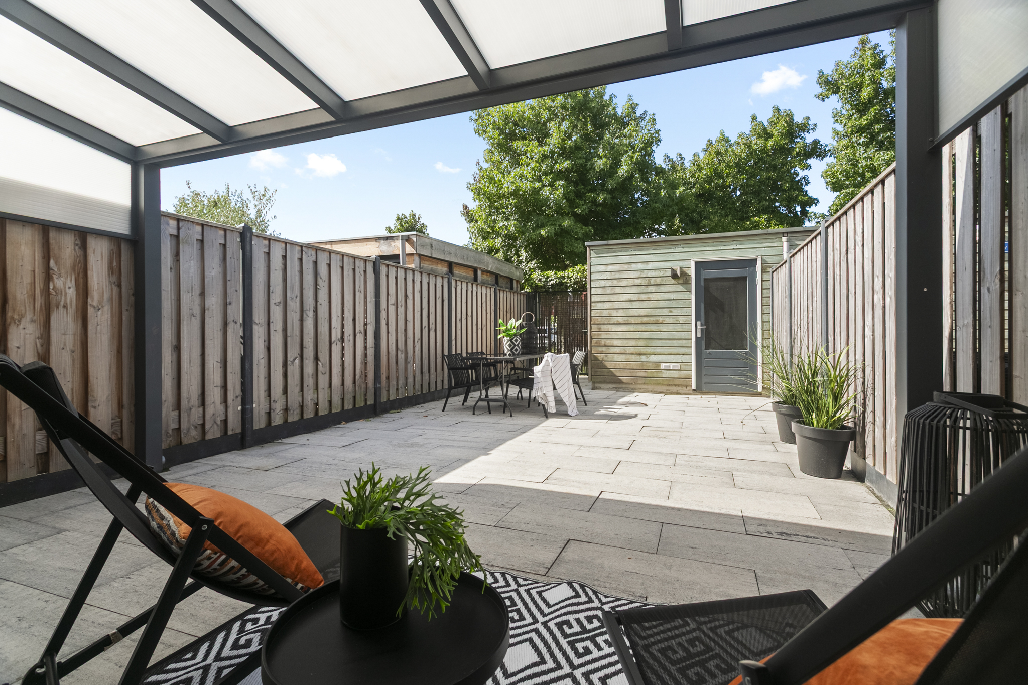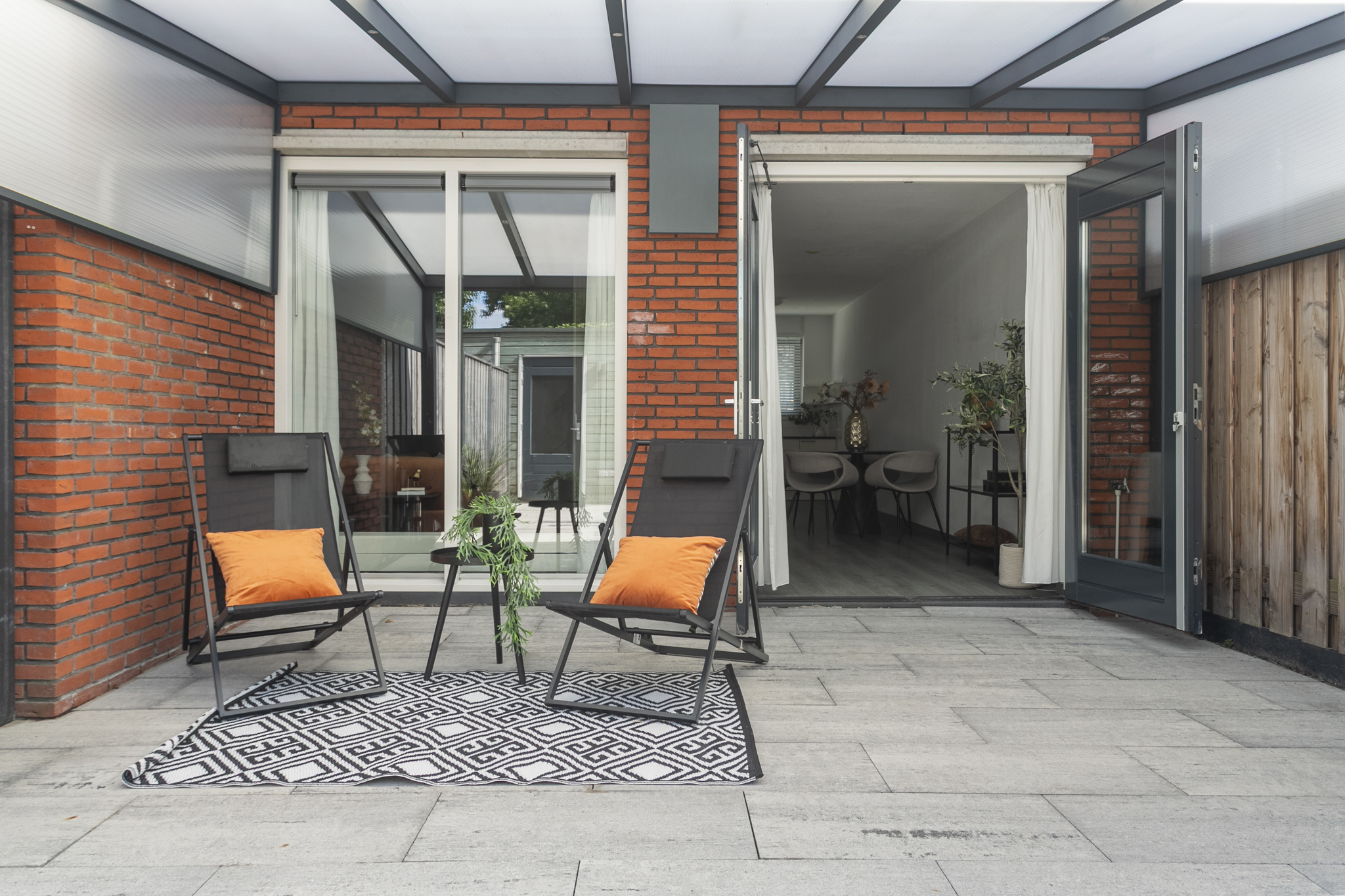 De voortuin, met een mooie omheining, is net als de achtertuin bestraat. In de voortuin geniet je van de ochtend- en middagzon, en vlak daarna is de achtertuin te perfecte plek om lekker buiten te zitten. Blikvanger in de achtertuin is het overdekte terras, met zijpanelen en een buitenkraan. In de berging is ruimte voor de fietsen, en er is een poort naar de achtergelegen rustige Obelixstraat.