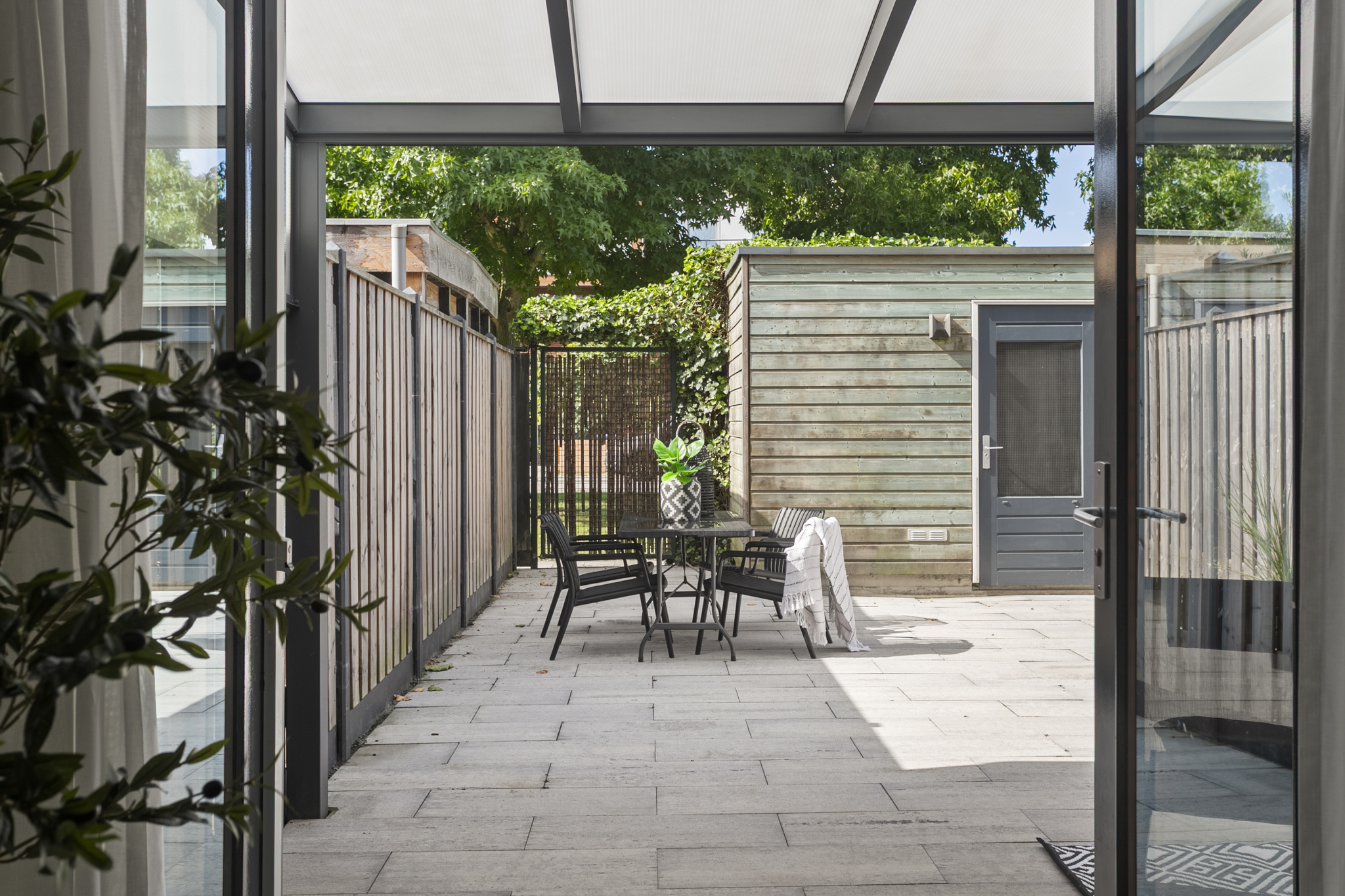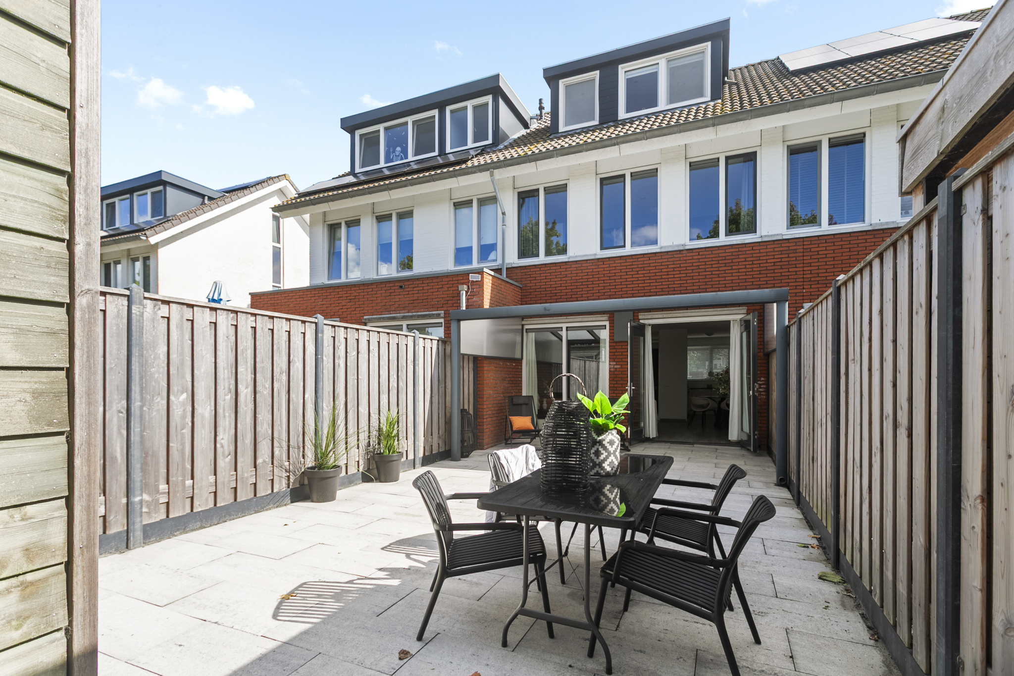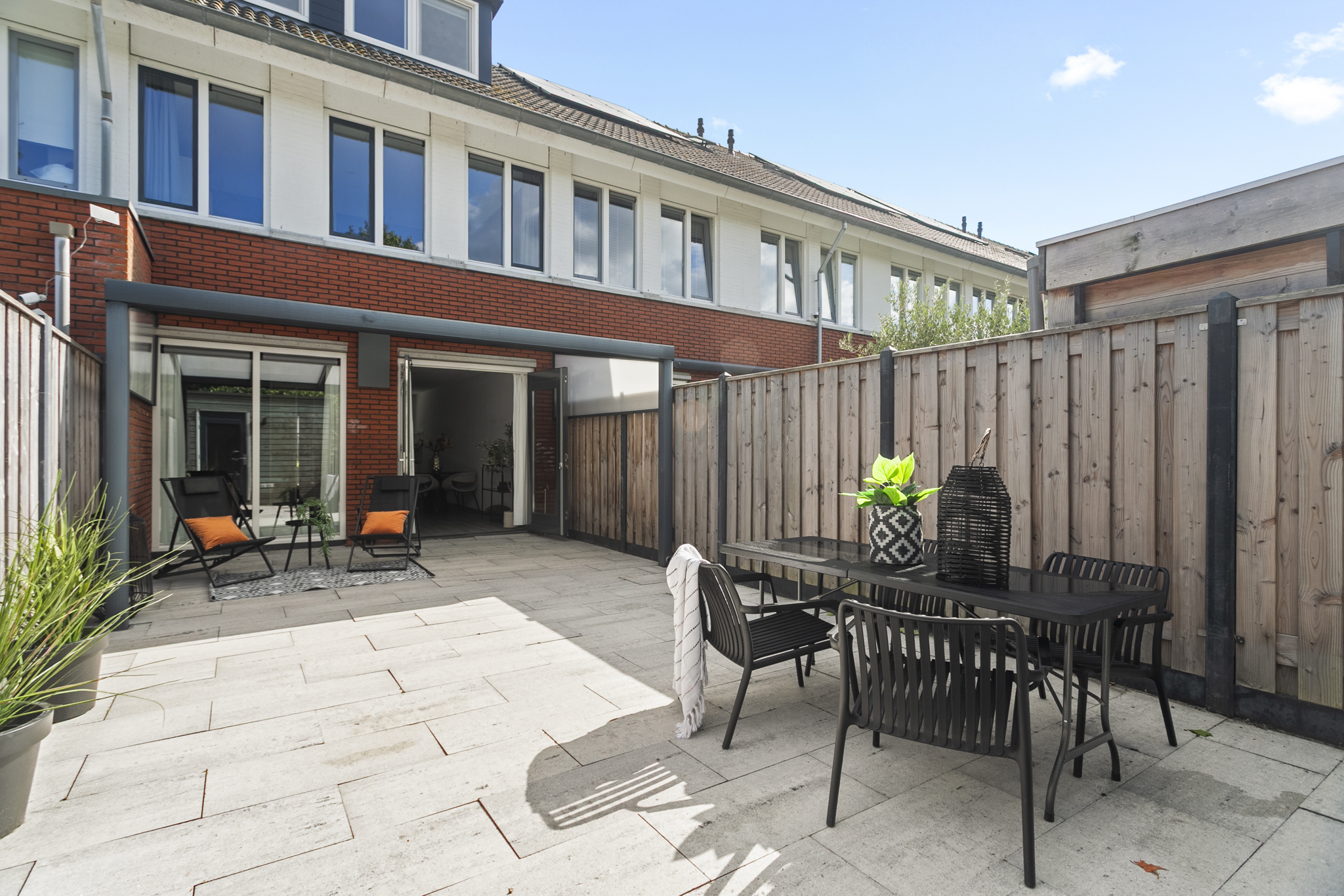 De voortuin, met een mooie omheining, is net als de achtertuin bestraat. In de voortuin geniet je van de ochtend- en middagzon, en vlak daarna is de achtertuin te perfecte plek om lekker buiten te zitten. Blikvanger in de achtertuin is het overdekte terras, met zijpanelen en een buitenkraan. In de berging is ruimte voor de fietsen, en er is een poort naar de achtergelegen rustige Obelixstraat.