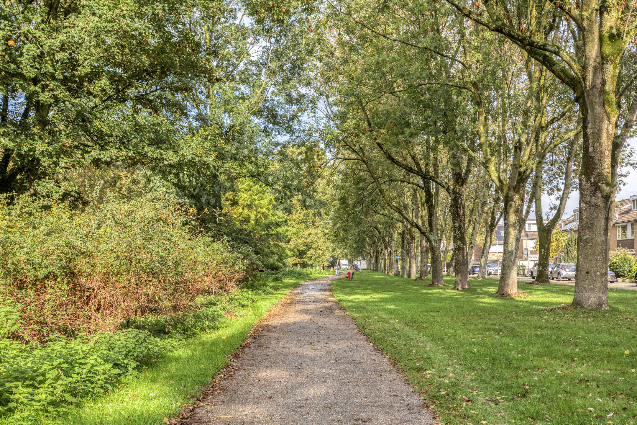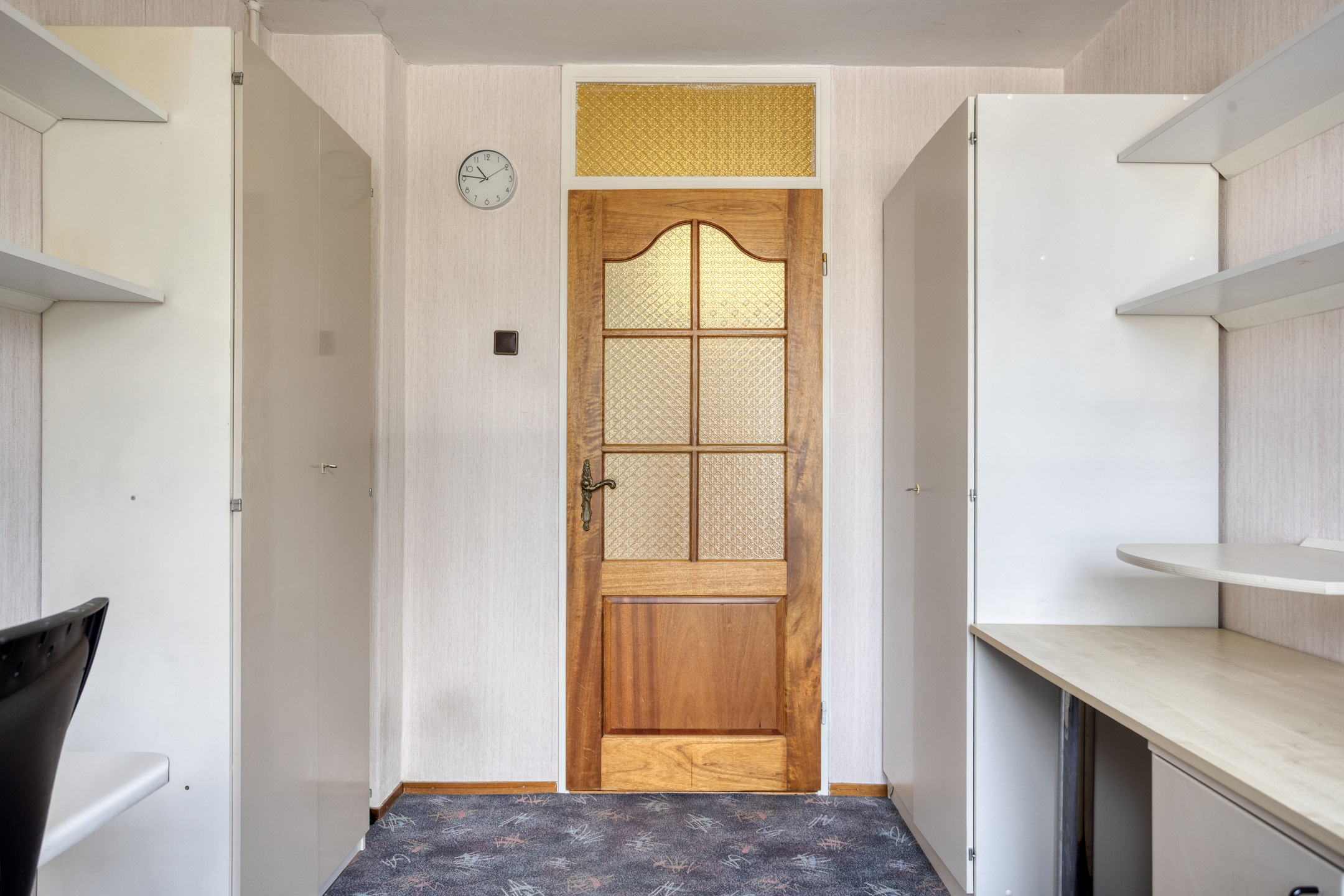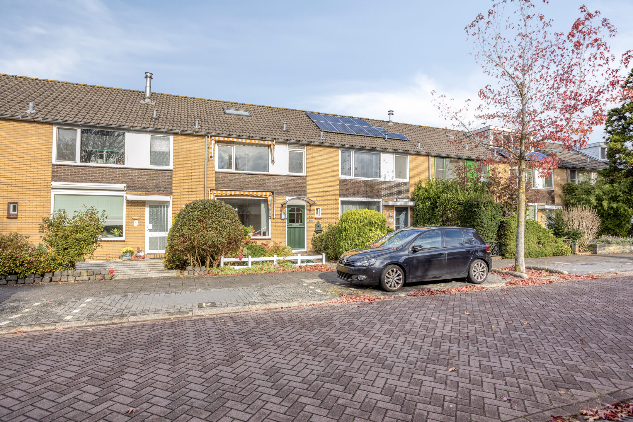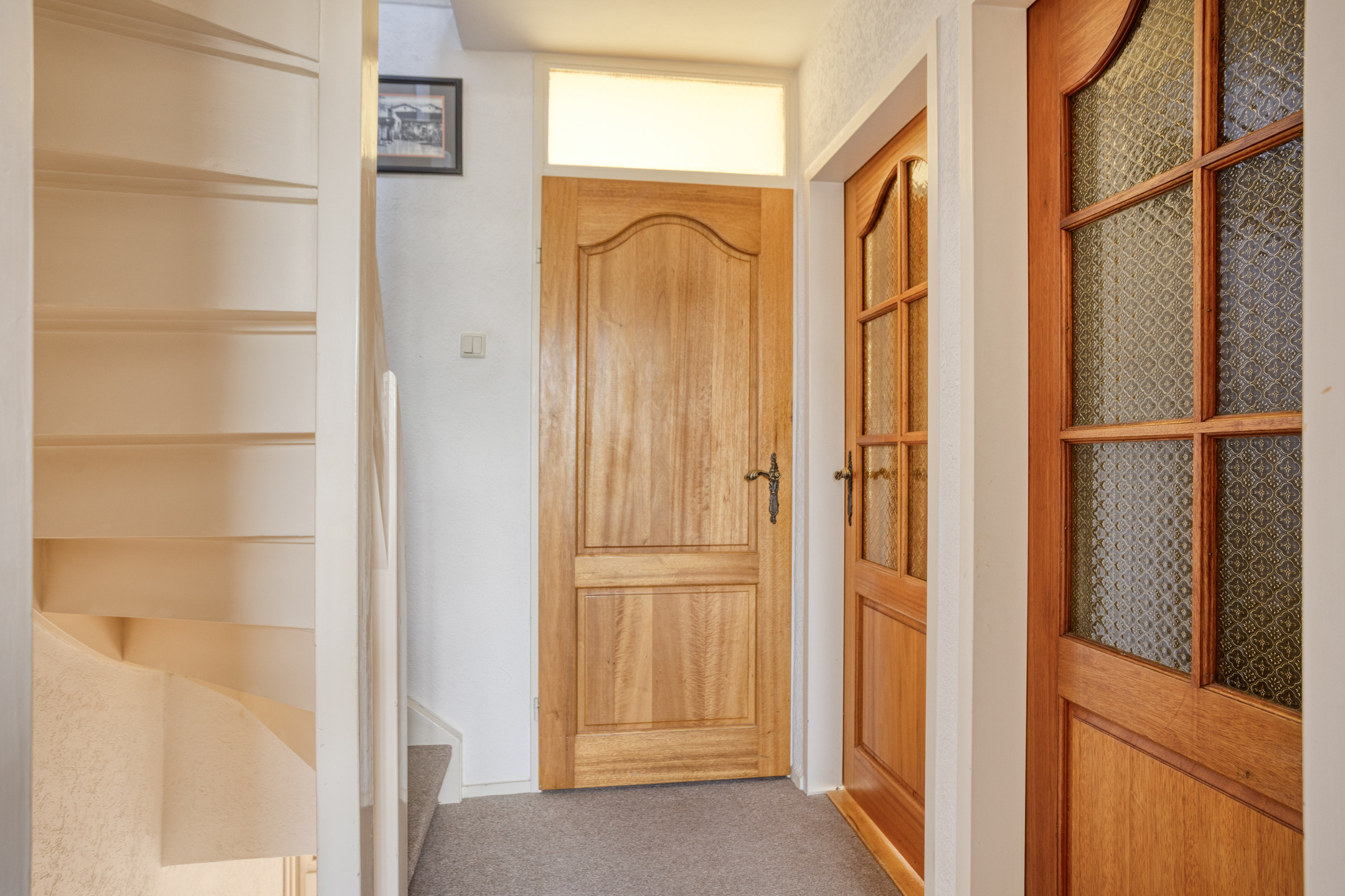 Dit huis herken je niet alleen aan de groene voordeur, maar ook aan de markies zonwering aan de voorzijde. Via het paadje in de voortuin loop je naar de overdekte entree en vervolgens de hal in. Hier zijn de meterkast, de trapopgang met bergkast en de toiletruimte met fonteintje.