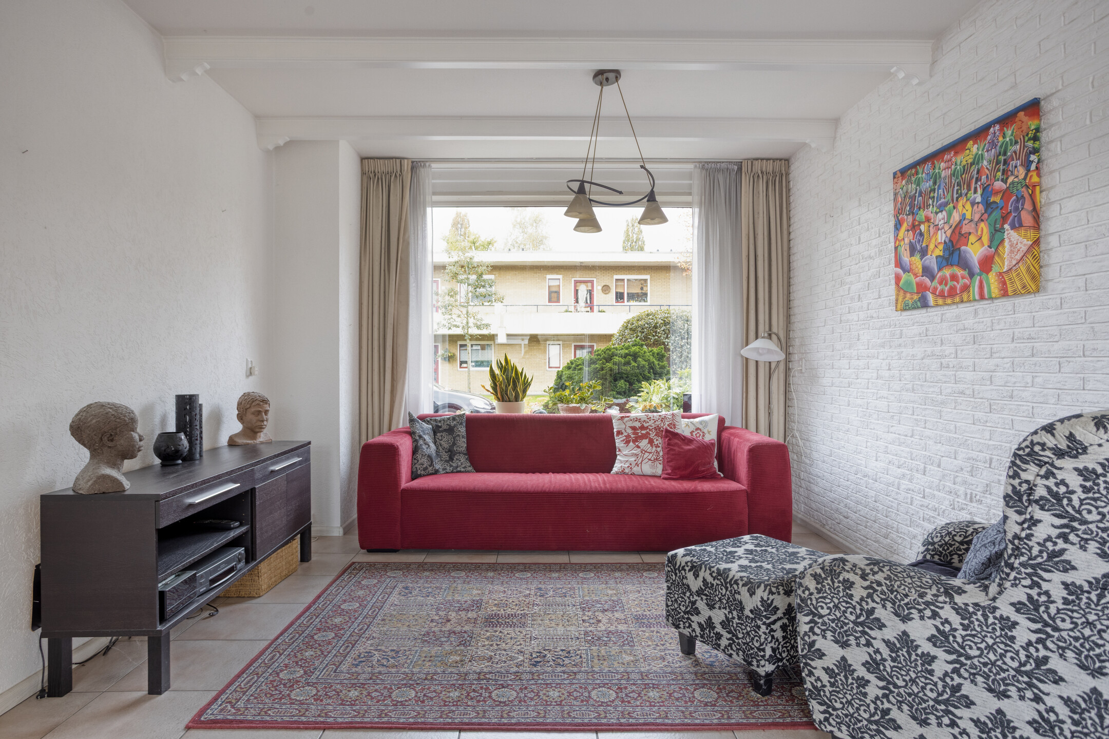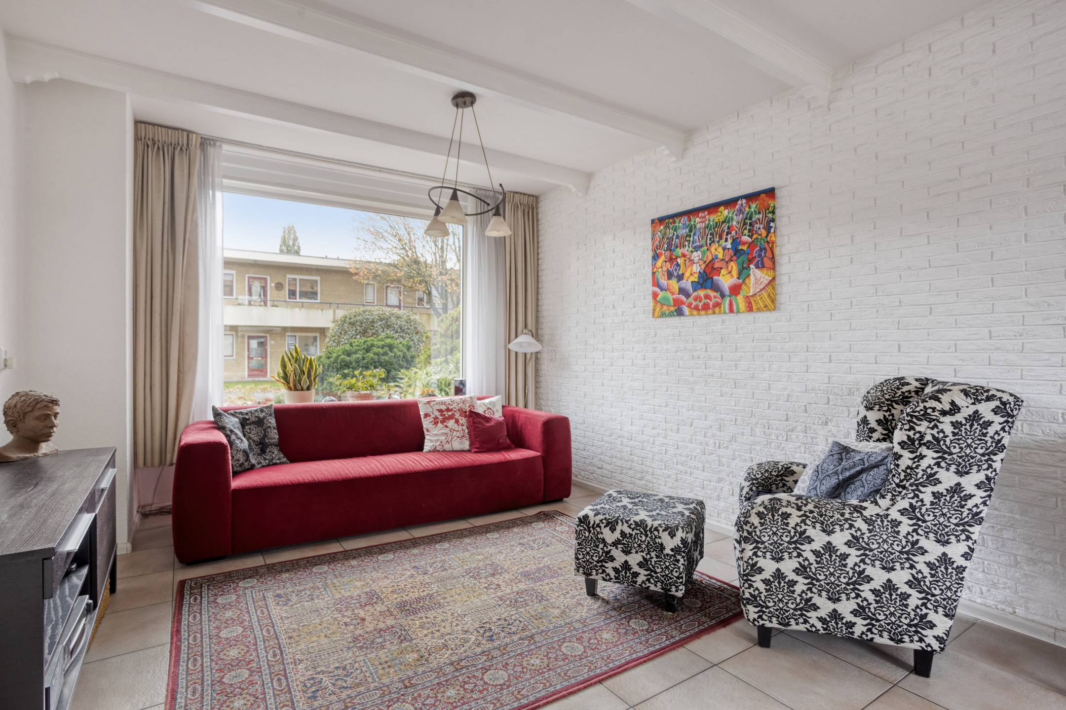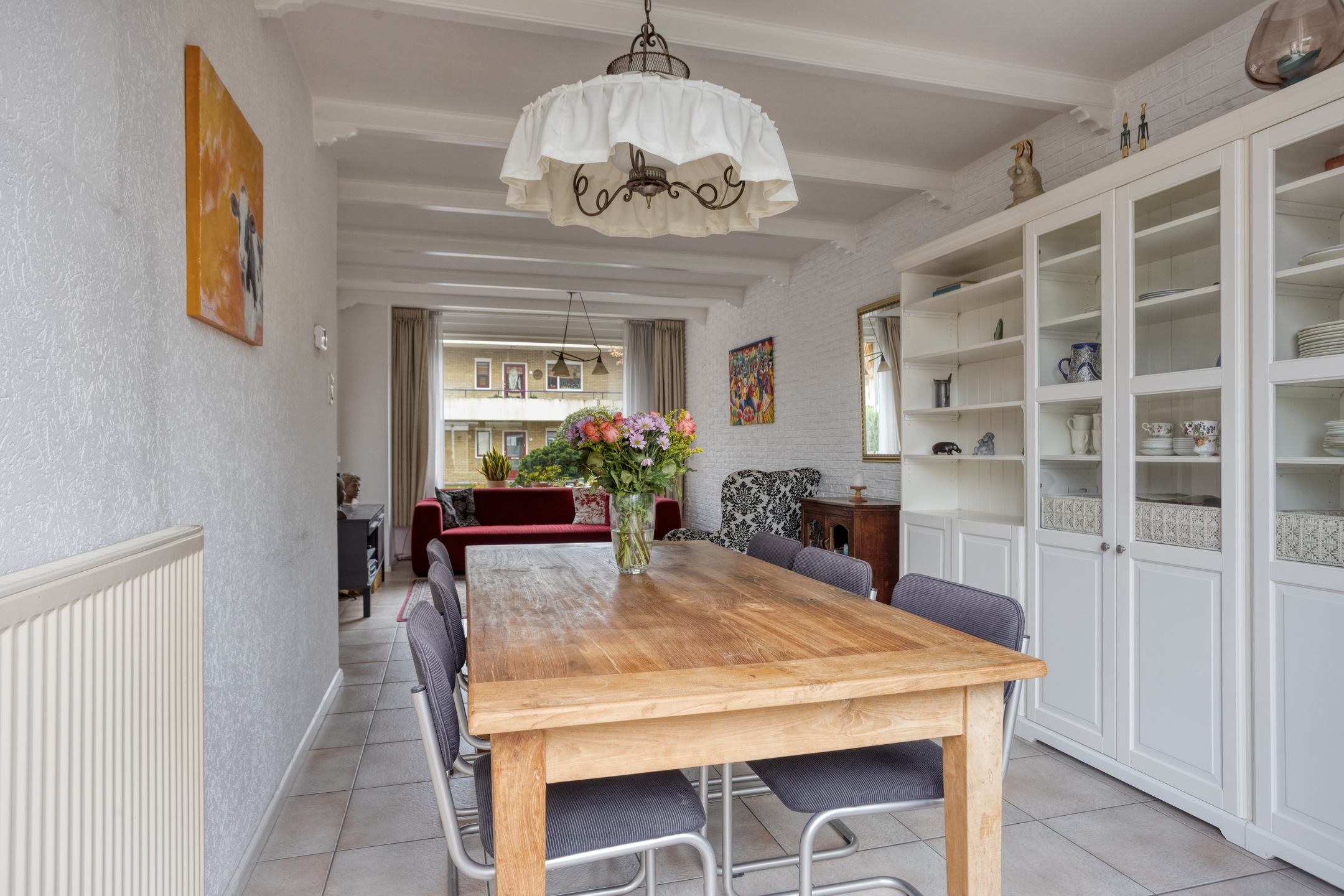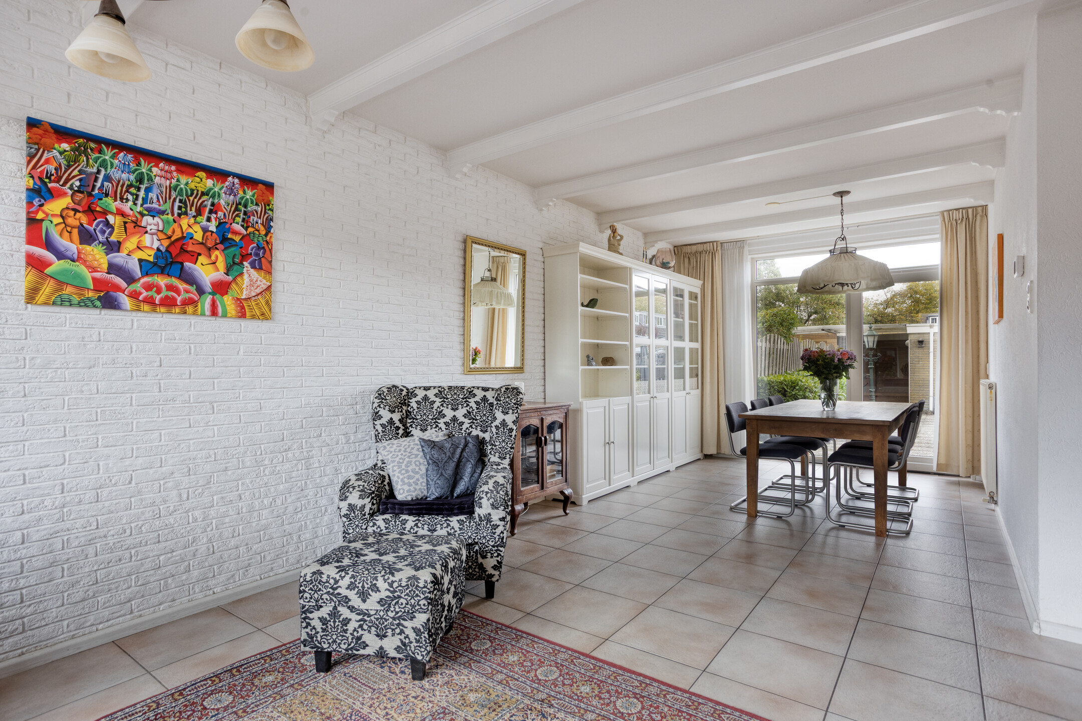 Aan het einde van de hal kun je rechtdoor de keuken in en links naar de woonkamer. De meer dan 8 meter lange woonkamer heeft grote ramen aan de voor- en achterzijde, een deur naar de achtertuin en mooi uitzicht naar de rustige straat. De tegelvloer, wanden en het balkenplafond zijn in een lichte kleur waardoor de woonkamer heel ruimtelijk oogt.