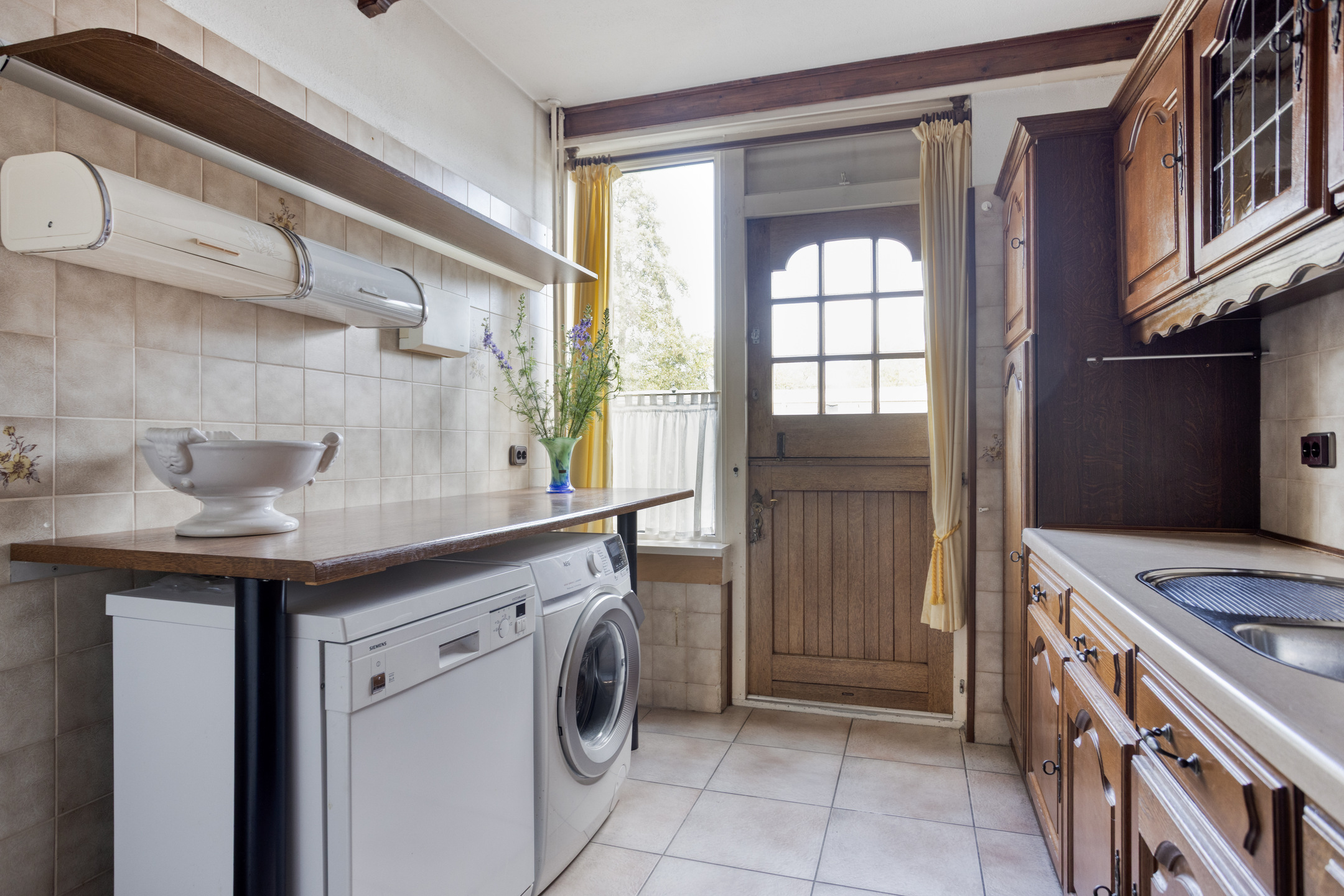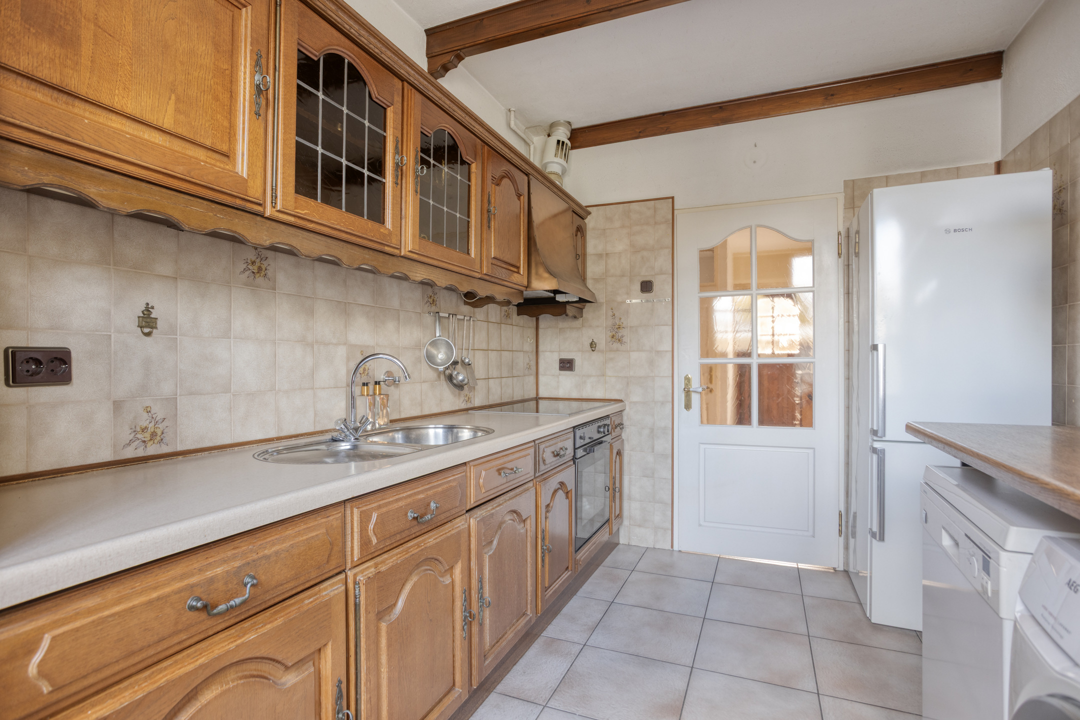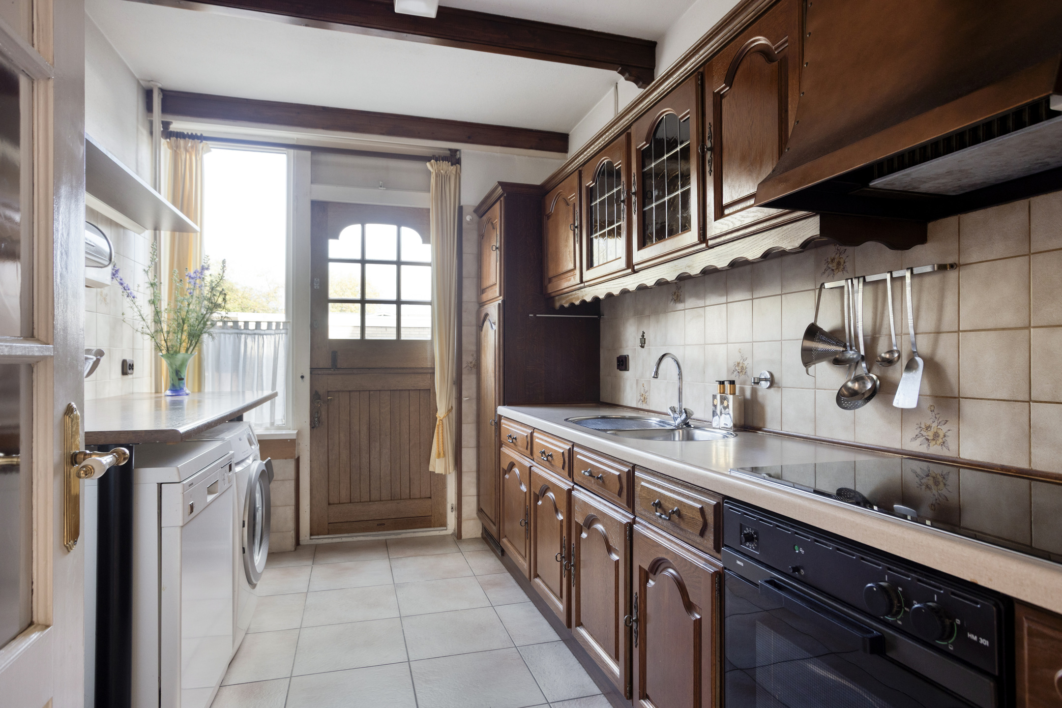 Naast de woonkamer is de dichte keuken, waar een eiken wandopstelling staat. De inductie kookplaat, afzuigkap, oven en koelkast zijn ingebouwd. Voor de wasmachine en vaatwasser zijn de benodigde aansluitingen aanwezig.