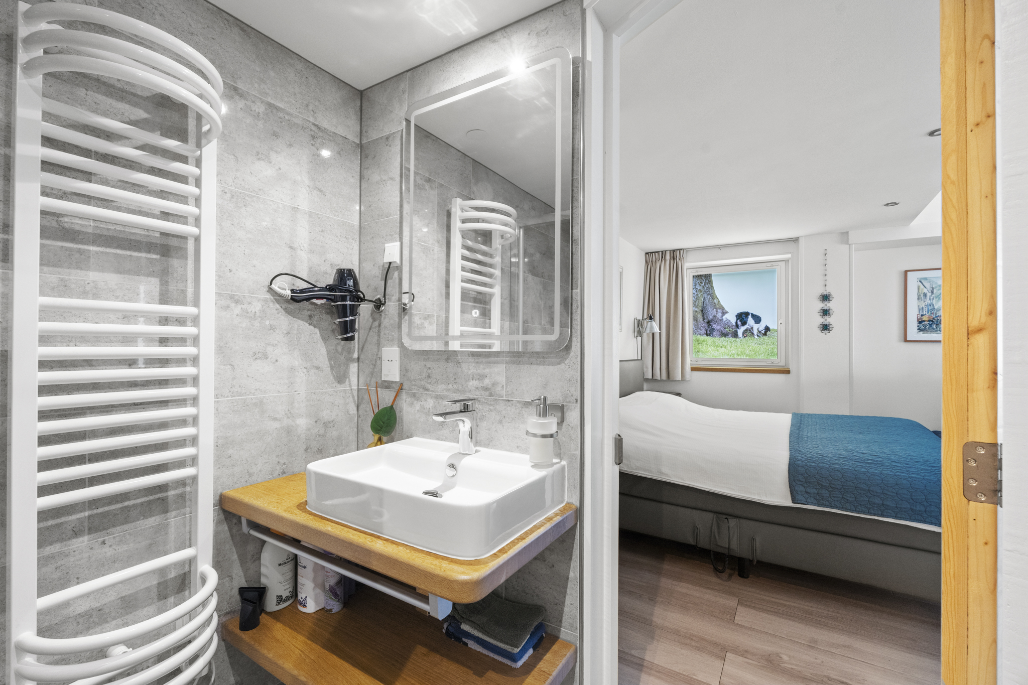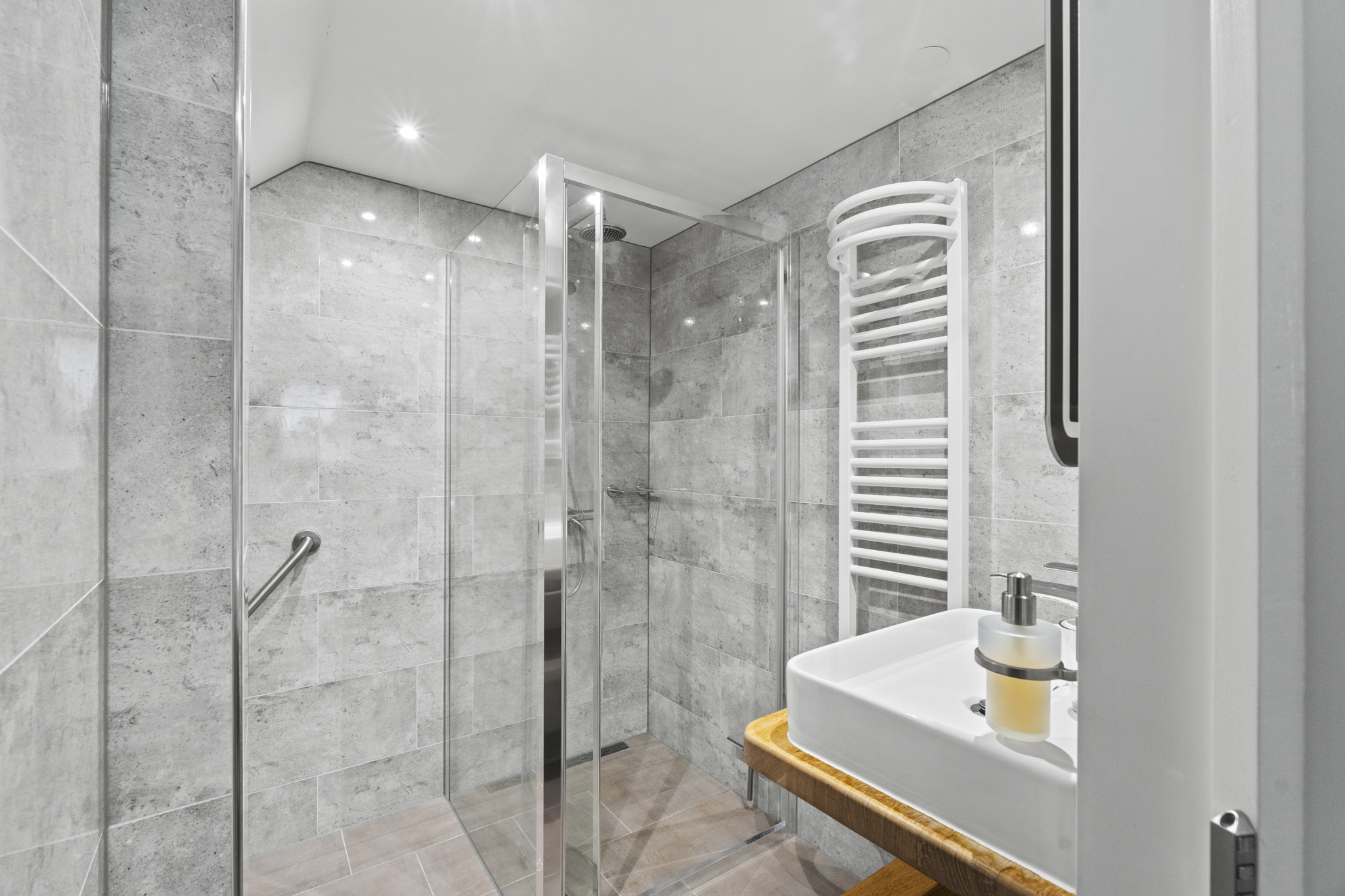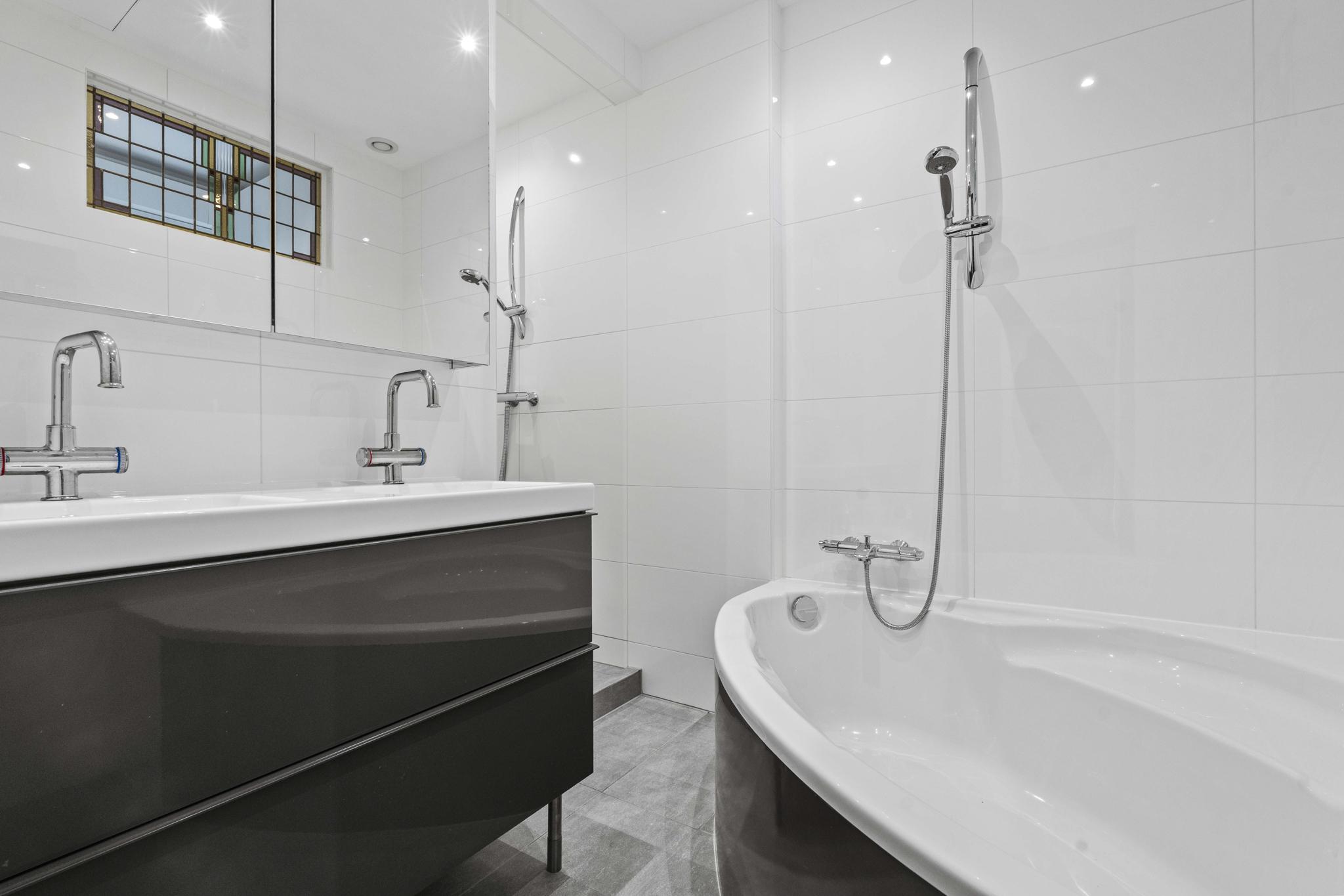 - Badkamer met ligbad, inloop douche, dubbele wastafel, elektrische vloerverwarming en mechanische ventilatie