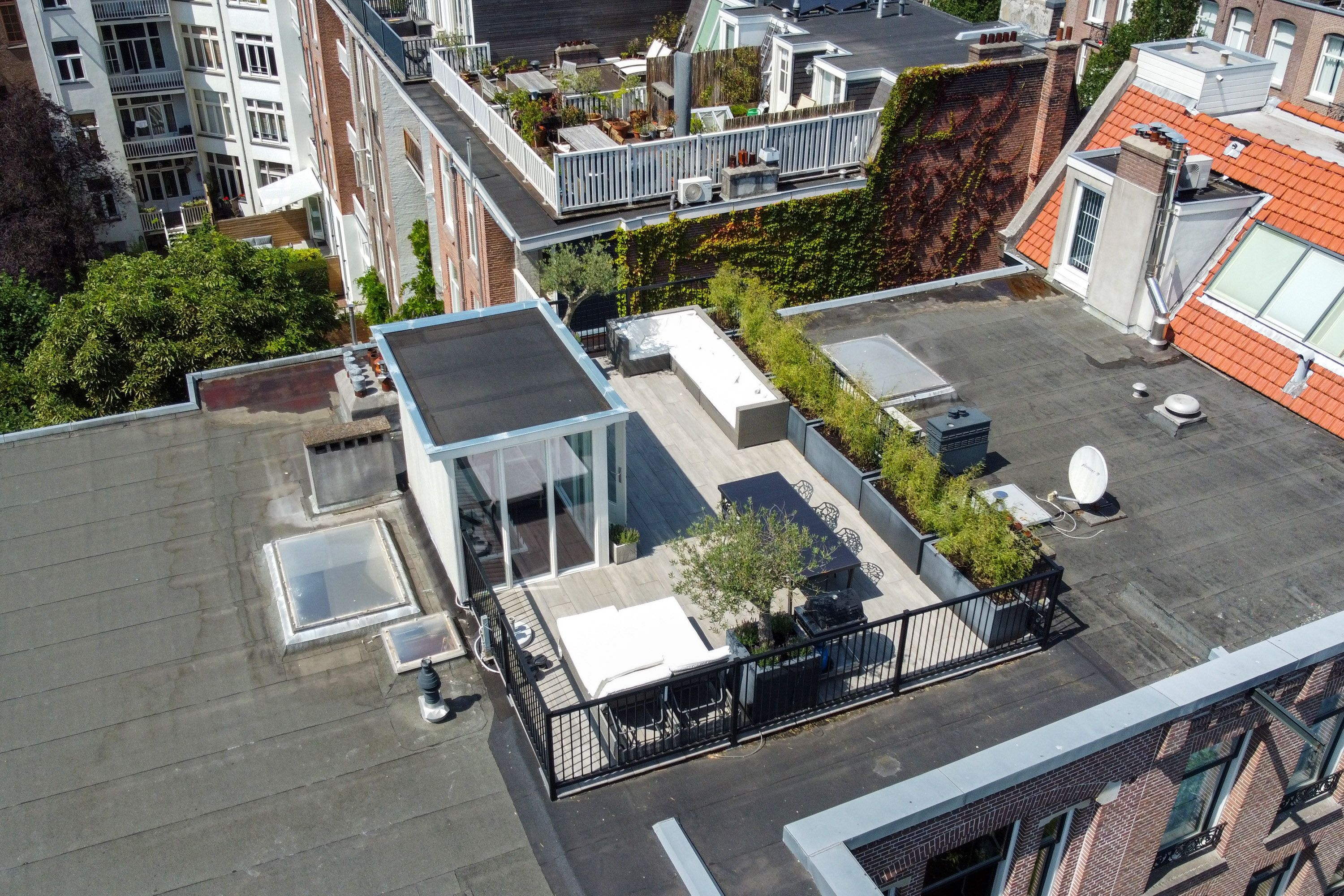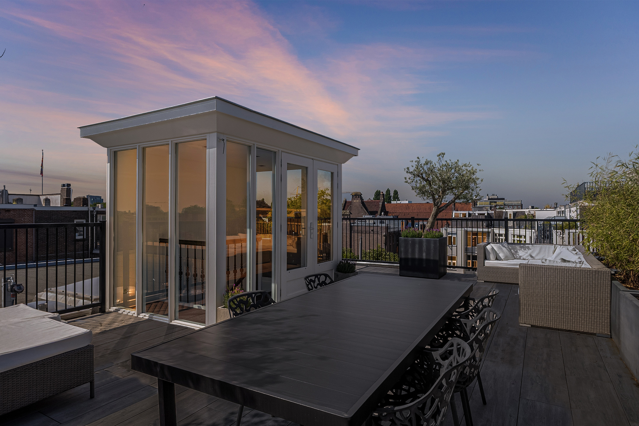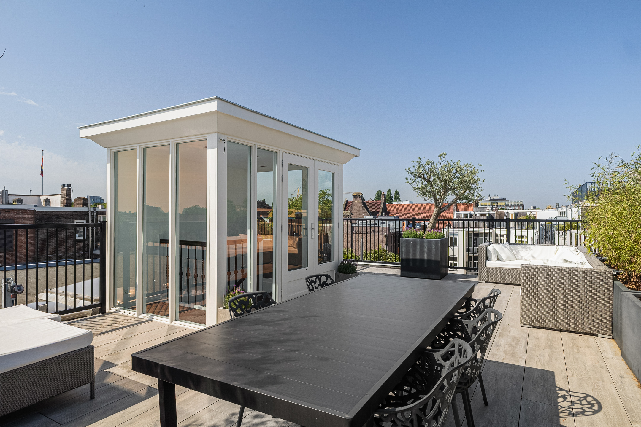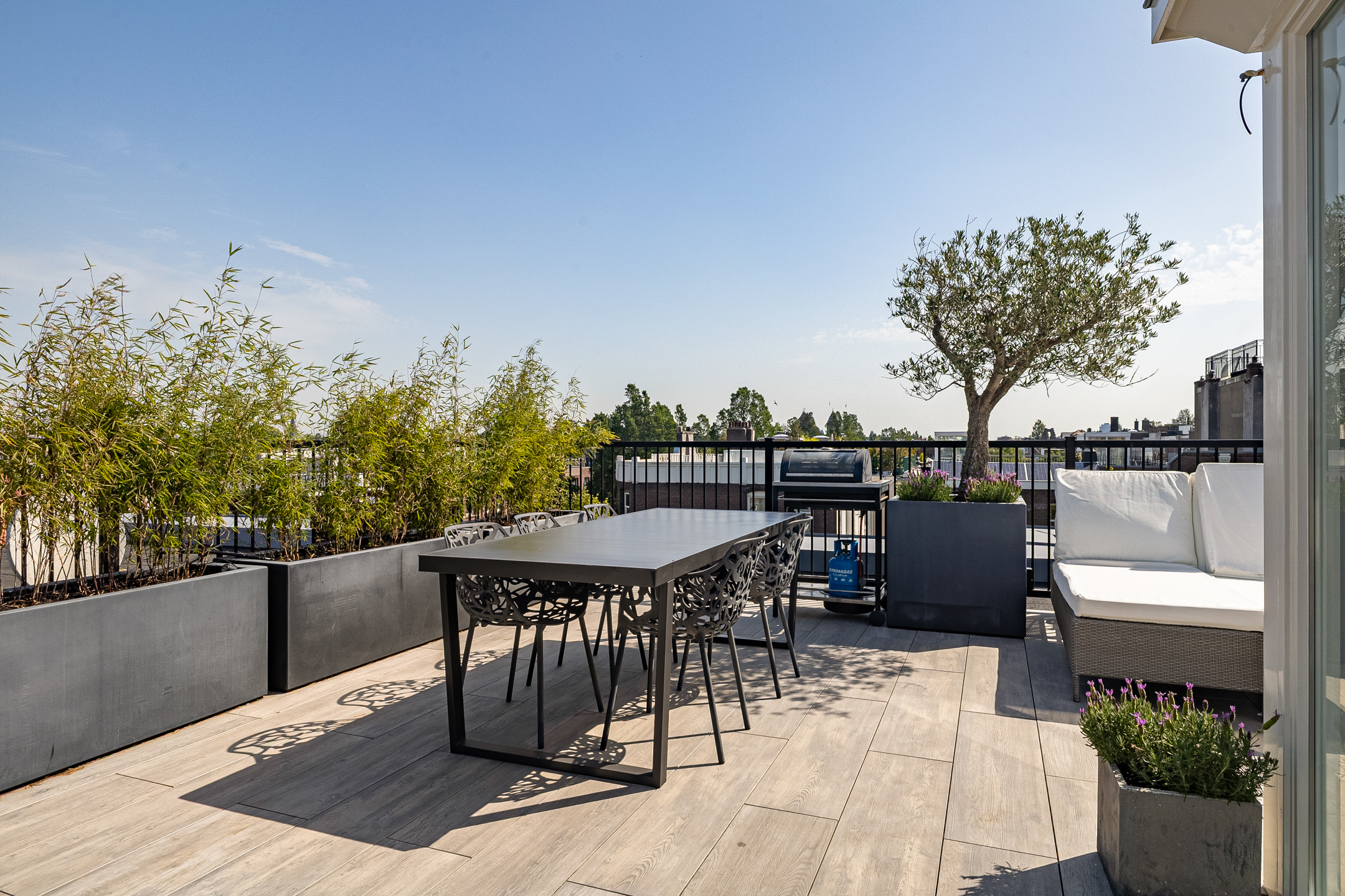 De bovenste verdieping bestaat uit een lichte zolderkamer met directe toegang tot het fenomenale dakterras van ca. 48 m2. Deze buitenruimte biedt volop privacy en een schitterend uitzicht over de daken van Oud-Zuid — de perfecte plek voor een loungehoek of zomerse diners.