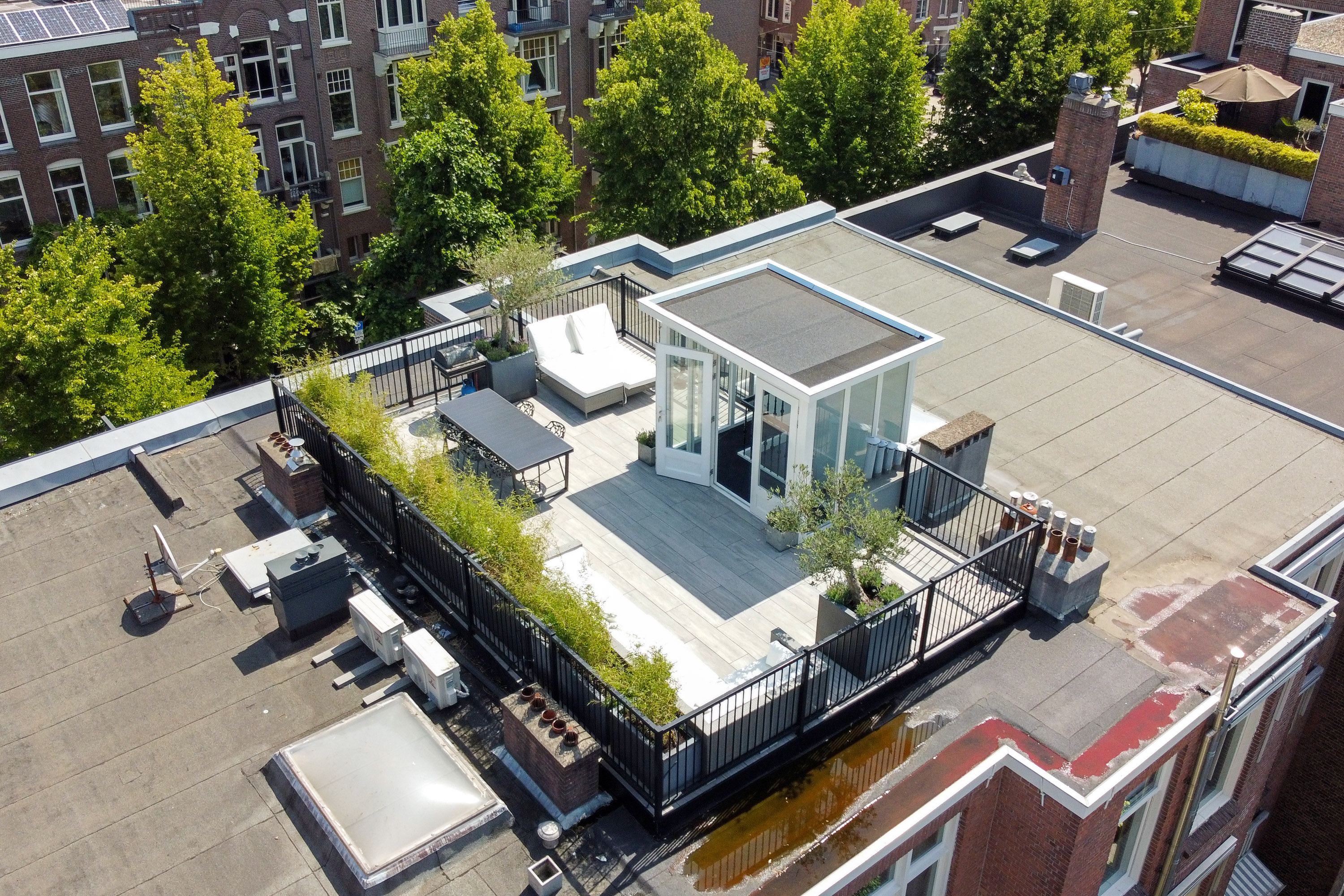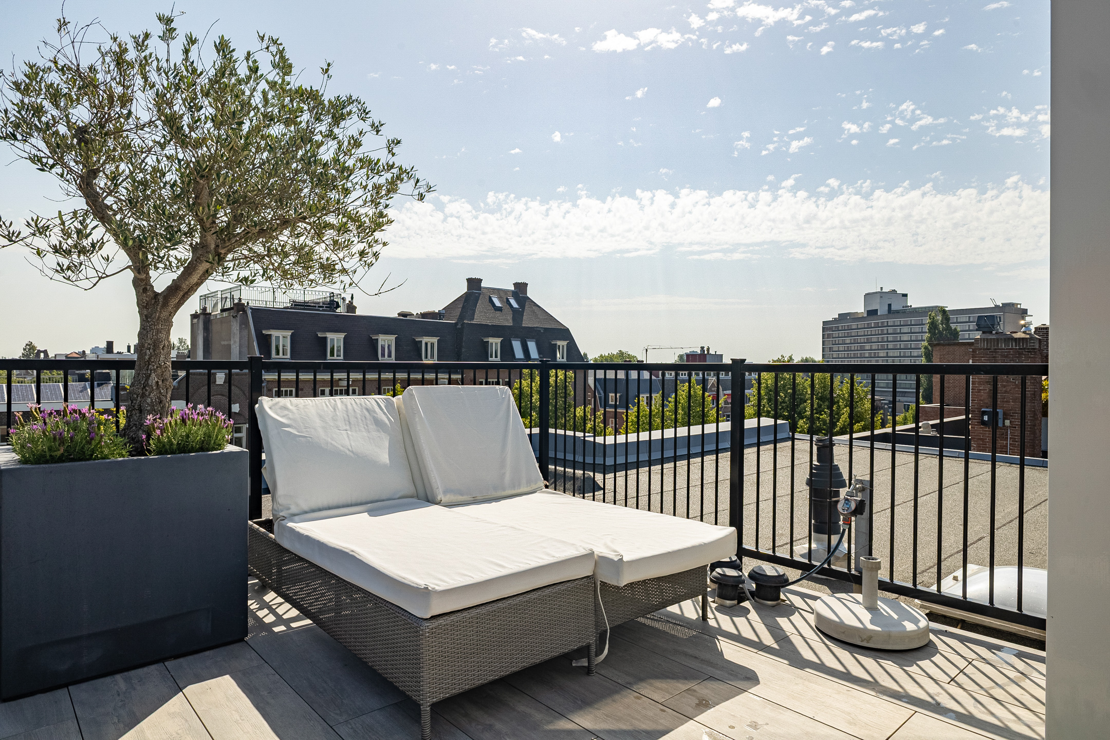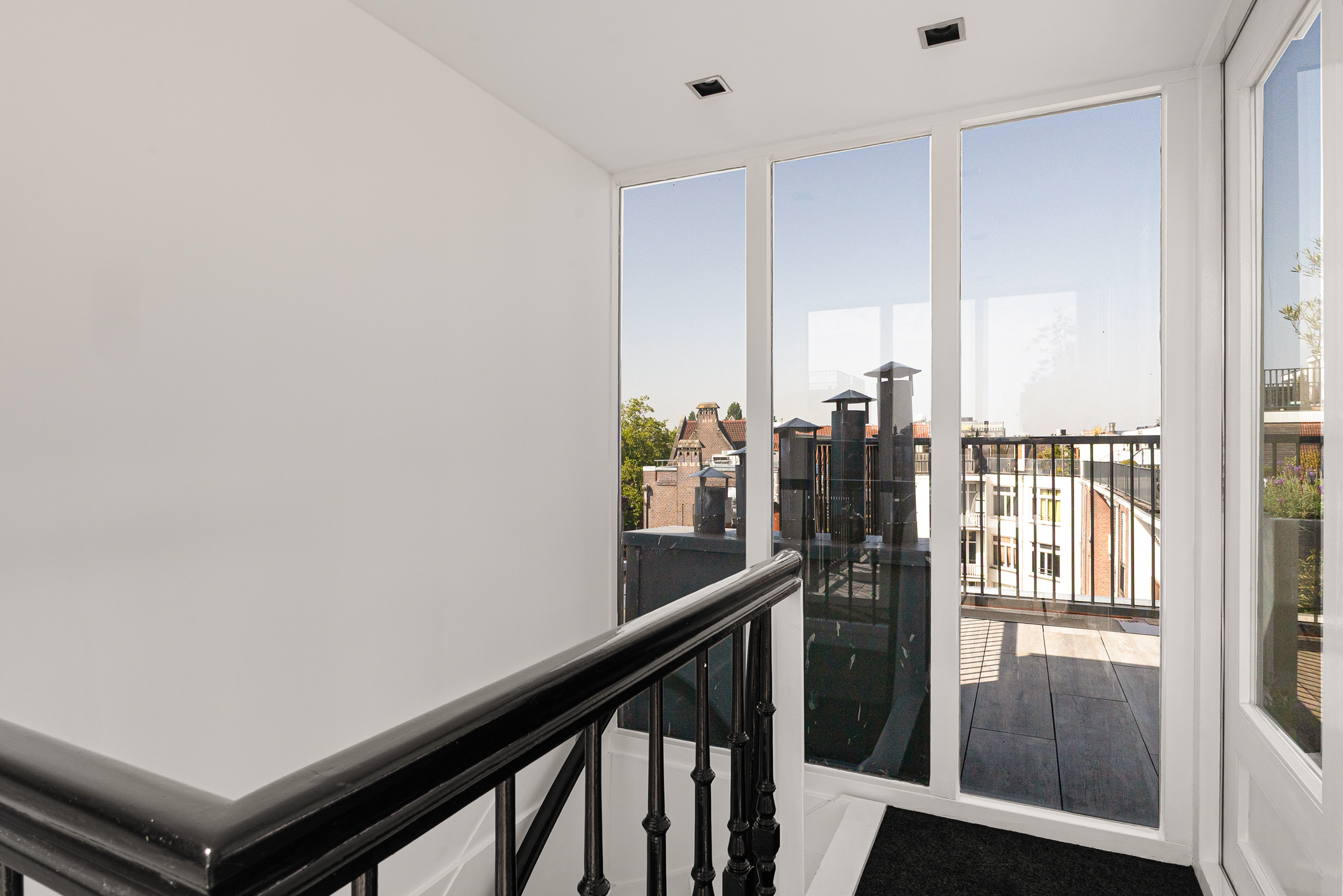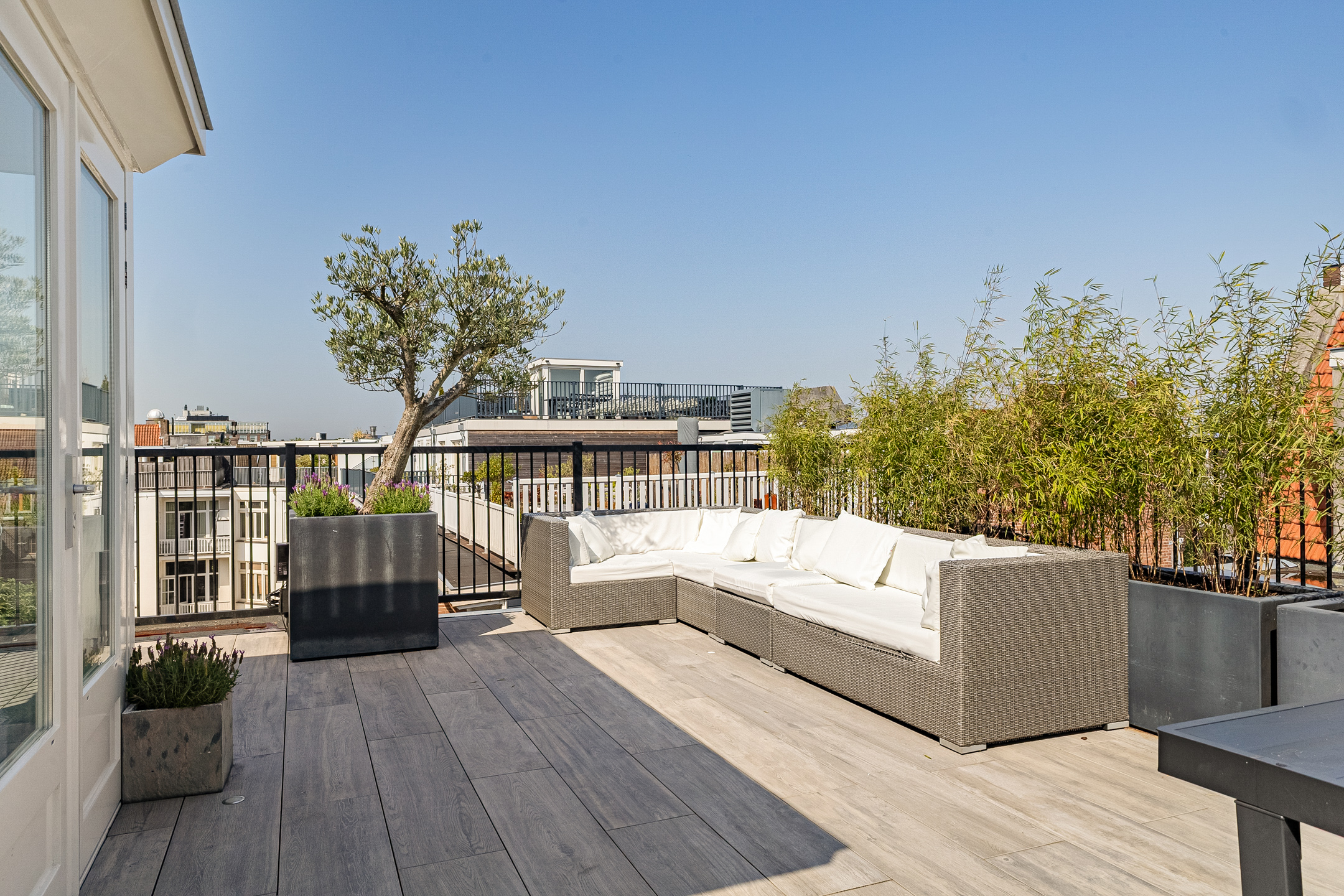 De bovenste verdieping bestaat uit een lichte zolderkamer met directe toegang tot het fenomenale dakterras van ca. 48 m2. Deze buitenruimte biedt volop privacy en een schitterend uitzicht over de daken van Oud-Zuid — de perfecte plek voor een loungehoek of zomerse diners.