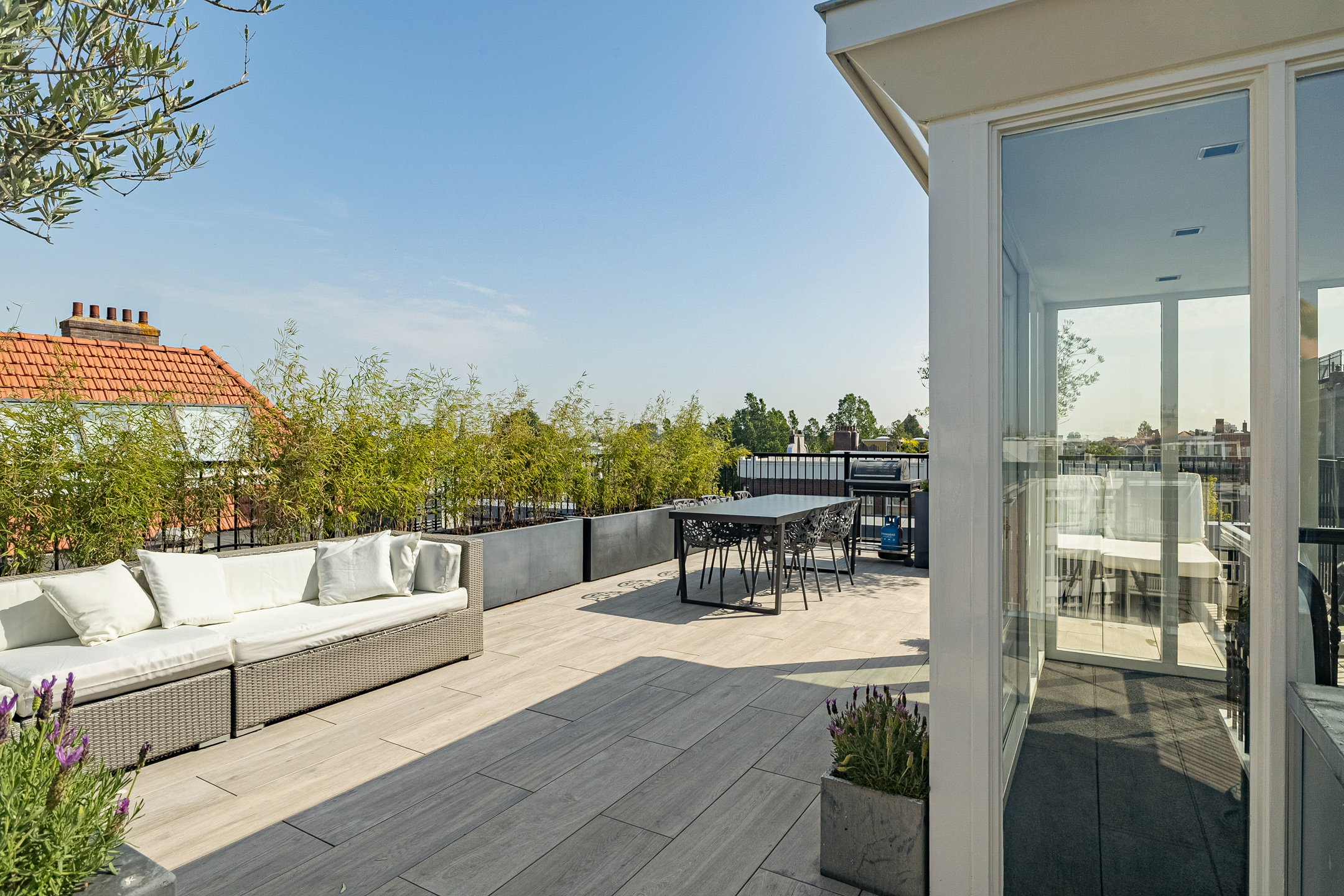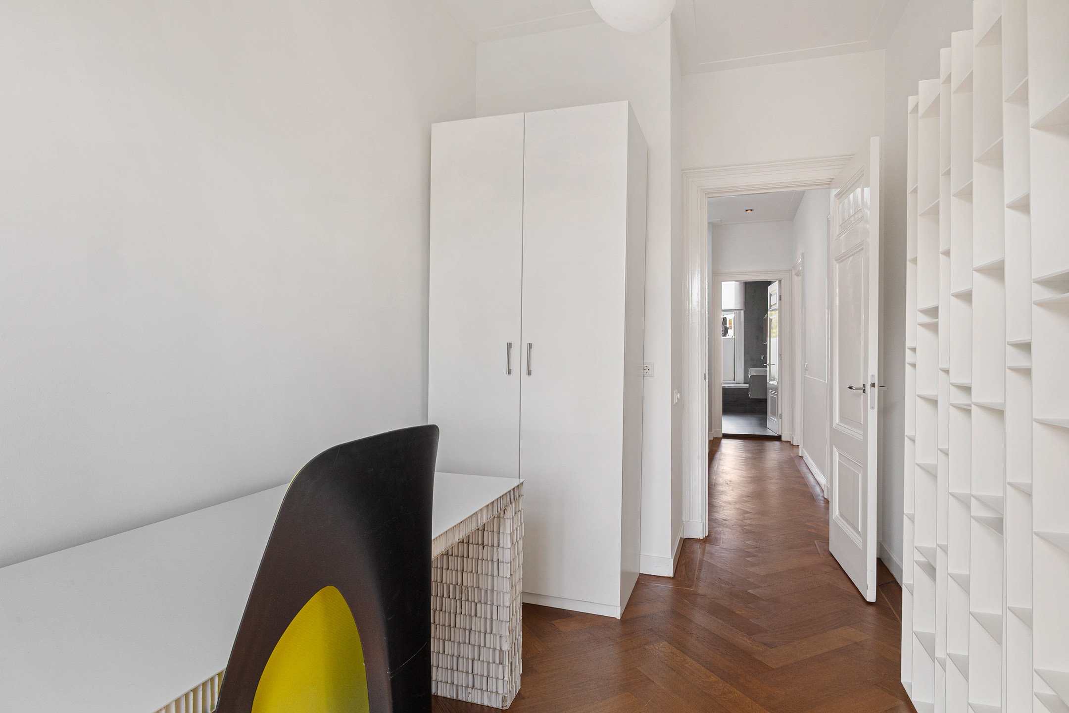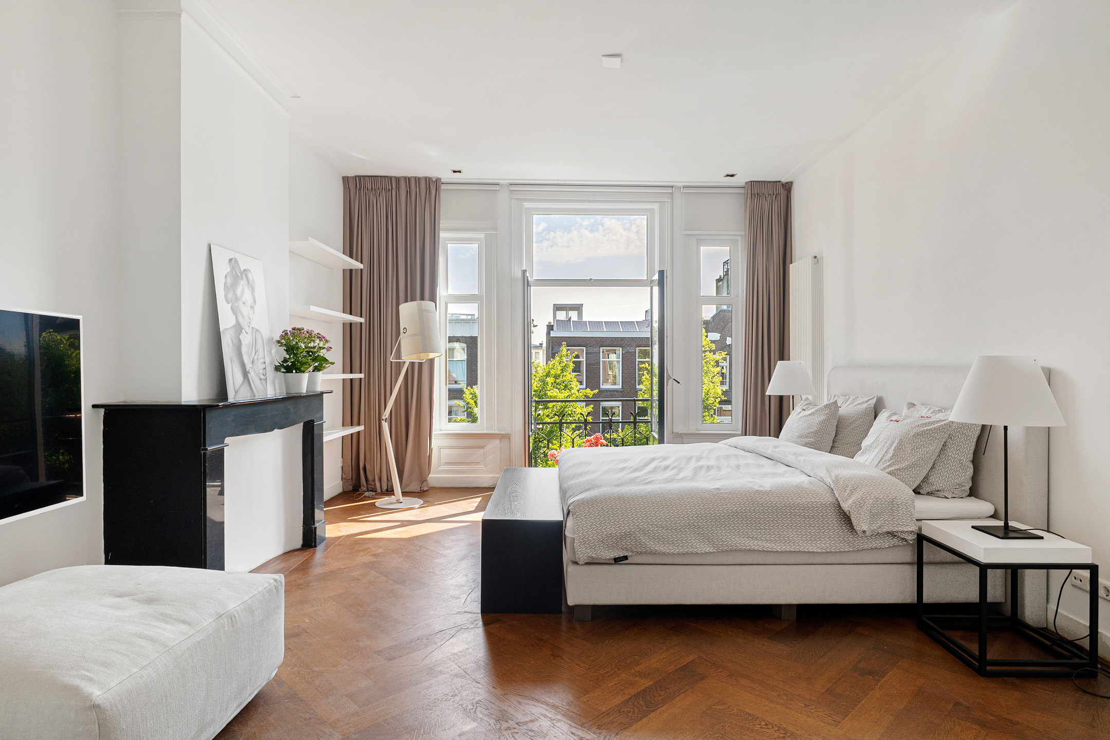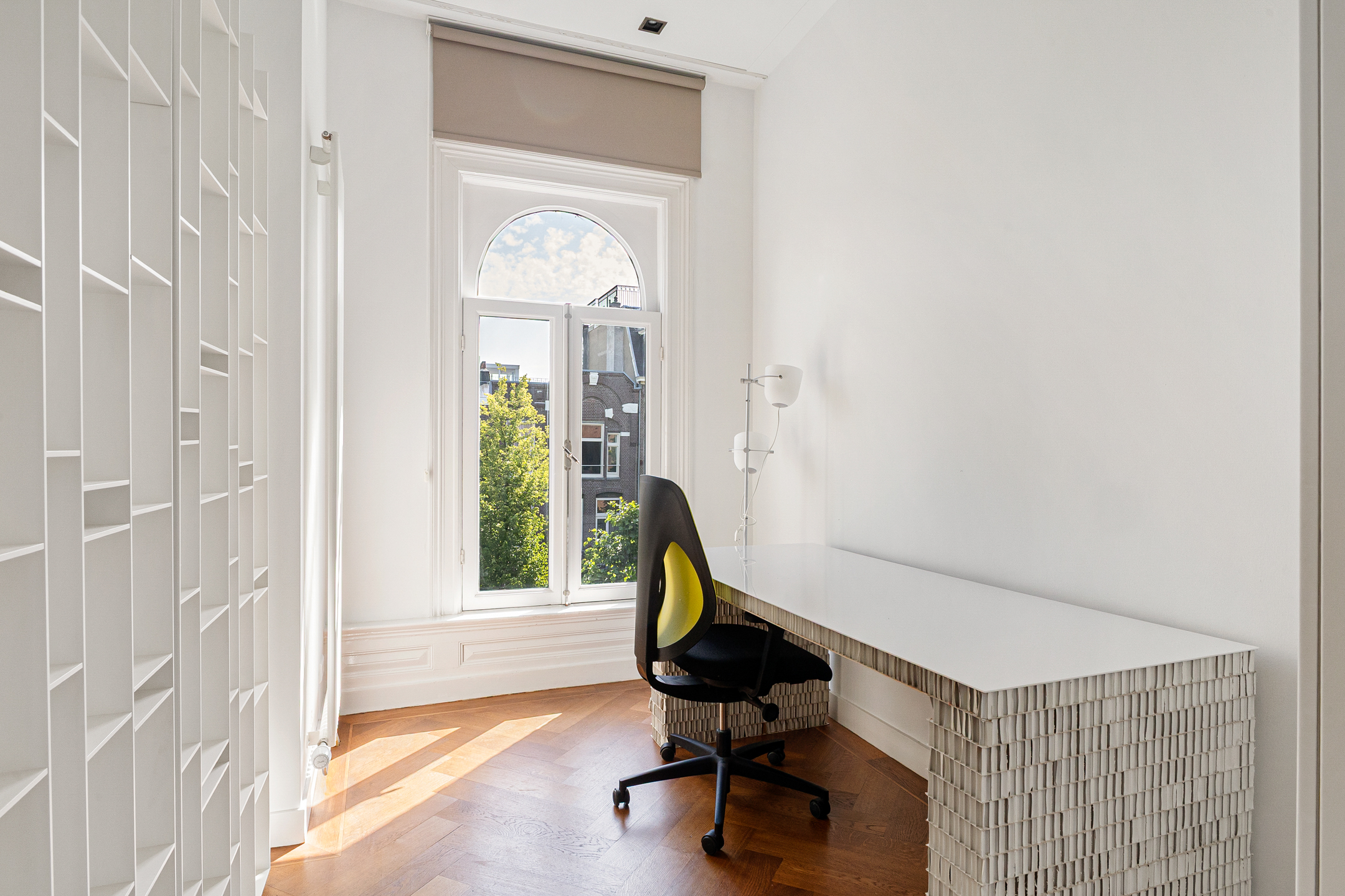 De bovenste verdieping bestaat uit een lichte zolderkamer met directe toegang tot het fenomenale dakterras van ca. 48 m2. Deze buitenruimte biedt volop privacy en een schitterend uitzicht over de daken van Oud-Zuid — de perfecte plek voor een loungehoek of zomerse diners.